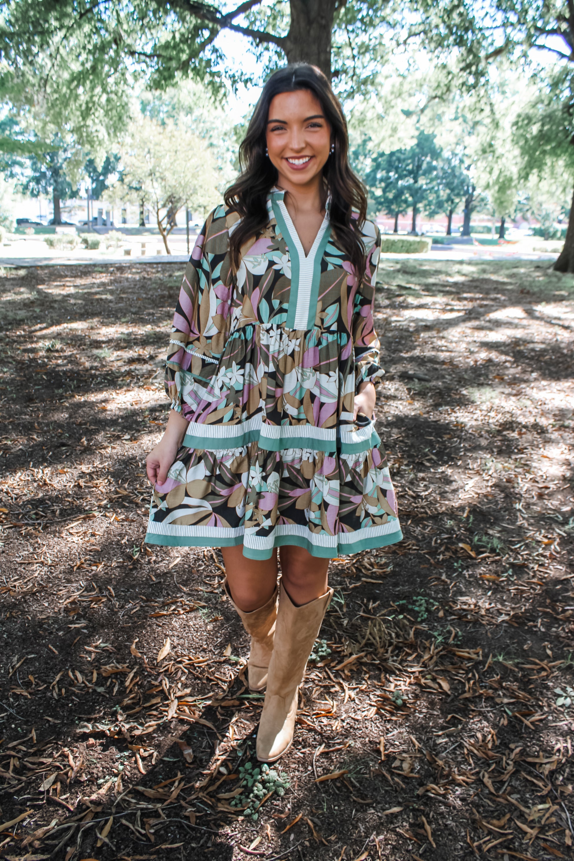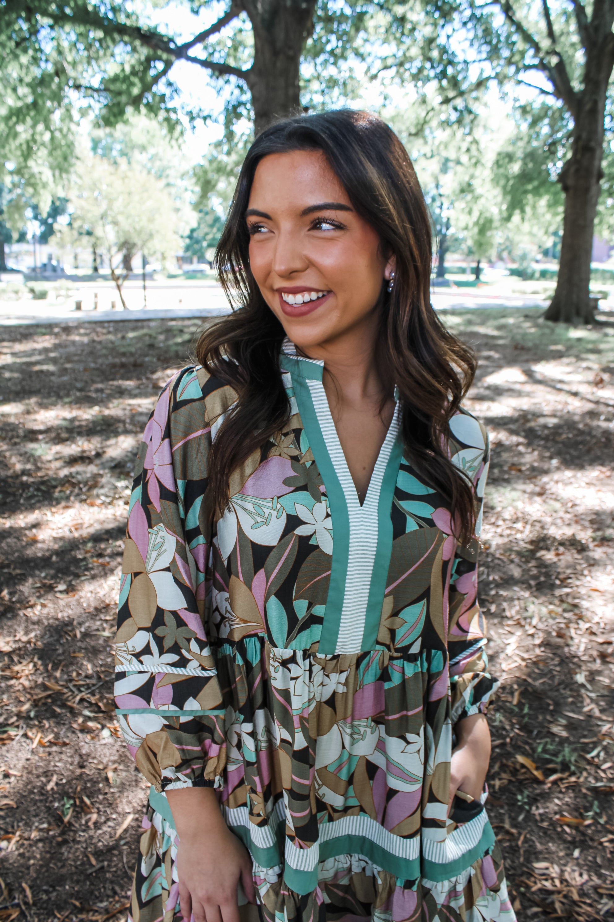 Polished and pretty looks to re-inspire your wardrobe. This sophisticated dress can be dressed up or down, and styled for any time of the year. The striped contrast and piping trim detailing give it an eye-catching flair, while the tiered ruffle silhouette gives it a flowy and flattering fit. With a caftan-inspired neckline, balloon sleeves and oh-so-essential side pockets.
