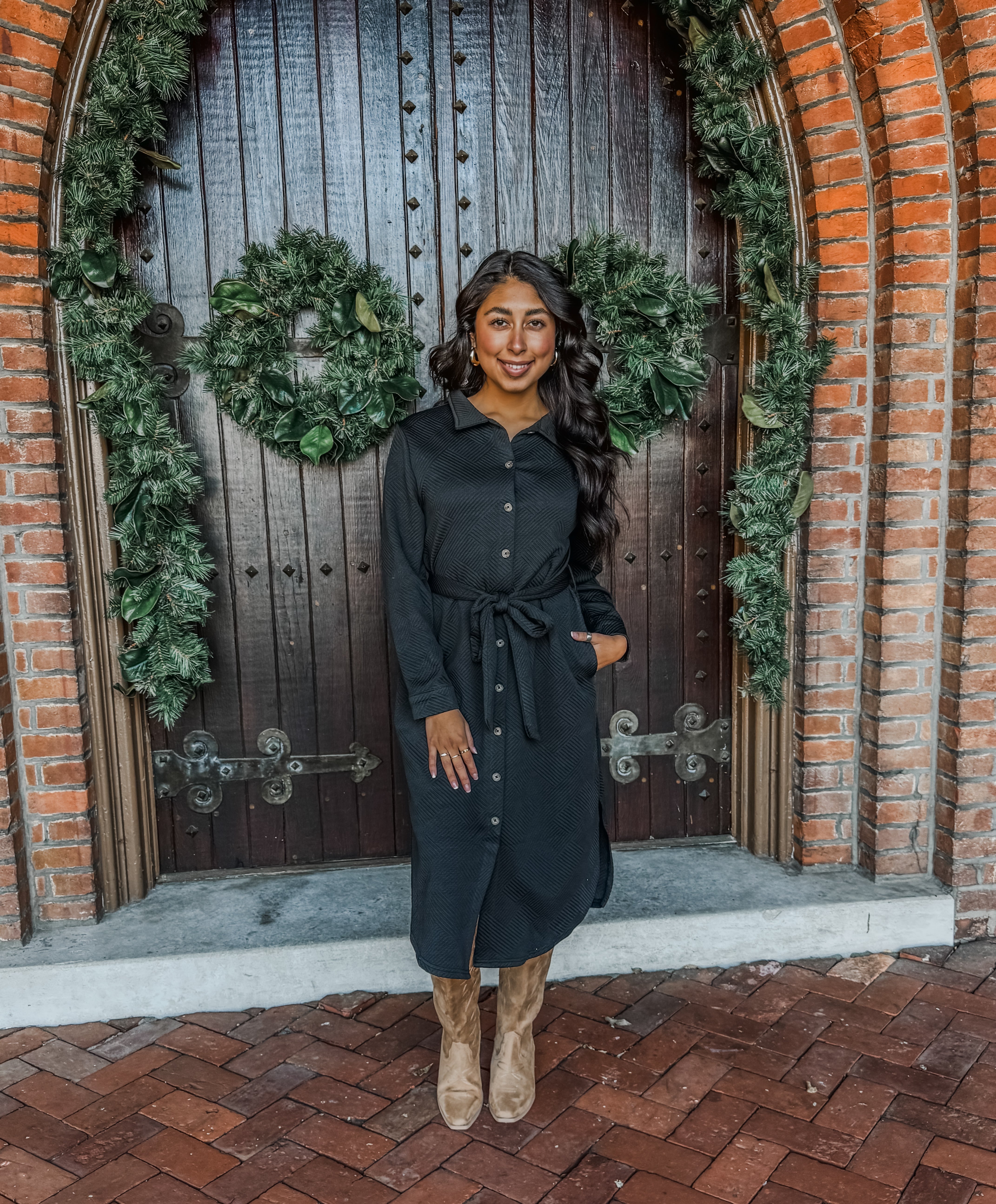 Equal parts current and classic, you can style this shirtdress for the office, family gatherings and special occasions. The embossed pattern knit gives this classic black staple so much texture and character, and the matching sash belt lets you cinch the waist for a customized fit. Featuring a collared neckline, full button front, oh-so-essential side pockets and an a-line silhouette that flatters all. It’s a polished staple you’ll keep reaching for season after season.