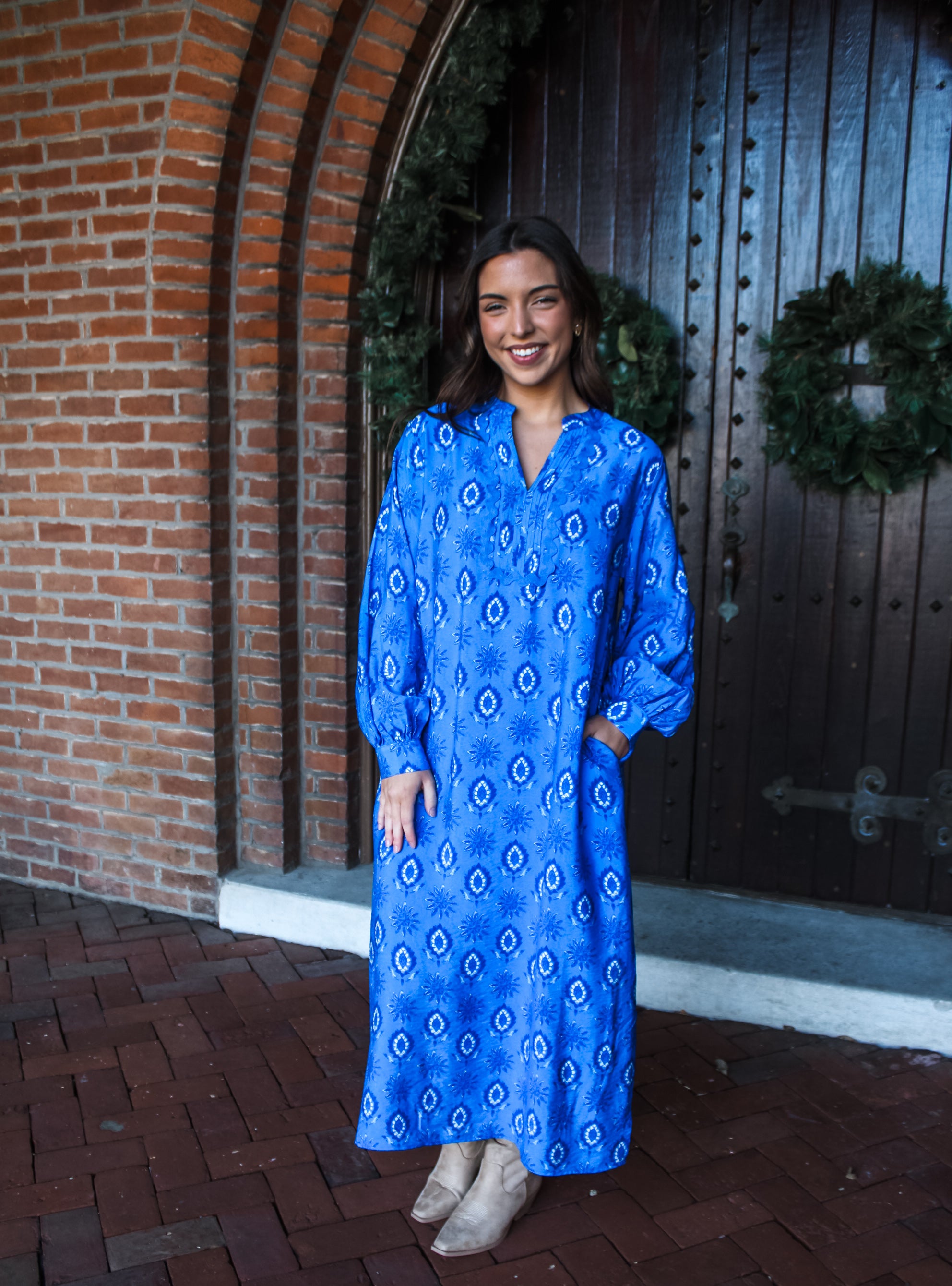 Make a style statement at any occasion. This eye-catching maxi is a versatile look whether you’re celebrating special events, going on an island getaway, or having weekend brunch with friends. Crafted in a beautifully textured woven, with pleat details and ric rac trim on the neckline, lantern sleeves, oh-so-essential side pockets and a flowy straight silhouette.