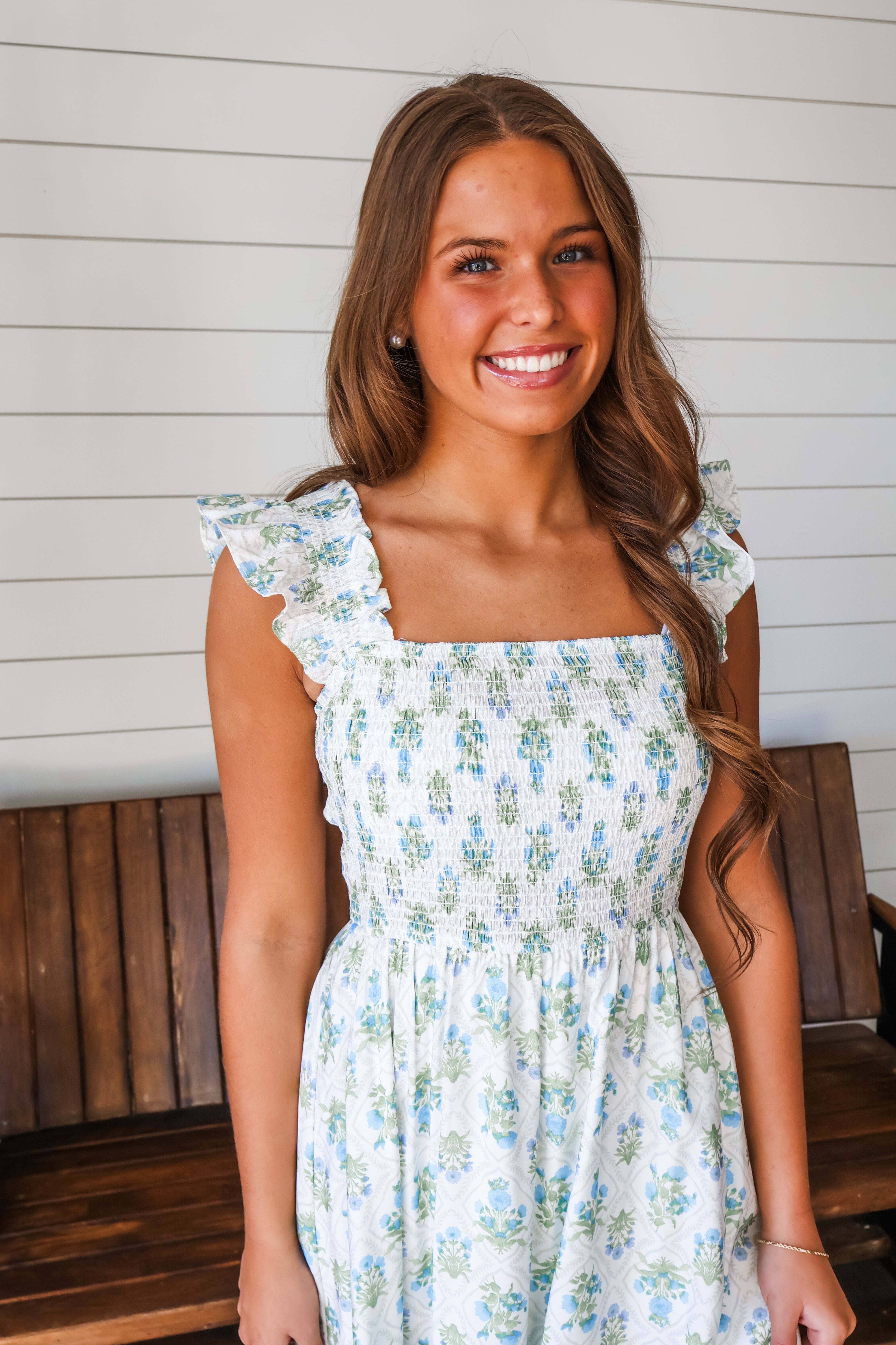 Romantic florals and feminine silhouettes to refresh your spring style. This pretty midi dress is crafted from a beautifully textured woven with a smocked bodice, stretch ruffle straps and a flowy hem. It’s a sweet and sophisticated style whether you’re attending springtime events, taking a stroll downtown, or packing for a girls’ getaway.