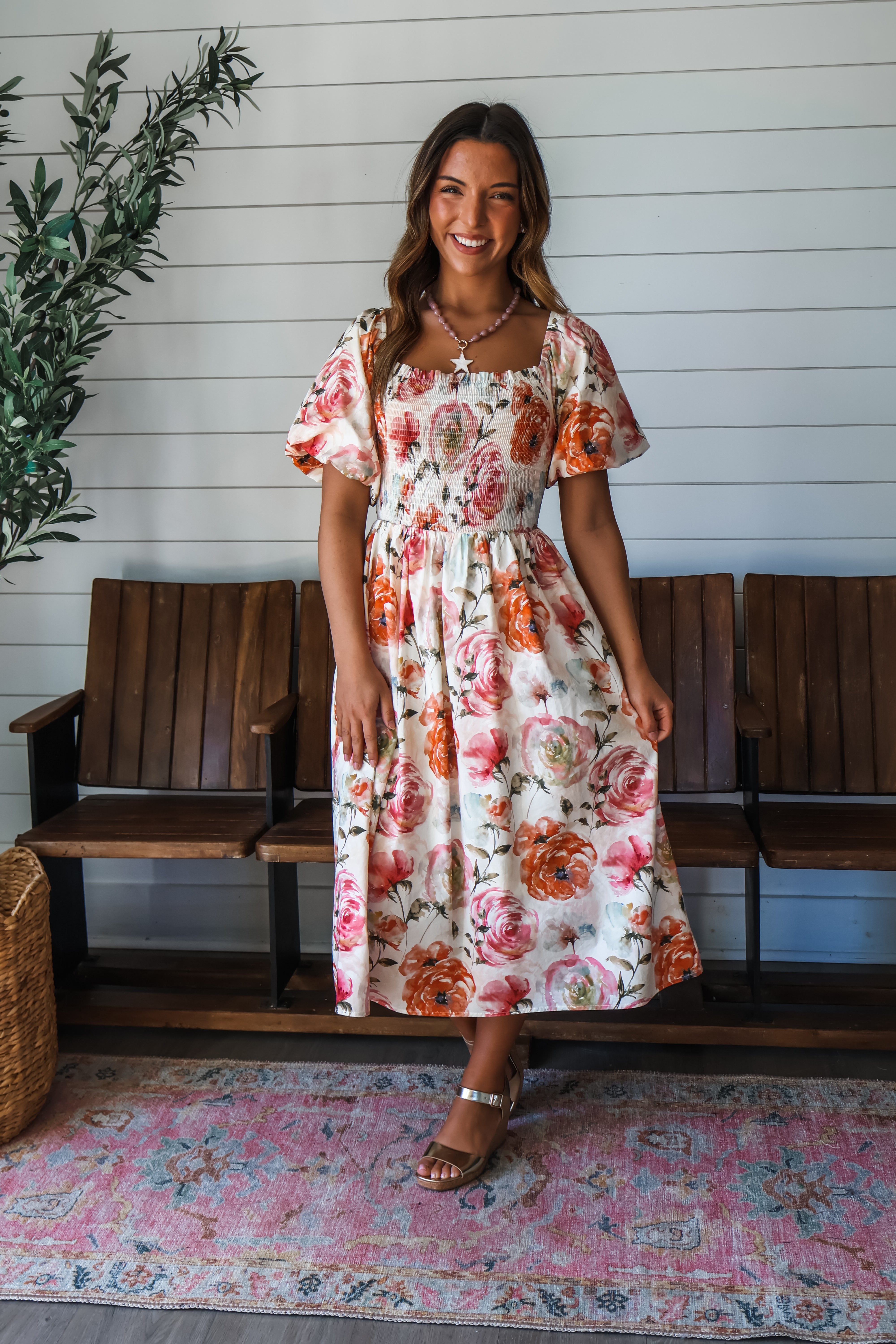 If spring were a dress, it would be this one . This beautiful floral dress will make you feel like you’re on cloud 9. It fits tts. Fitted through the bodice. Full skirt. Model is wearing the small and is 5”5. Small 0-4 medium 6-8 large 10-12. Also available in curvy sizes.