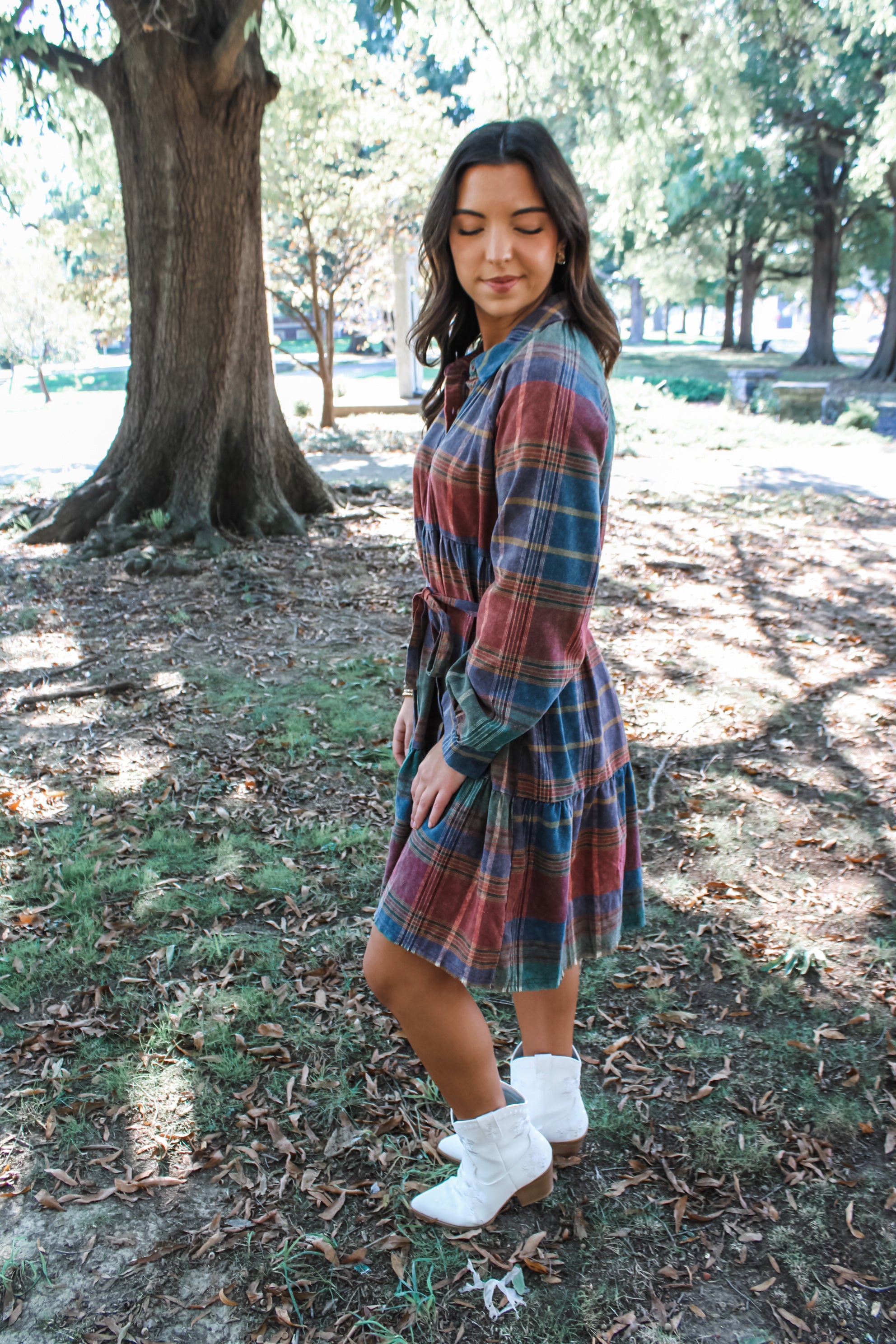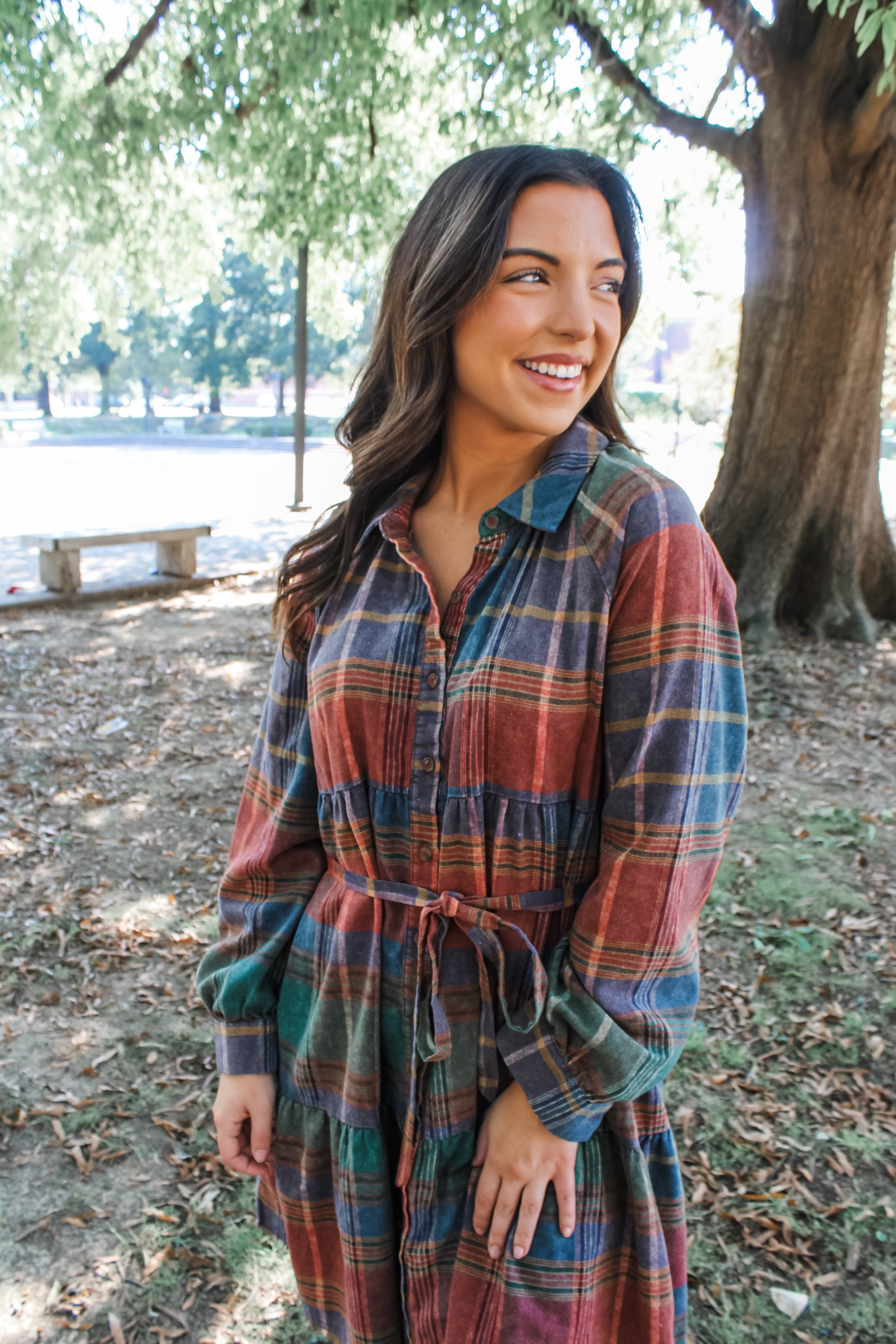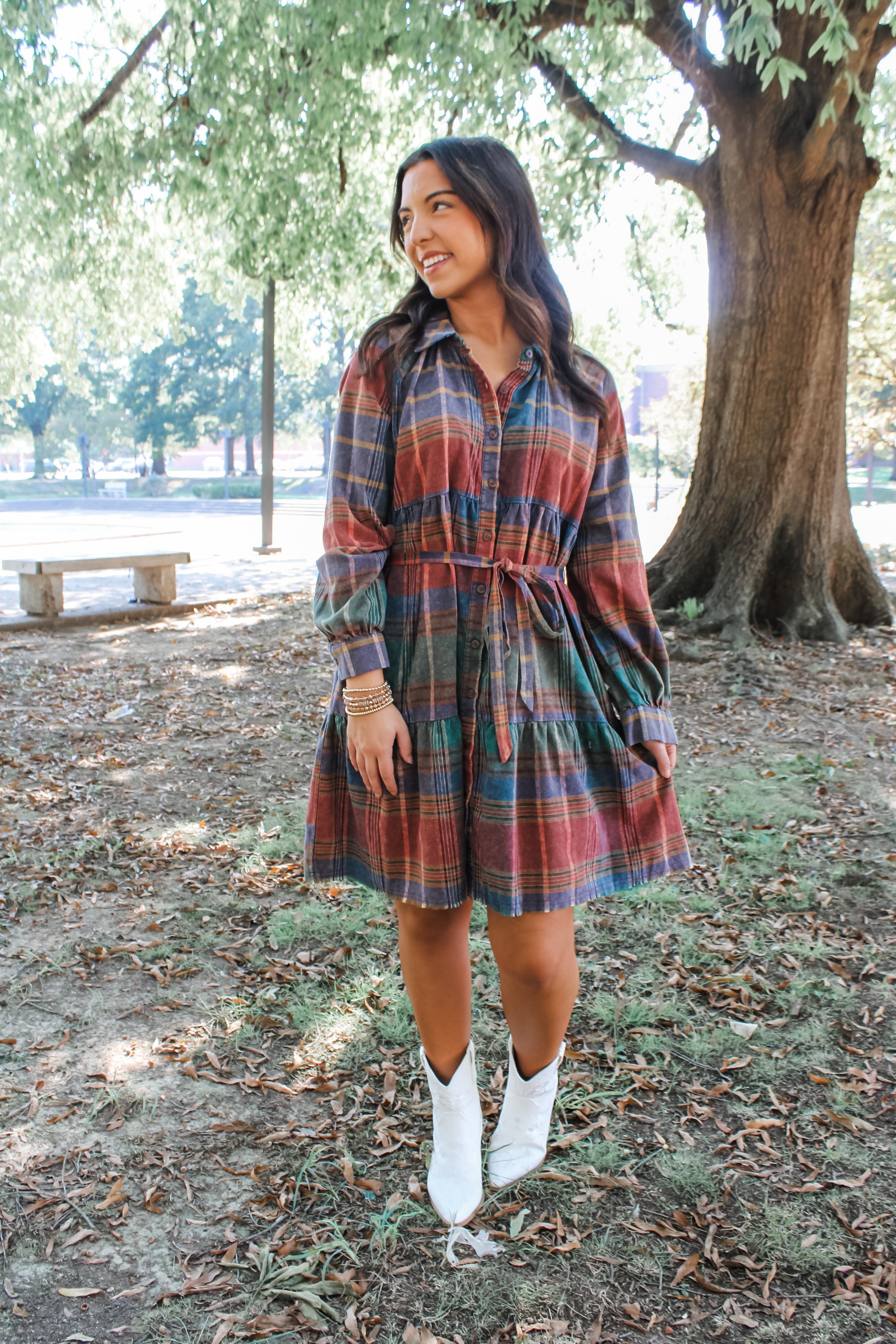Think feminine silhouettes and quintessential plaid for a chic fall style. This charming beauty is featured in a flattering a-line silhouette that can be cinched at the waist with the matching sash belt. Featuring a collared neckline, button front, raglan sleeves and a ruffle trim hem.