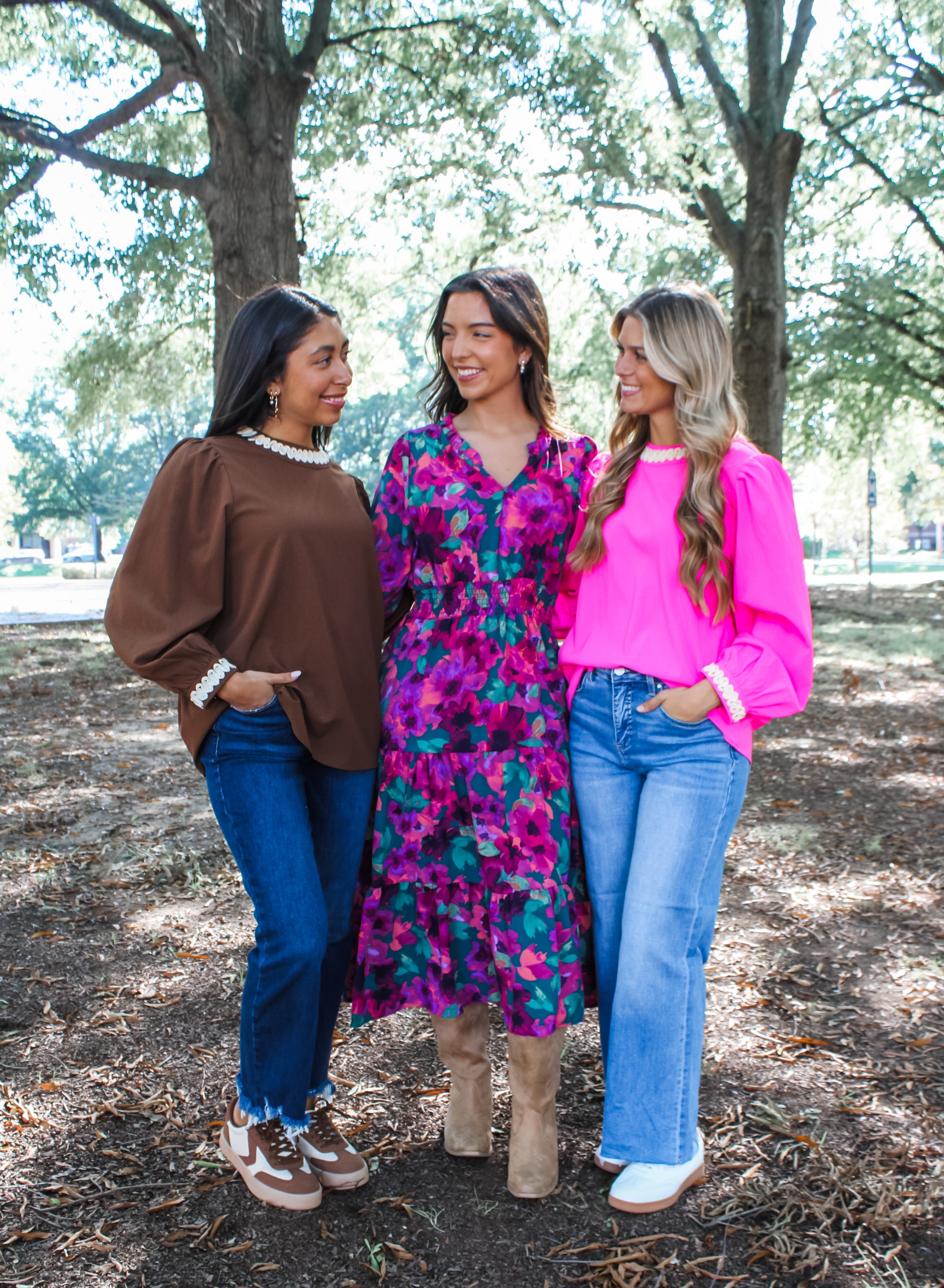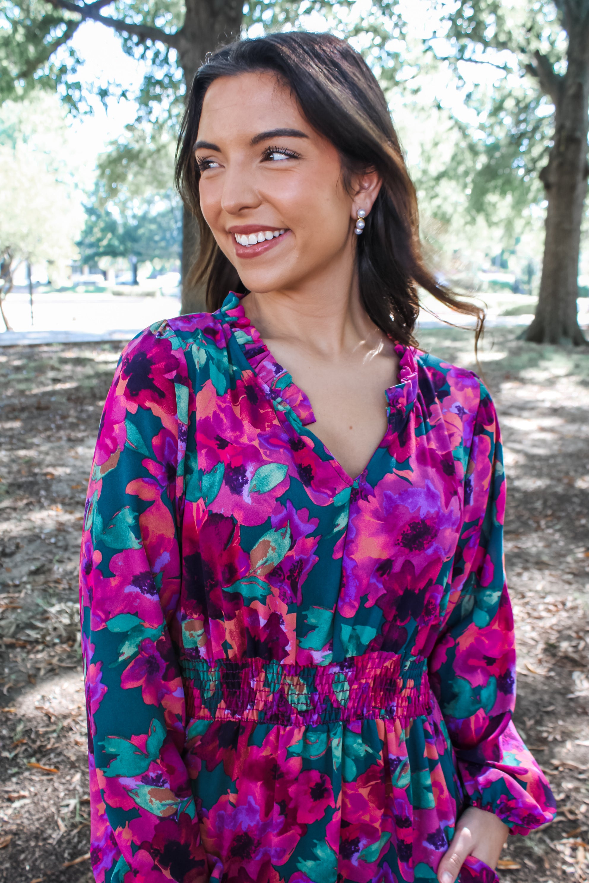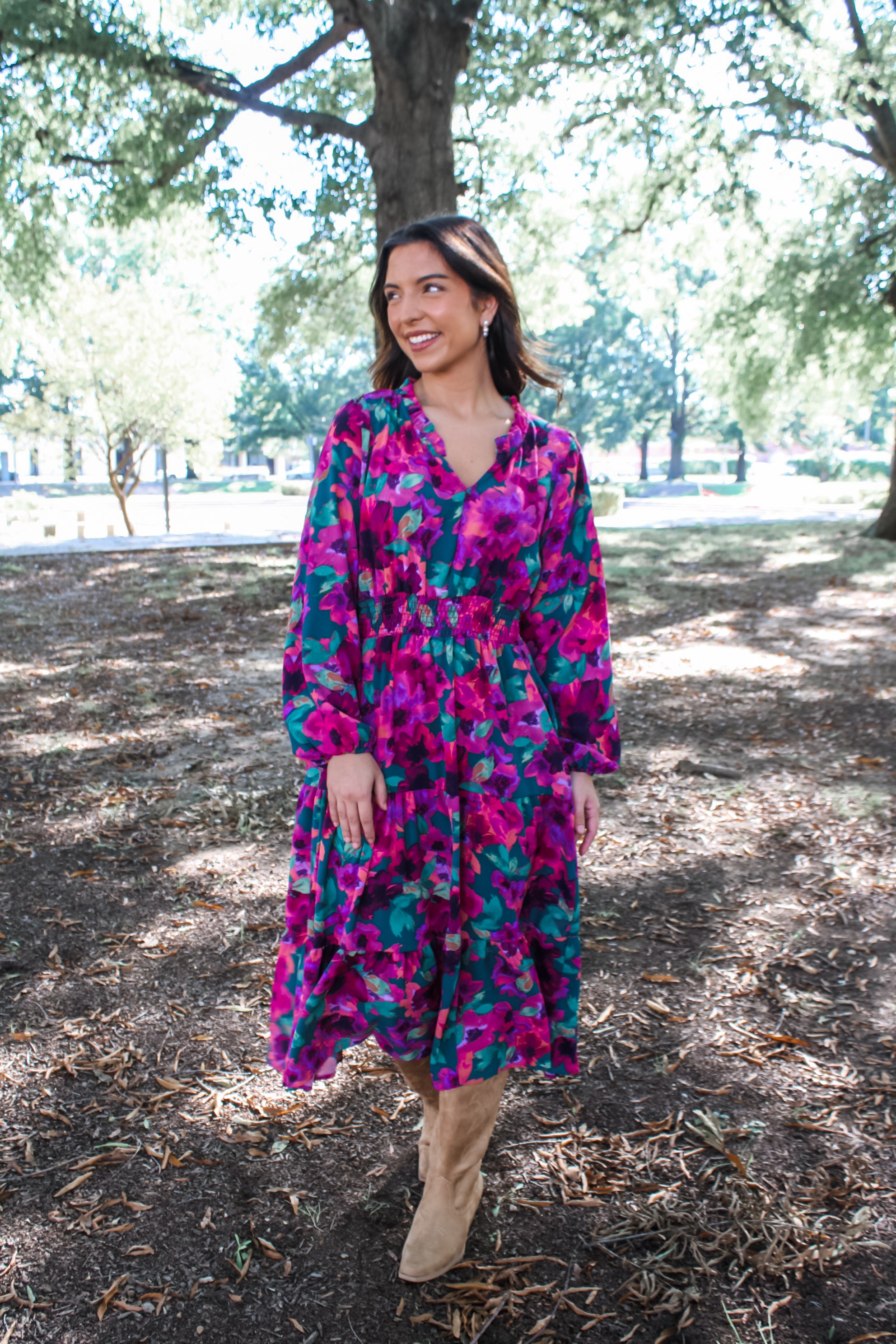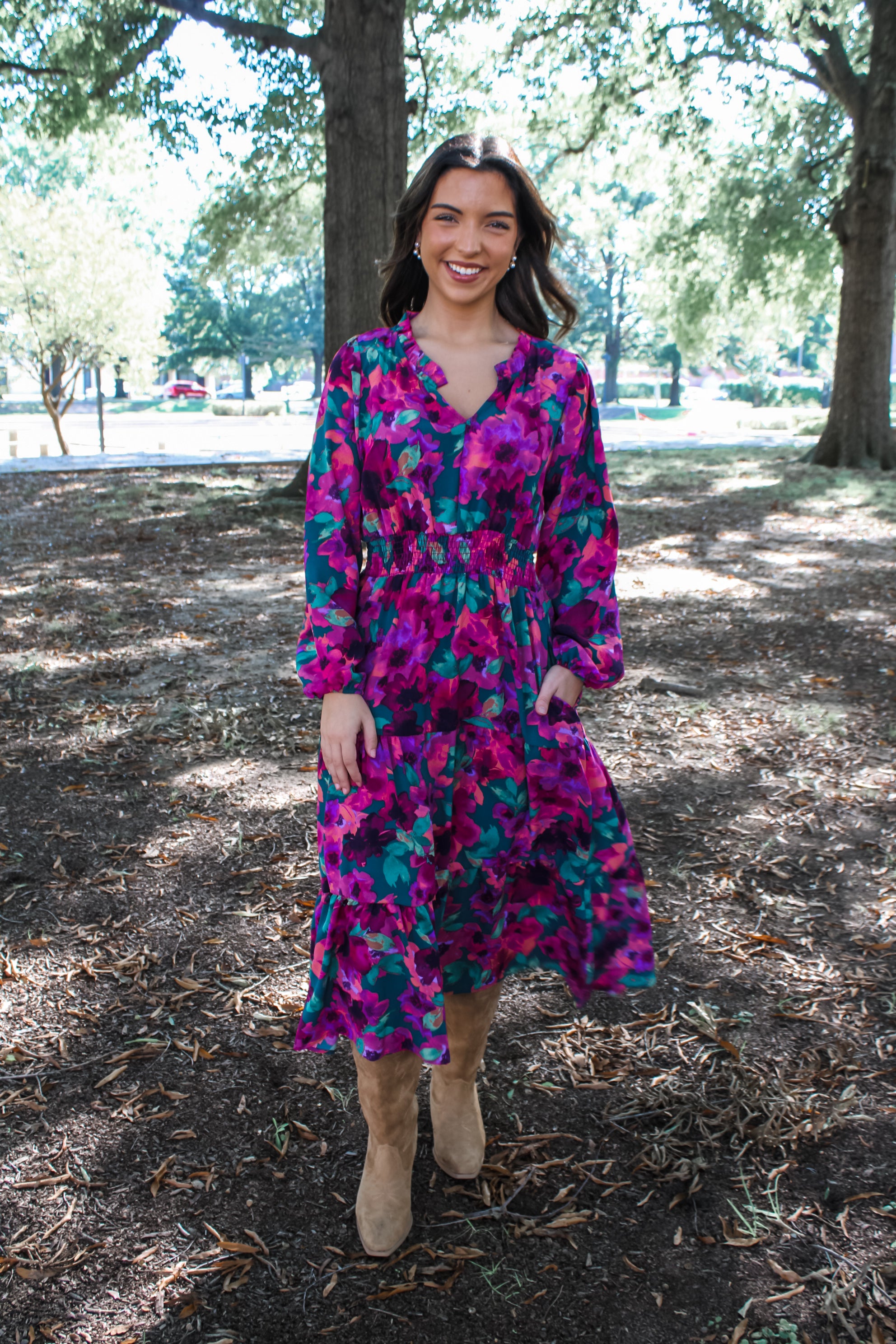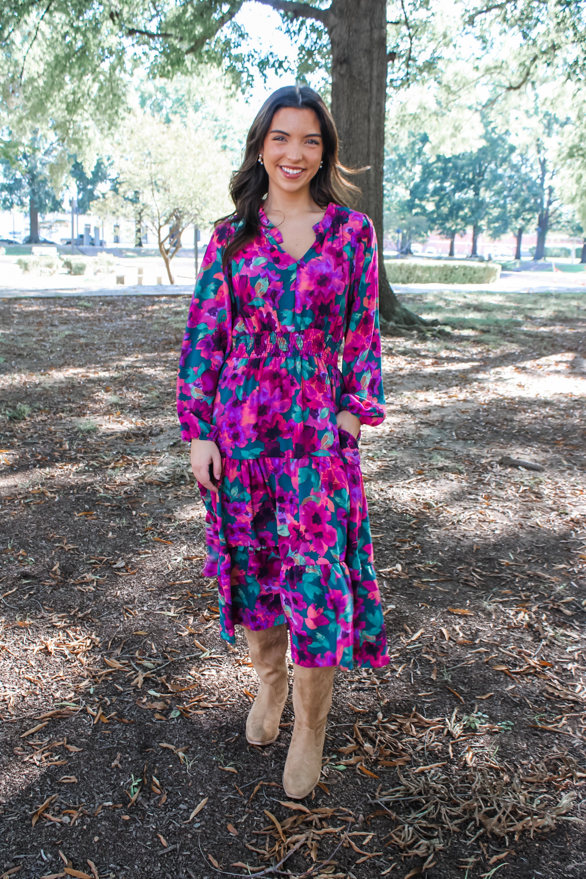 Step into fall with a statement-making midi! The ruffle trim neckline and balloon sleeves give it a romantic flair, while classic a-line silhouette and tiered hem ensures a flattering fit. Featuring a v-neckline, smock waist and oh-so-essential side pockets. With rich colors and a bold floral print, this dress will turn heads with every wear.