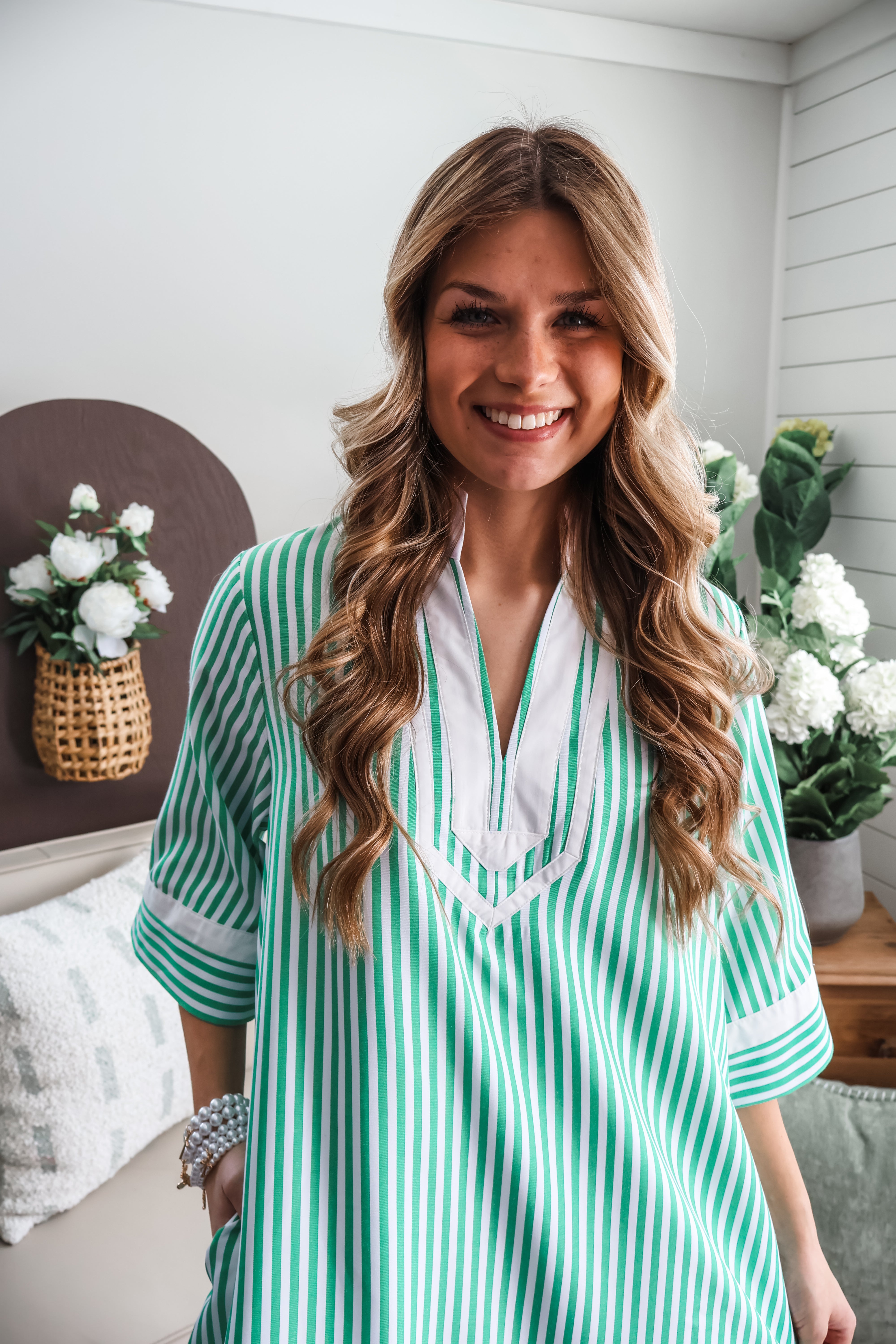 Classic stripes re-imagined. A chic combination of a quintessential print and trending details, this mini dress is an effortless look whether you’re headed to the office or a resort getaway. Crafted from a textured woven, it features a caftan-inspired neckline with contrast trim detailing, elbow length sleeves and side pockets. The classic a-line silhouette gives it a flowy fit that’s easy and flattering.