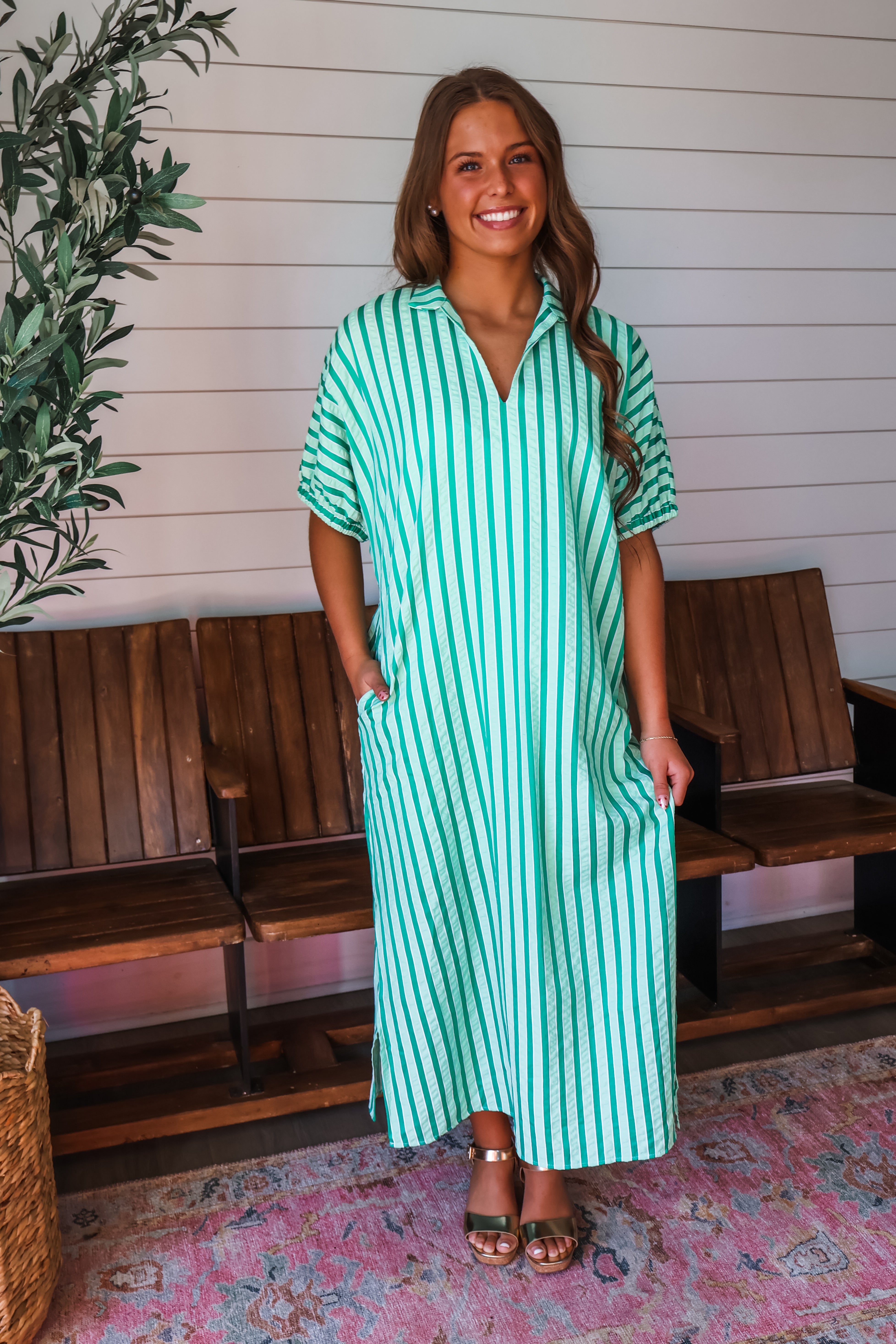 Make a stylish statement in bold stripes!  This seersucker maxi dress is an effortlessly elevated style whether you’re attending springtime events, meeting up for Sunday brunch, or packing for a resort getaway. Featuring a standing collar v-neckline, gathered dolman sleeves and oh-so-essential side pockets. The simple straight silhouette and side slit hem provides an easy and flattering fit that moves with you.