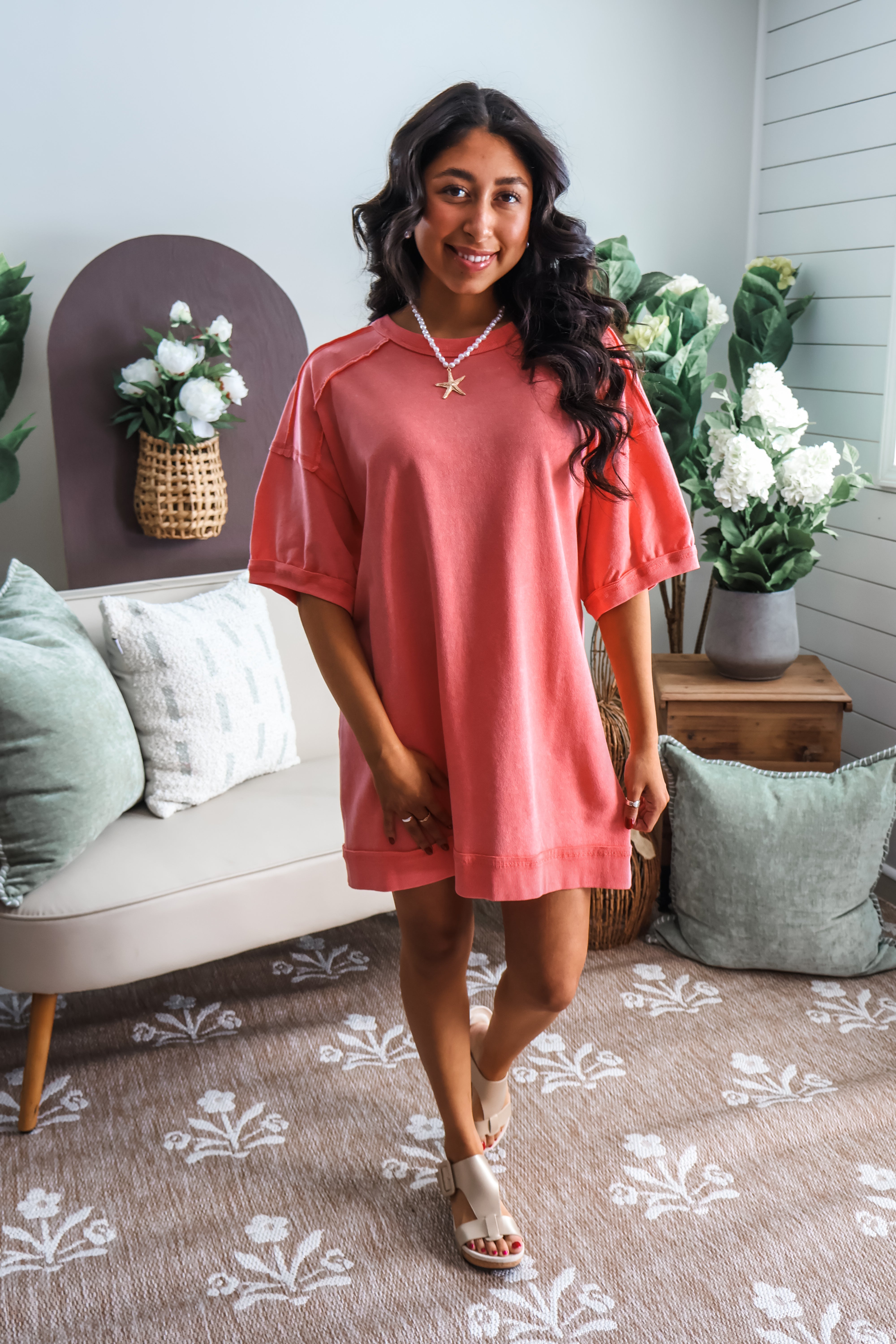 This t-shirt dress makes an effortless style statement that’s perfect for sunny days! Crafted from a mineral washed knit for that soft and sunwashed look with an easy and flattering straight silhouette. Featuring a crew neckline, drop shoulder sleeves, exposed seaming details and a rib contrast hem.