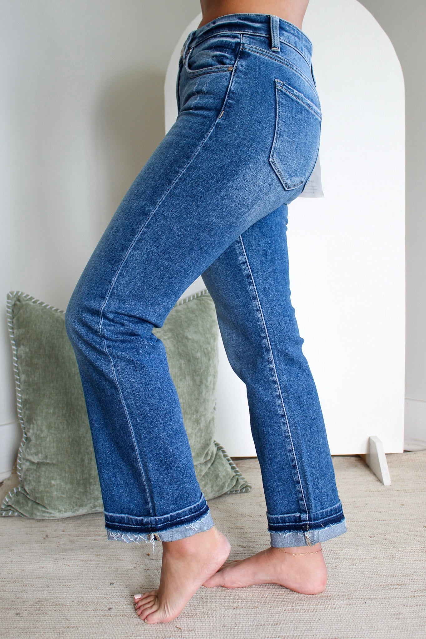 Size + fit: Sits above the waistline with classic 5-pocket design, single-button front, and zip-fly closure. 28“ inseam with 2” cuff, Risen. 93% Cotton, 5% Polyester, 2% Spandex. Model is 5’5” and wears 03.