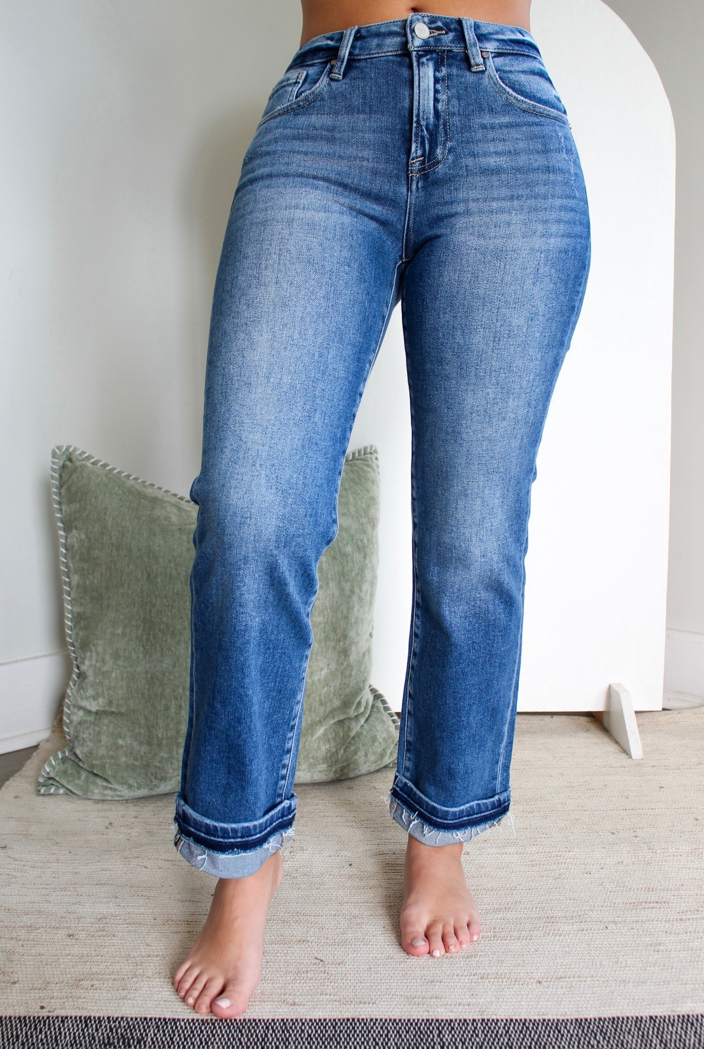 Complement your wardrobe with a pair of cool denim. Our Axel Straight Leg Jean comes in a timeless non-distress medium wash for a staple style you can wear with any top, while the cuffed shadow hem adds just enough interest and flair. With whiskering, fading, contrast stitching and subtle distress details.
