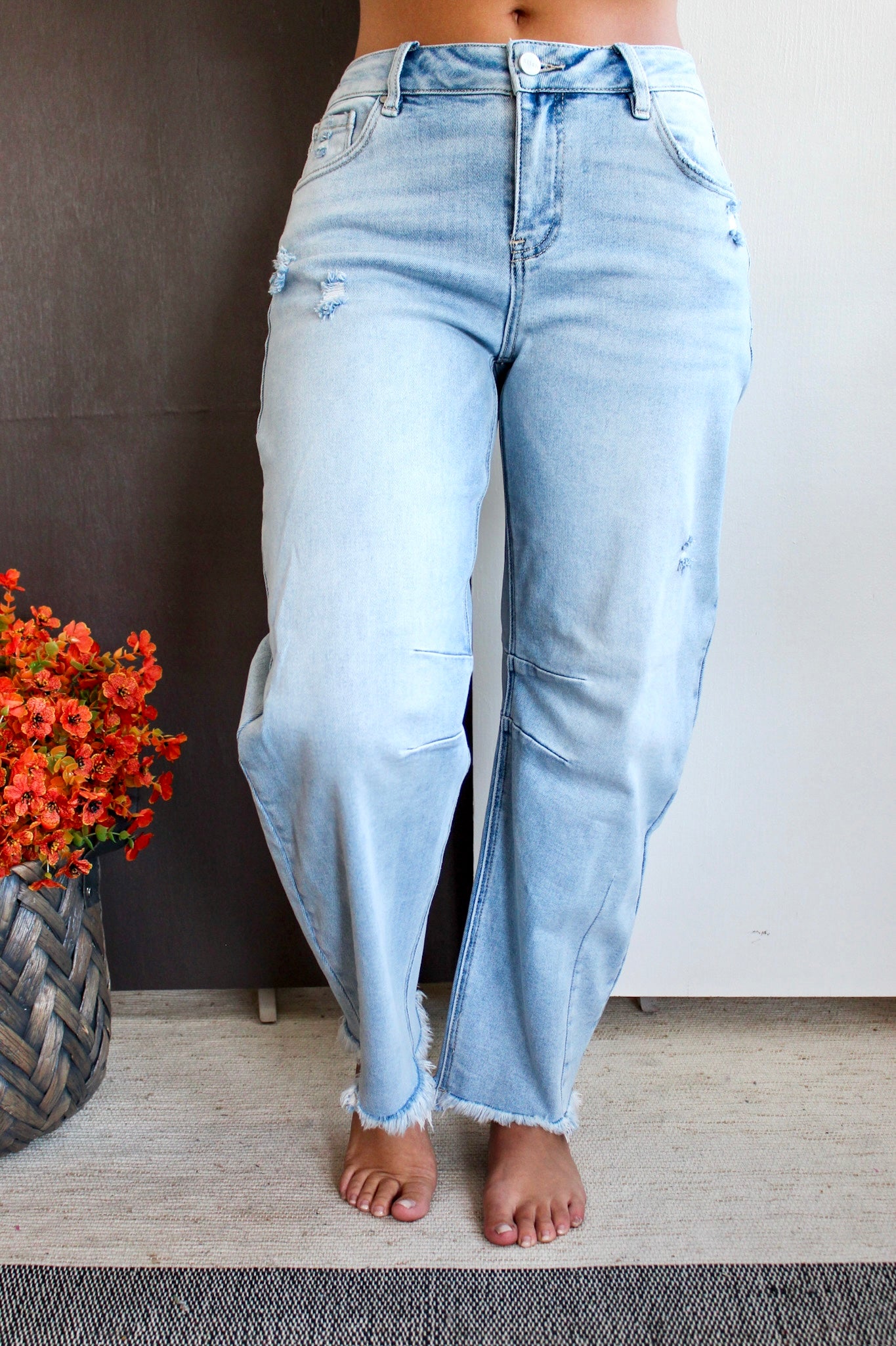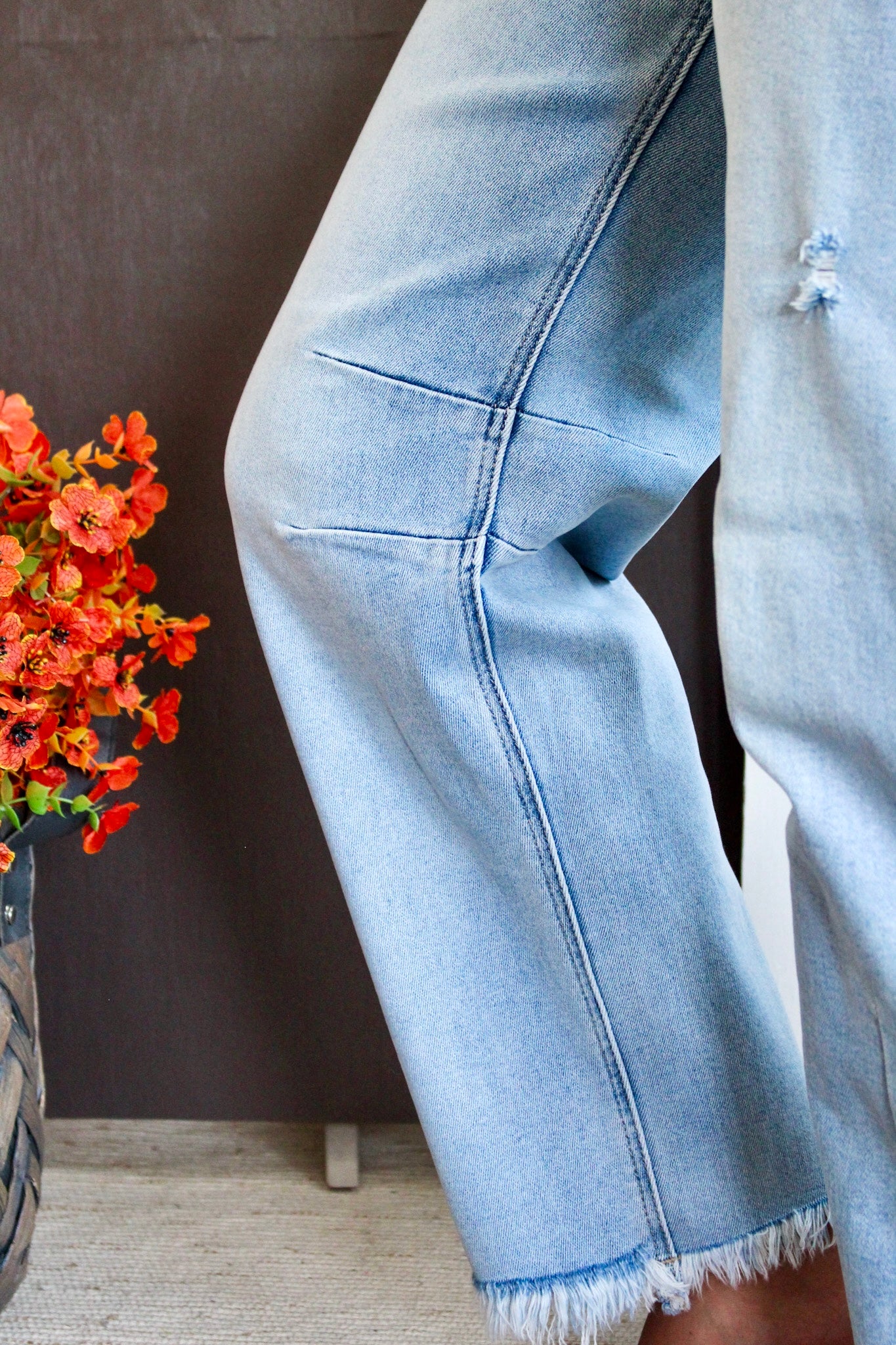 Redefine your denim style with the coolest fits! The engineered darts on the leg gives this pair a relaxed yet structured look, creating a barrel leg silhouette for a trendy and edgy fit. Featuring distressed details, silver hardware and a frayed edge hem. With a high rise fit, classic 5-pocket design, single button front and zip fly closure. 27” inseam, Risen. 93% Cotton, 5% Polyester, 2% Spandex. Model is 5’5” and wears 03.