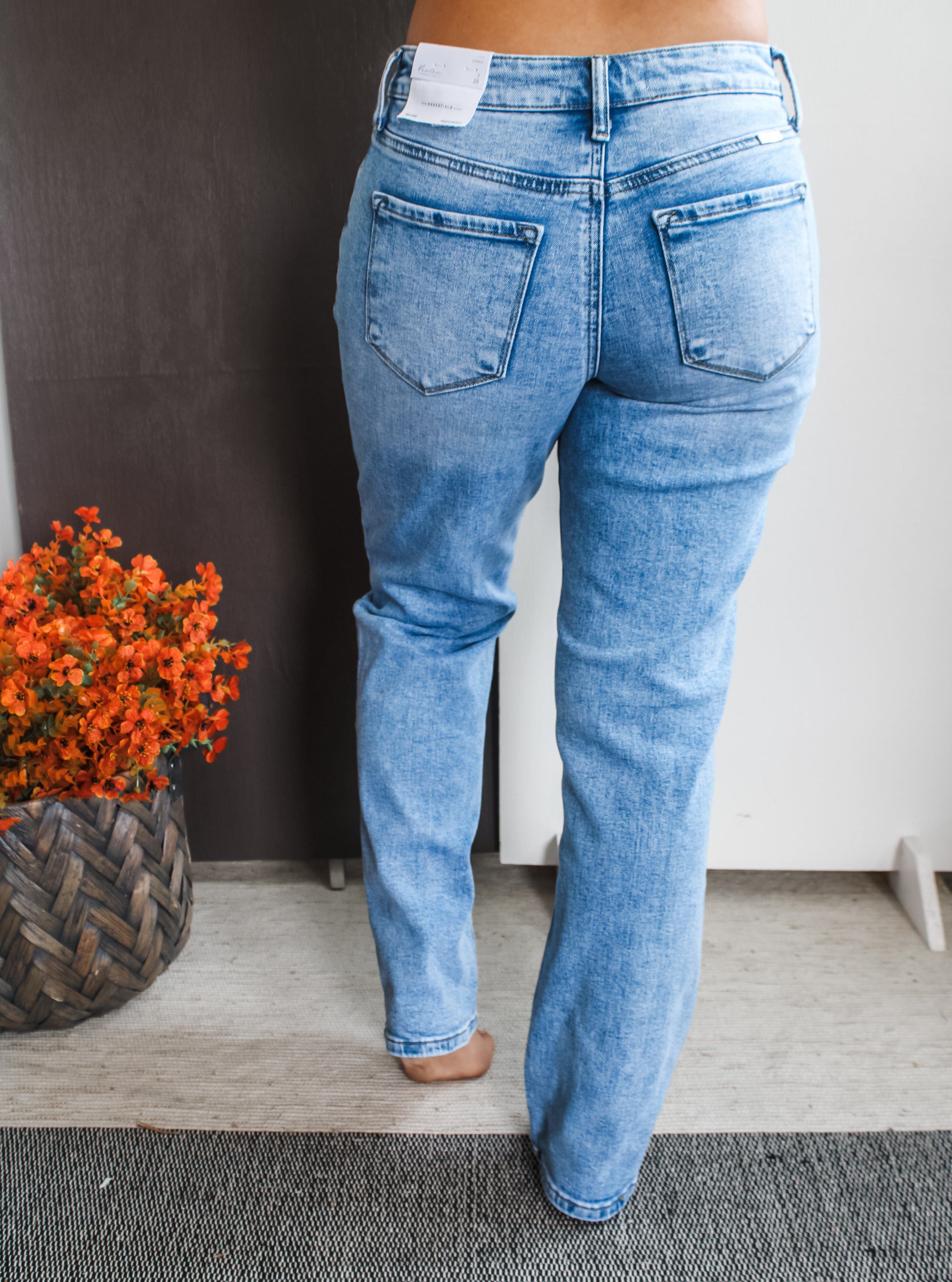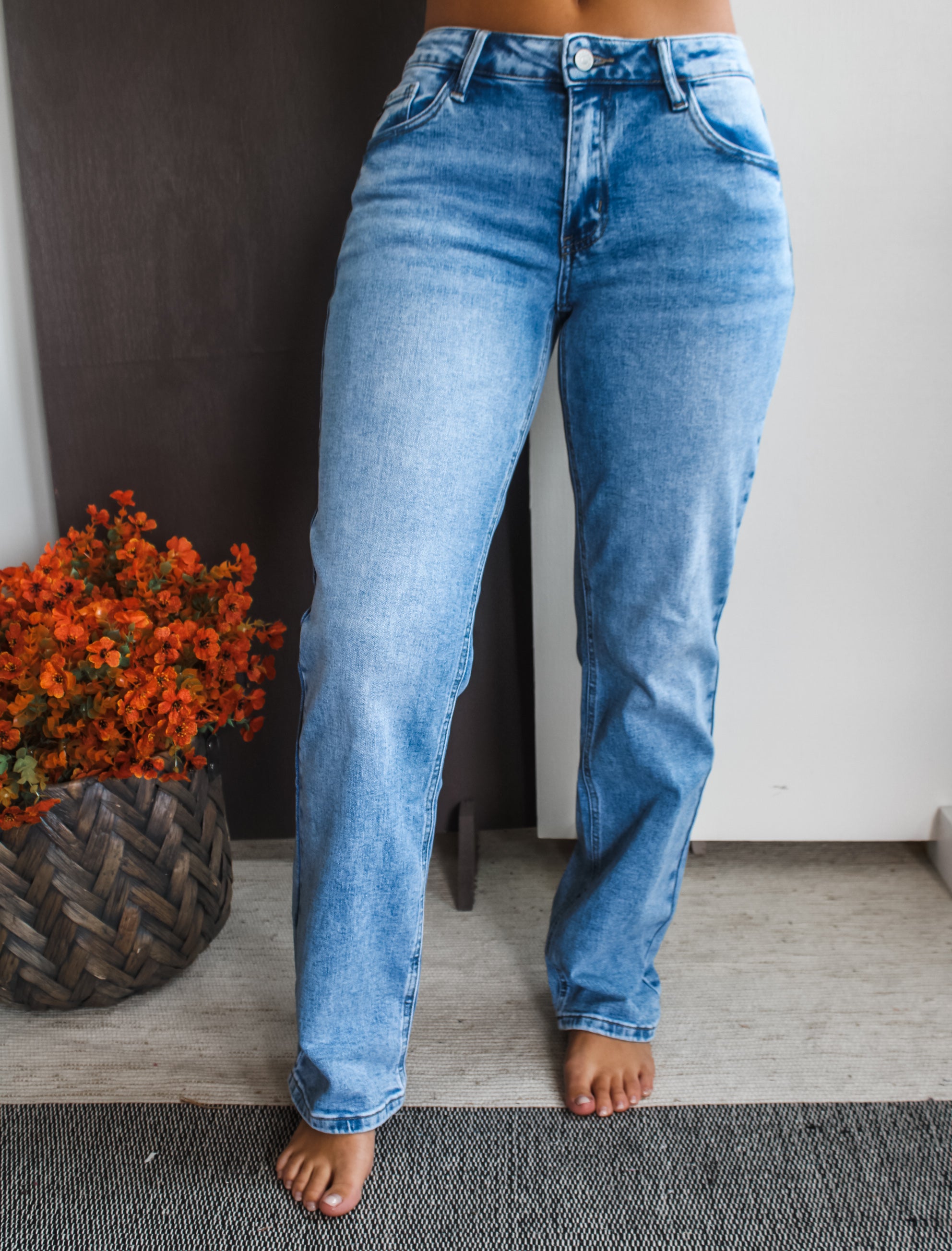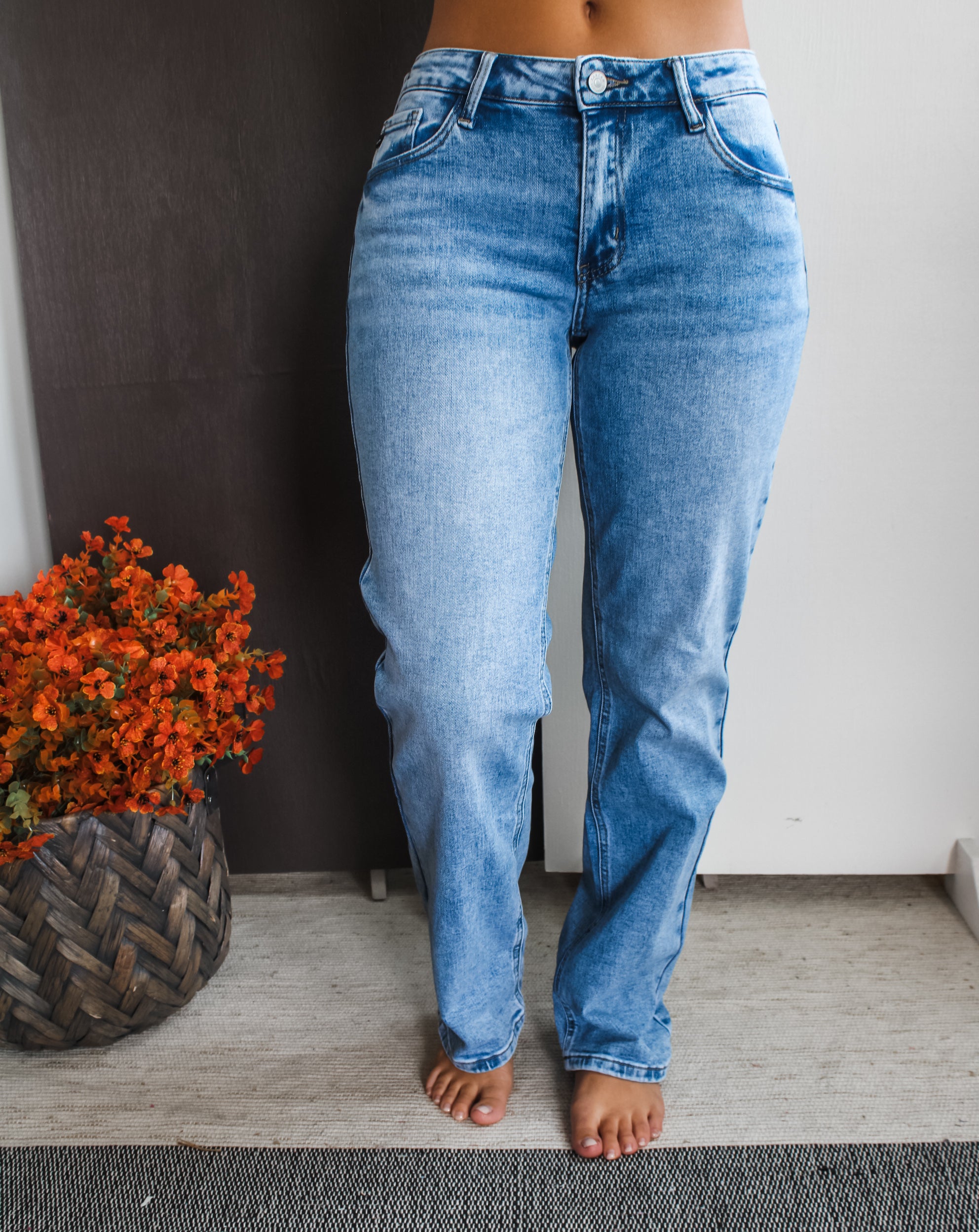 Our Cohen True Straight Jeans are perfect for a casual everyday denim. Made from a stone washed, stretch denim fabric to give you that all day comfort. Featuring a mid rise fit that sits right at the waistline, with a clean silhouette that tapers down to your ankle. With whiskering details at the front pockets, contrast stitching and finished hem. With a classic 5-pocket design, single button closure, and zip fly.  30” inseam, KanCan. 99% Cotton, 1% Spandex. Model is 5’5” and is wearing 03.