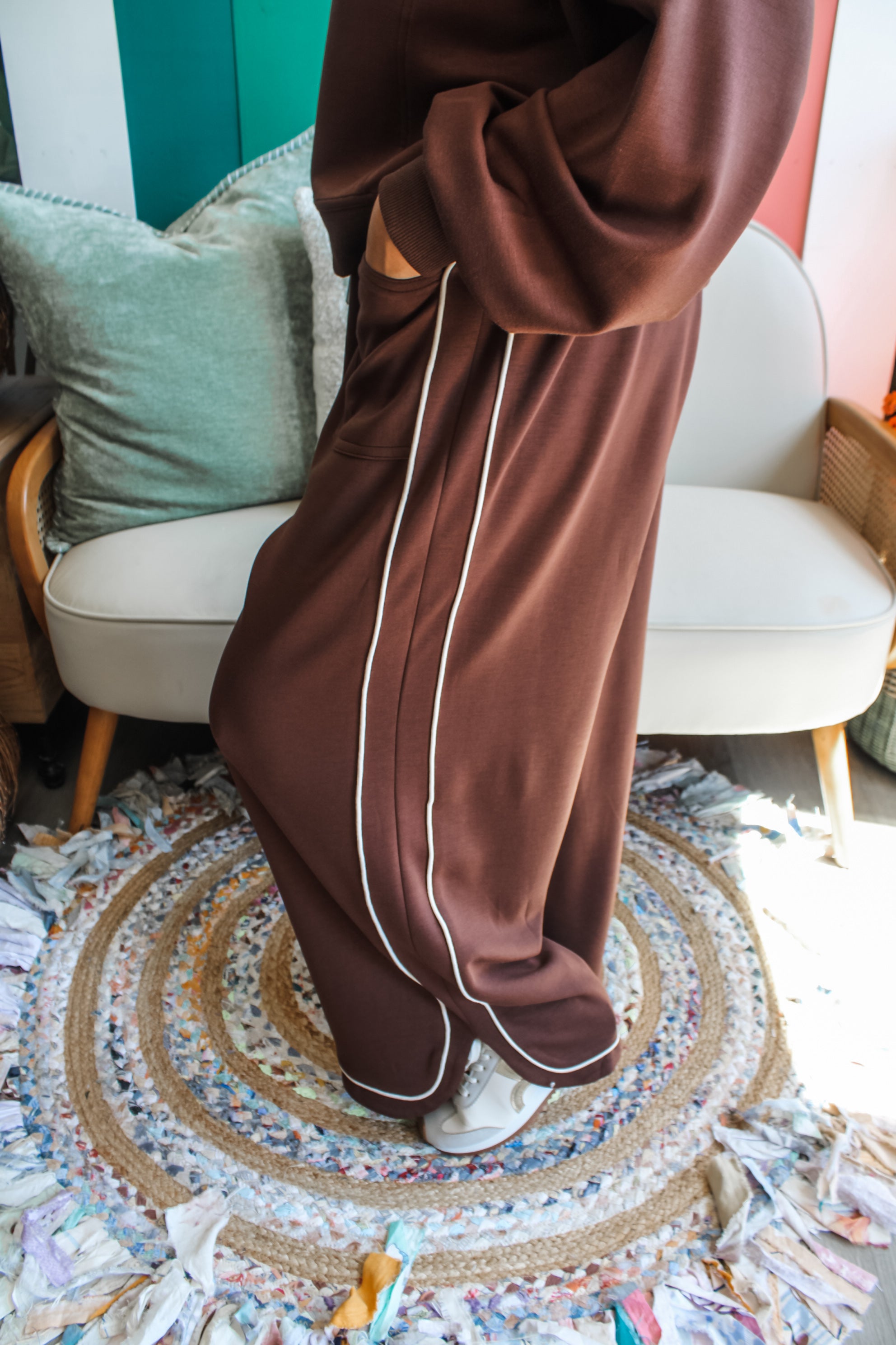Luxe meets leisure in these super chic pants. Smooth to the touch in a scuba knit fabrication, it’s an effortless look you can dress up or down all year long. Featuring a stretch drawstring waist and front patch pockets, with a wide leg fit that flows down beautifully for a sleek look. The piping trim detailing adds contrast and a retro-chic vibe.