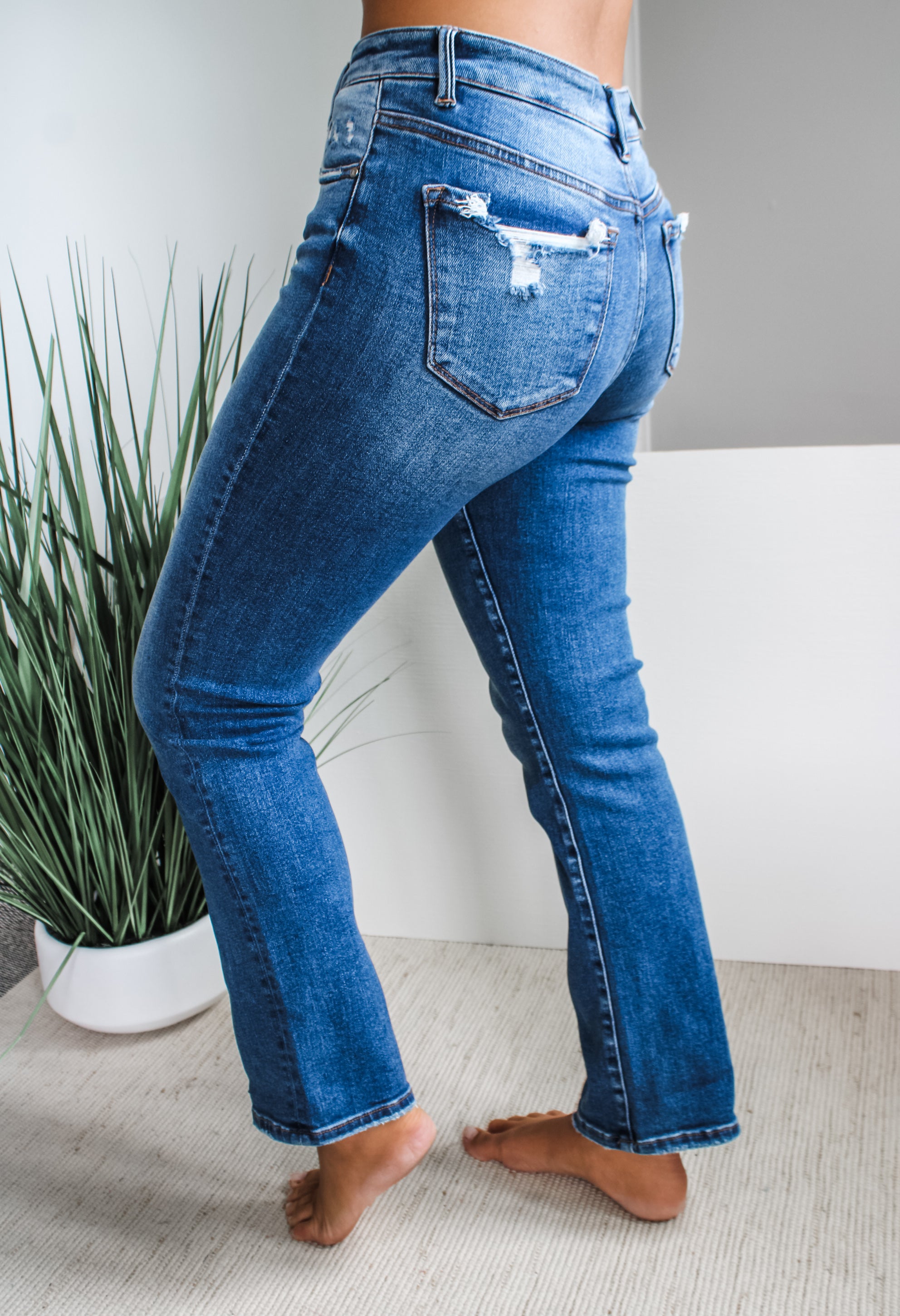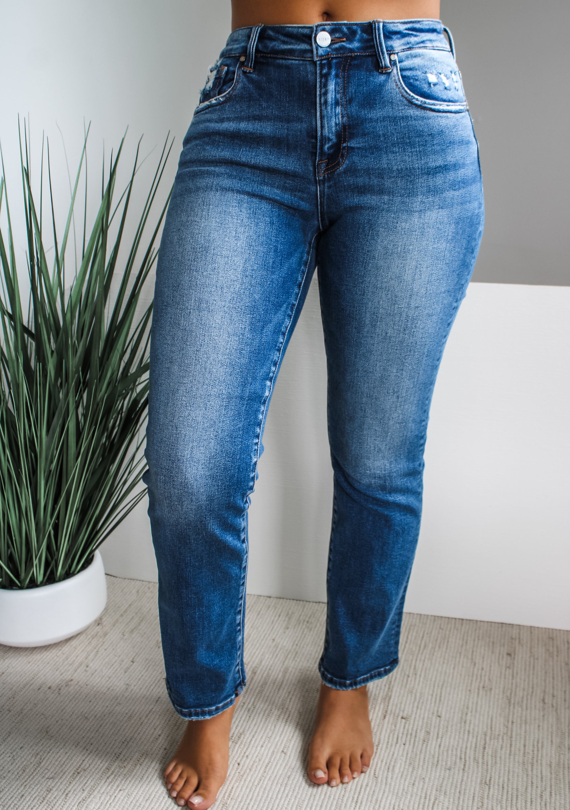 Our Elena Straight Leg is a true jean essential for any season. This timeless style is featured in a soft stretch denim for the most comfortable fit. Sits above the waistline with a straight fit that relaxes through the thigh and subtly tapers down the leg. The non-rip fabrication and finished hem make it a versatile staple for every closet. With a classic 5-pocket design, single-button front, and zip-fly closure. 29” inseam, Risen. 94% Cotton, 4% Polyester, 2% Spandex. Model is 5’5” and wears 03.