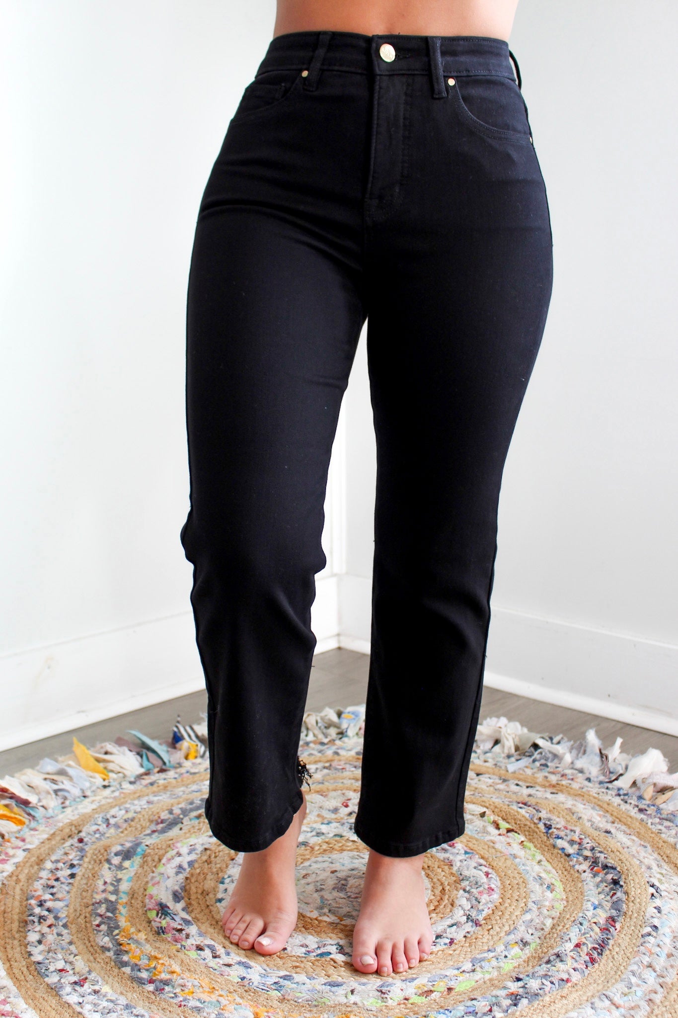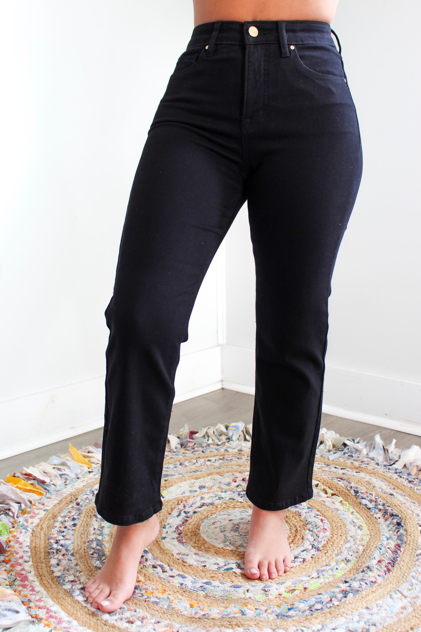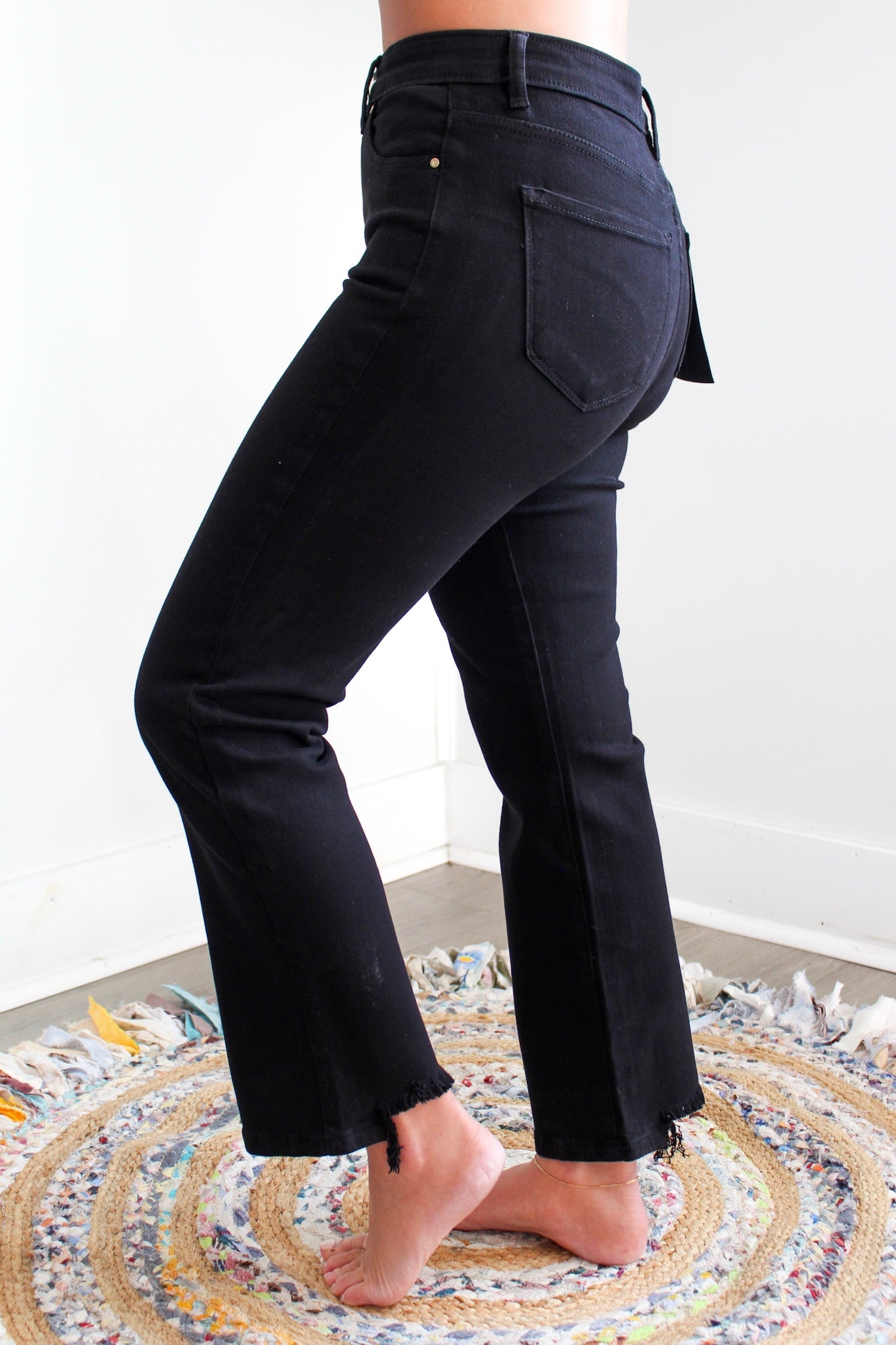 A timeless denim essential, our Erica Jean is a staple pair for every wardrobe. Forever in style, the streamlined straight leg silhouette is flattering for any body shape. Fabricated in a black non-rip stretch denim with an extra comfort, super stretchy waistband. Featuring subtle distress on the back hem and contrasting gold hardware, it’s a comfortable and versatile look to dress up or down for any occasion, any season.