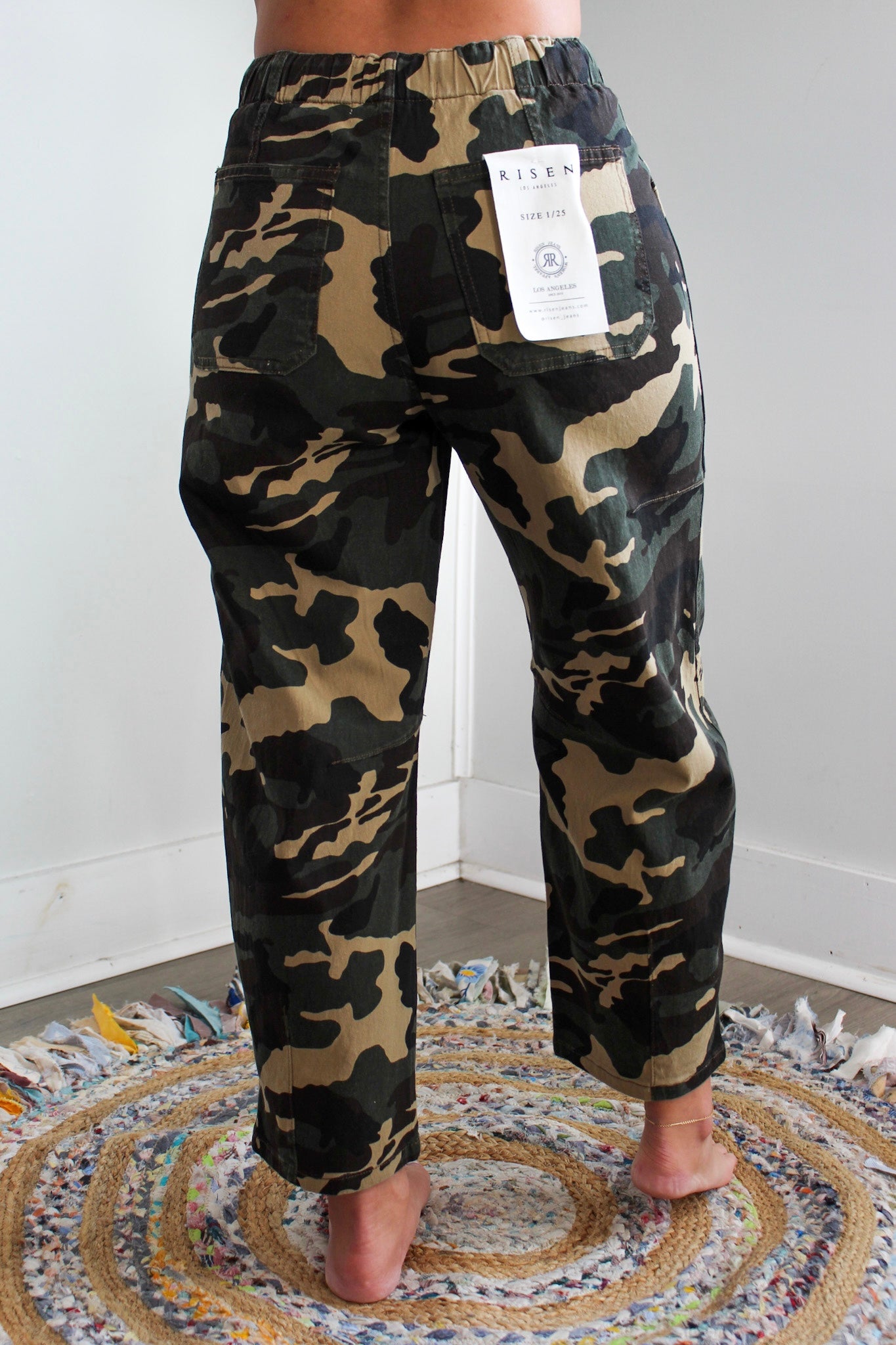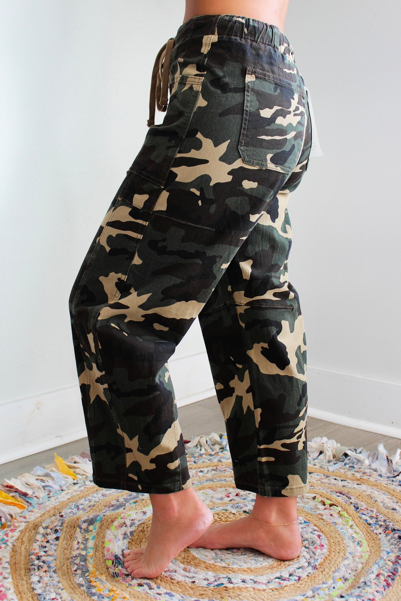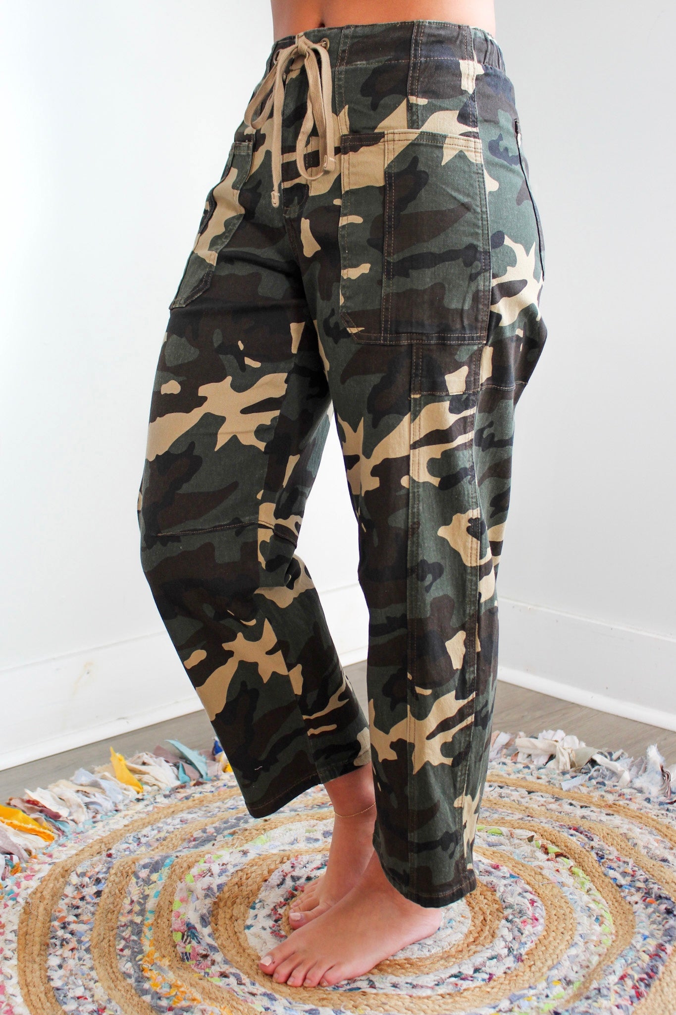 Edgy and eye-catching in a striking camo print, our Finley Jean will make a style statement wherever you go! This playful pair features a high rise fit with an adjustable drawstring and stretch band waist, front zip closure, 4-pocket design and a trendy barrel leg silhouette. 26” inseam, Risen. 98% Cotton, 2% Spandex. Model is 5’5” and wears 03.