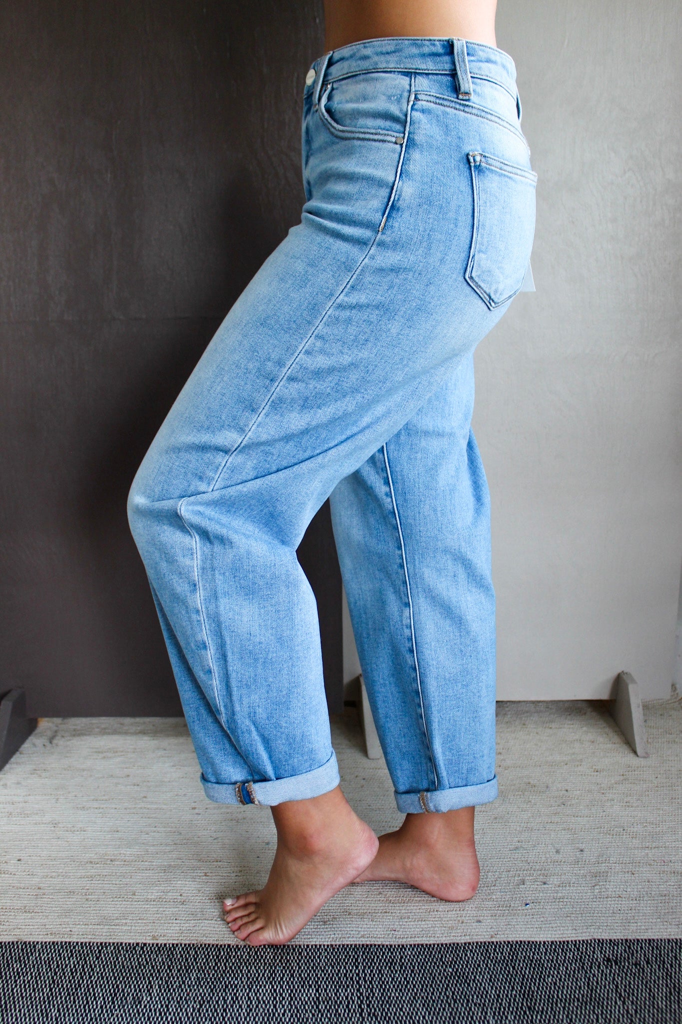 Redefine your style with the coolest denim! The soft stretch denim fabrication gives this pair a light and so-comfortable feel, while the trendy barrel leg silhouette gives it a chic and current fit. With a finished hem you can wear cuffed or uncuffed depending on your style mood.