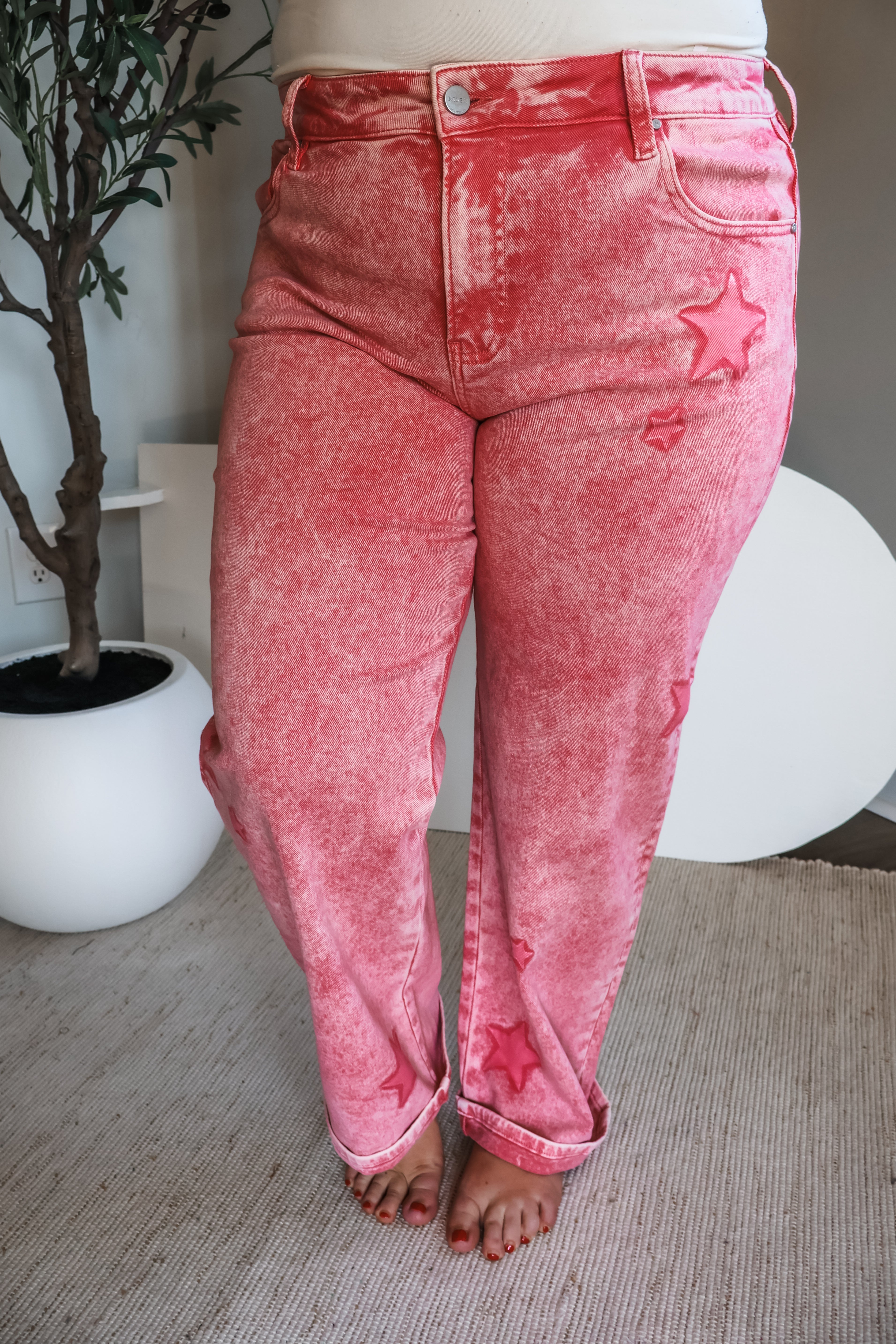 Let your denim style shine. Our Gigi Printed Jean features a star design and acid wash treatment for a playful pair that makes a statement. Featured in an easy boyfriend silhouette for a relaxed look that can be casual or polished depending on how you style it. Sits right at the waistline with a cuffed hem you can customize for the perfect length and styling options.