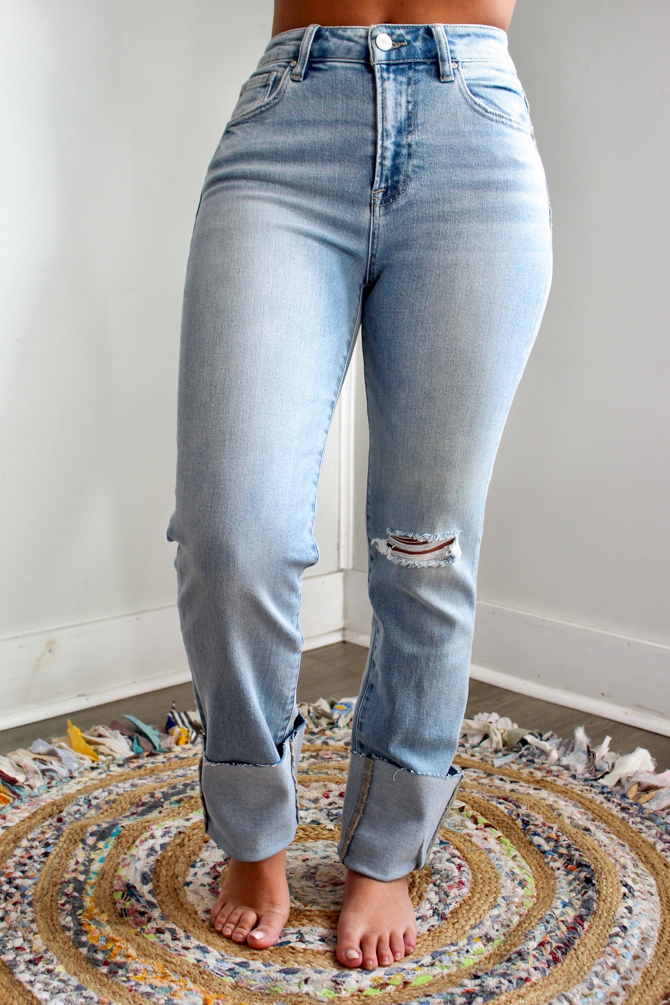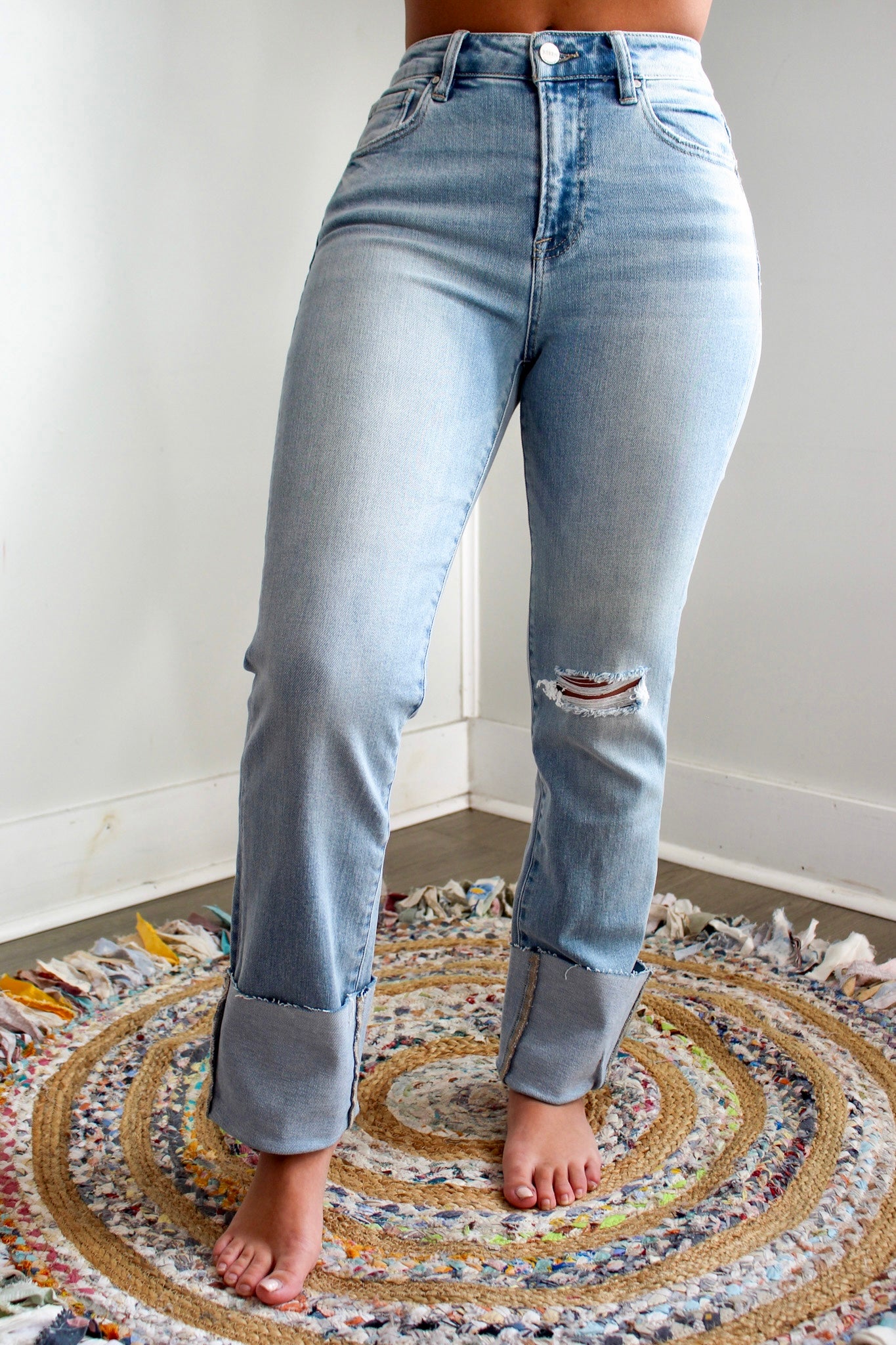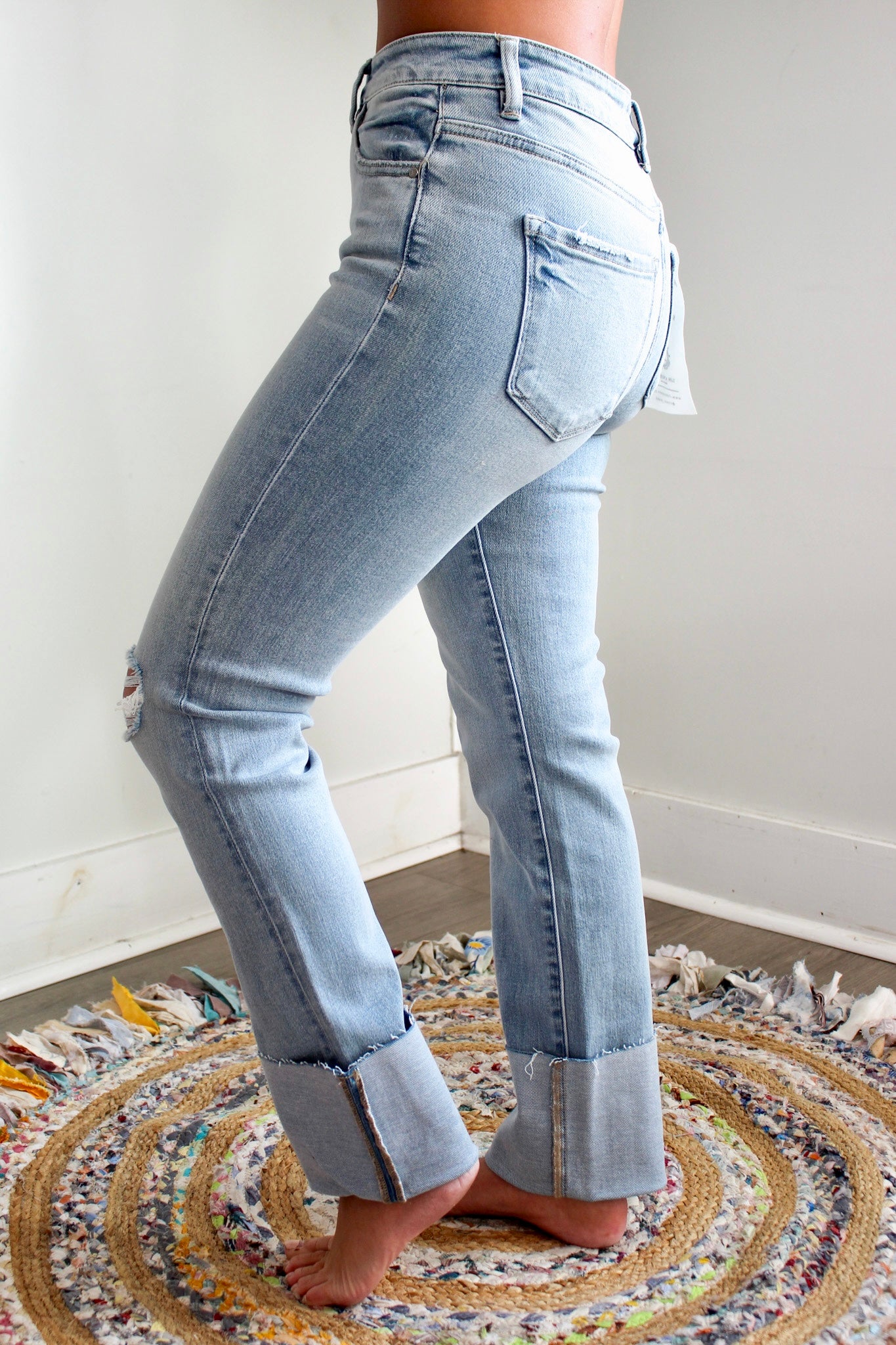 Size + fit: Sits above the waistline with a 5-pocket design, single button front and zip fly closure. 29” inseam with 5” cuff, Risen. 93% Cotton, 5% Polyester, 2% Spandex. Model is 5’5” and wears 03.