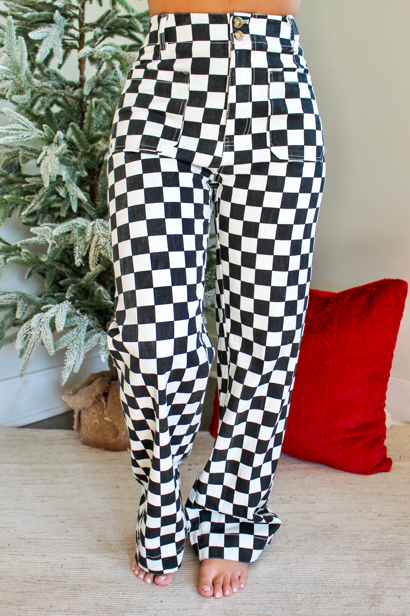 Perfectly printed in trendy checkerboard, our Kenzie Pants will make a style statement wherever you go! Featuring a high rise fit that cinches the waist, with a wide leg silhouette that elongates the leg. With a patch pocket design, double button front and zip fly closure.