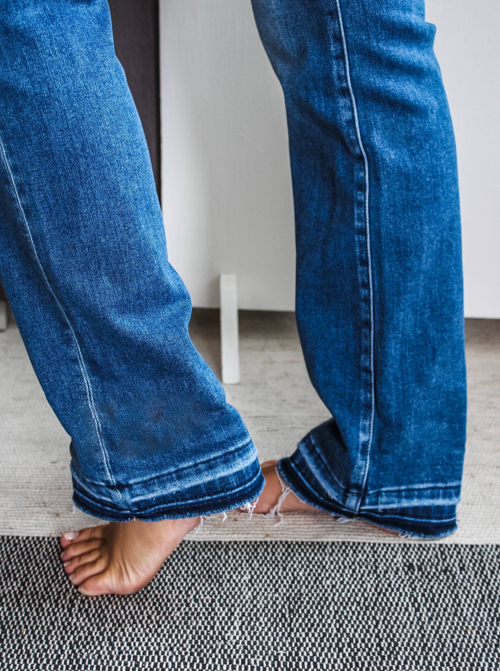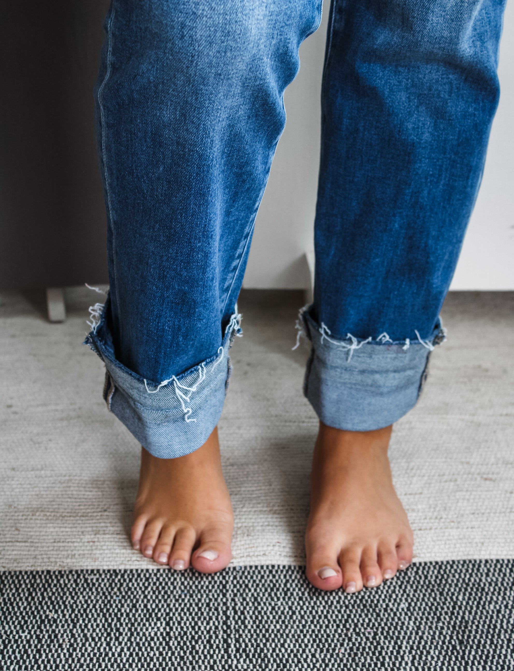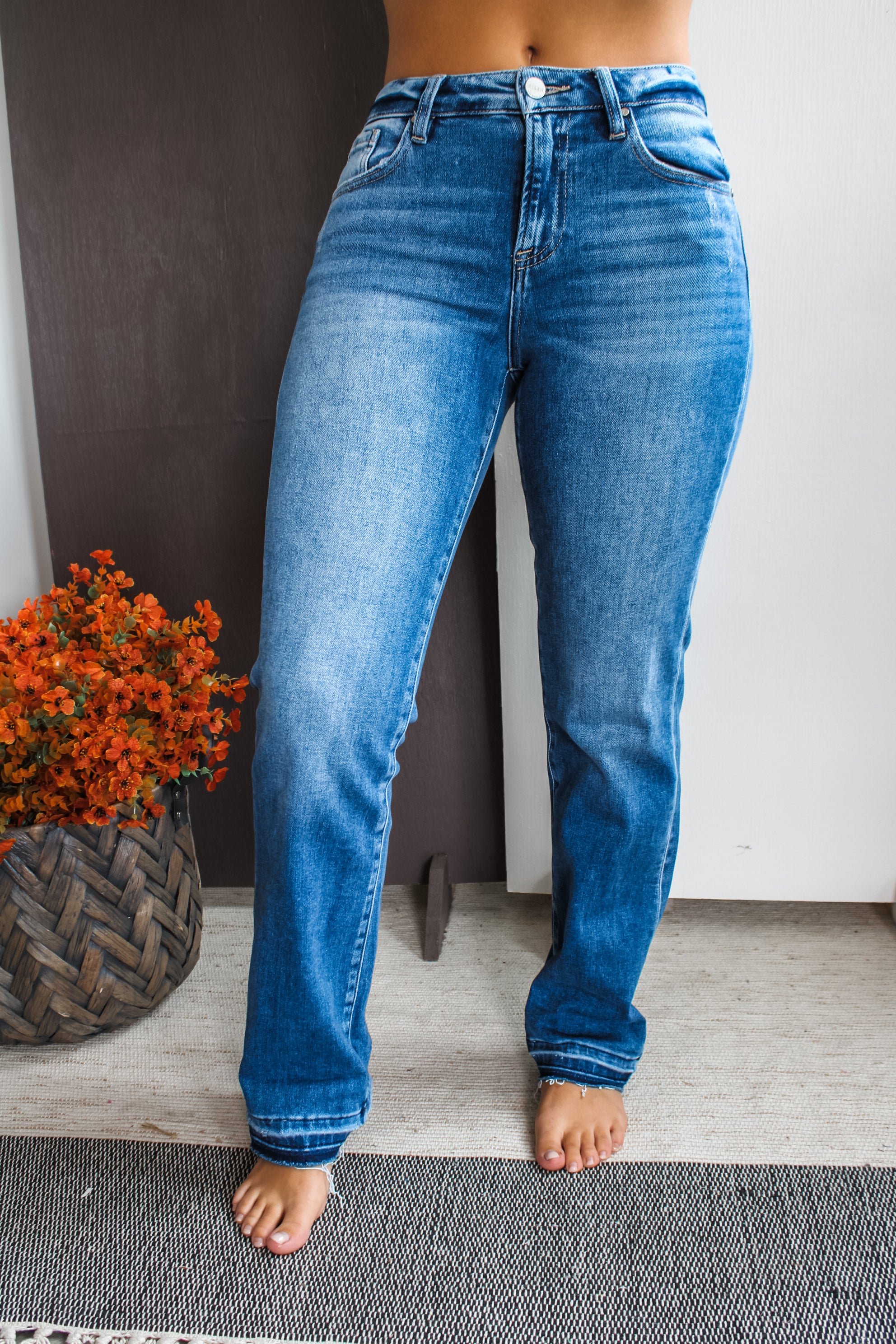 Complement your fall wardrobe with a pair of cool denim! Our Micah Straight Leg Jean comes in a timeless non-distress medium wash for a staple style you can wear with any top, while the frayed shadow hem adds just enough interest and flair. Sits right at the waistline with classic 5-pocket design, single-button front, and zip-fly closure. 28“ inseam with 2” cuff, Risen. 93% Cotton, 5% Polyester, 2% Spandex. Model is 5’5” and wears 03.