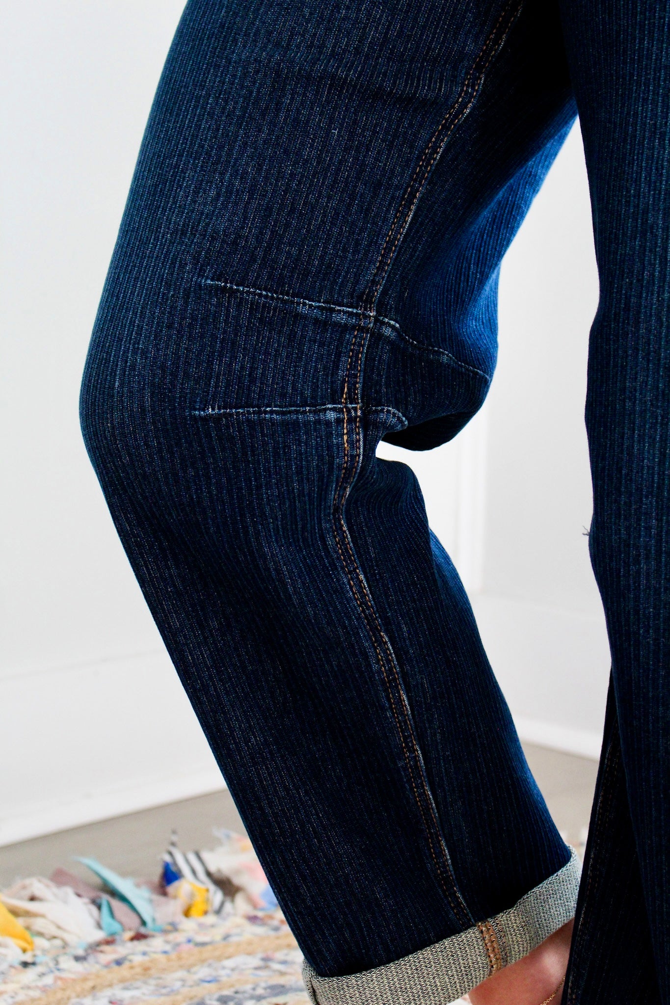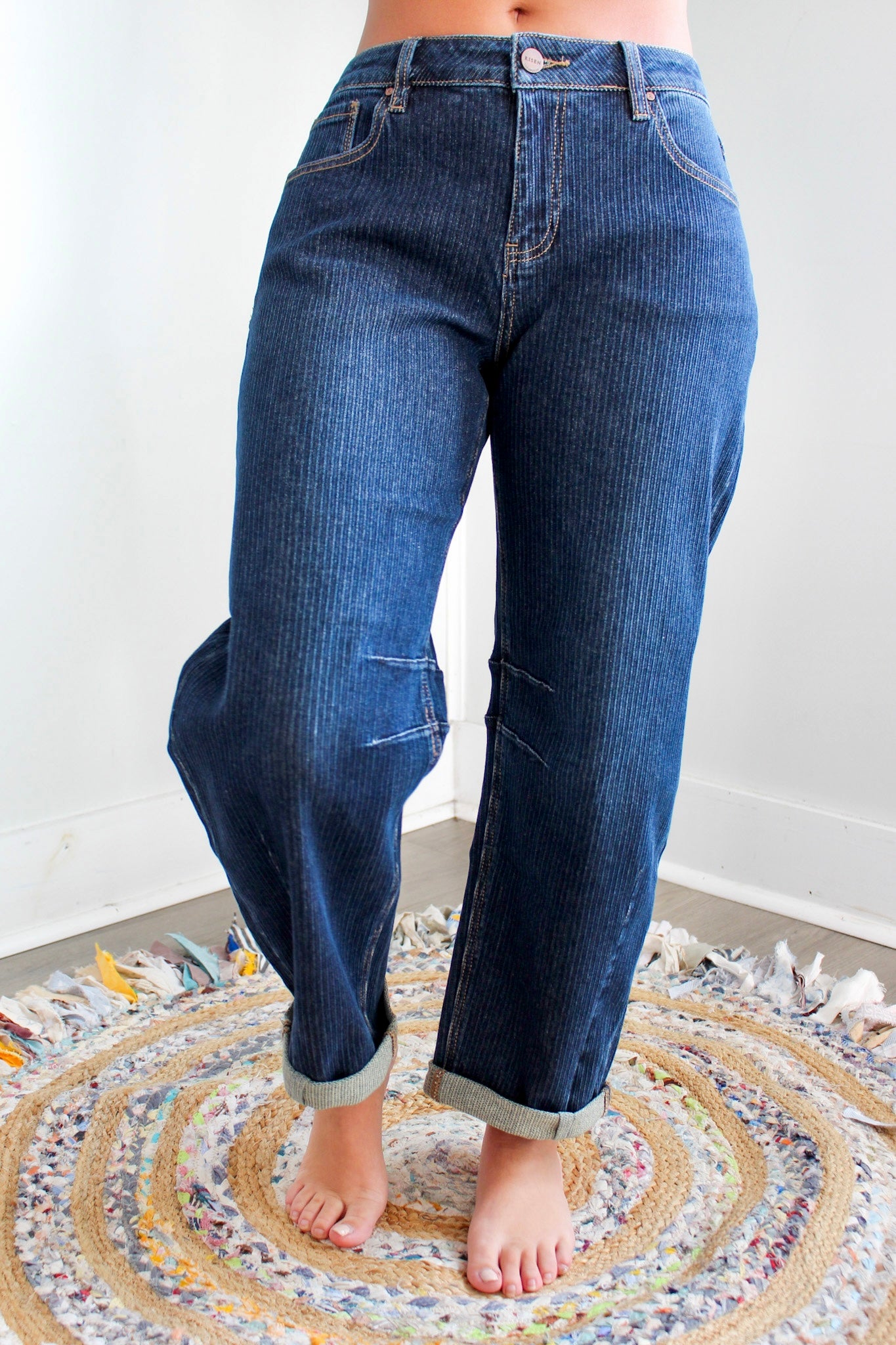 So cool and current, our Rocelyn Jean will redefine your denim style! The engineered darting and pinstripe textured denim fabrication give this pair a relaxed yet structured look, and the trendy barrel leg silhouette gives it an edgy flair. Featuring a high rise fit with contrast stitching and a cuffed hem you can unroll for a clean look. With a classic 5-pocket design, single button front and zip fly closure. 26” inseam with 2.5” cuffed hem, Risen. 94% Cotton, 5% Polyester, 1% Spandex. Model is 5’5” and wears 03.