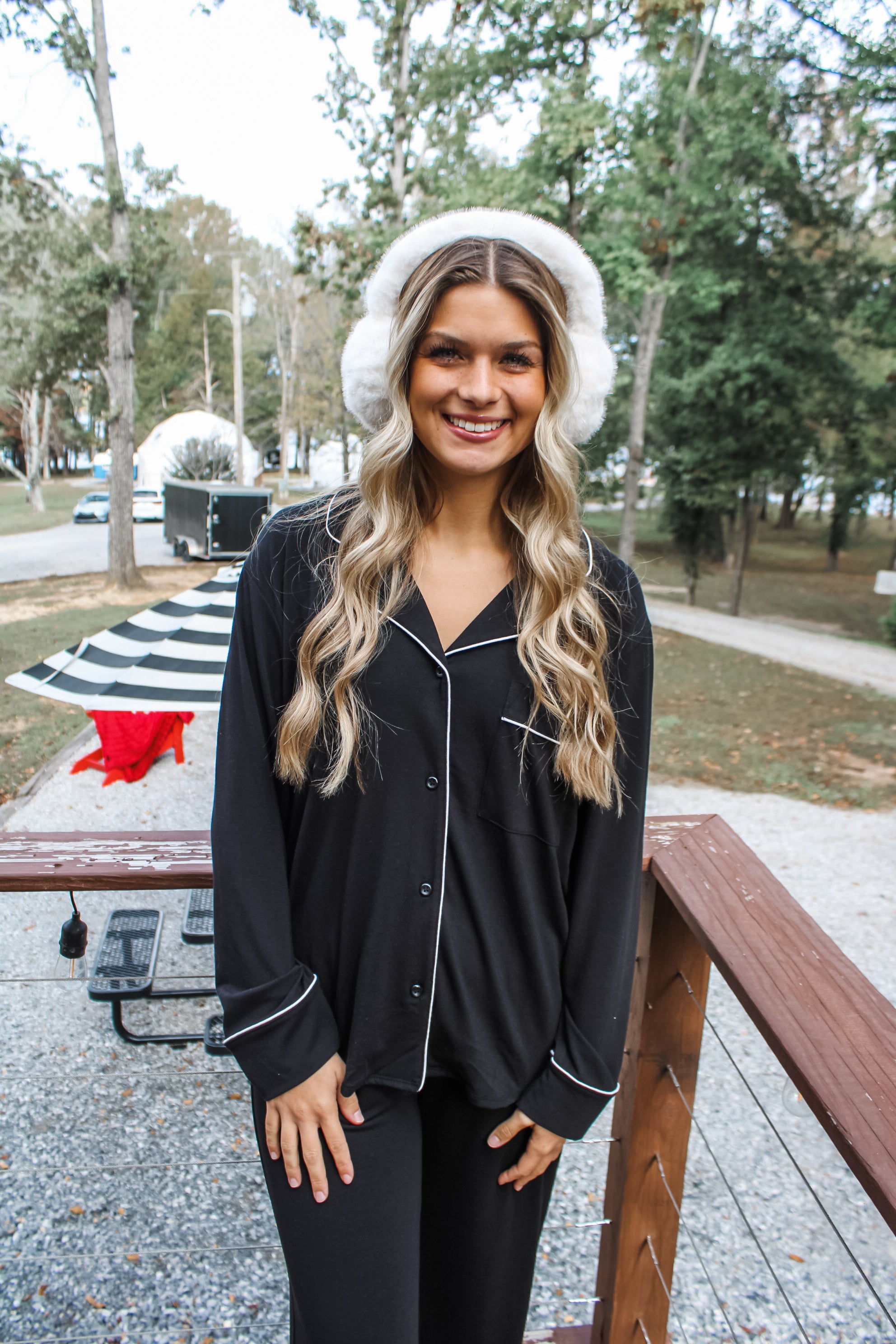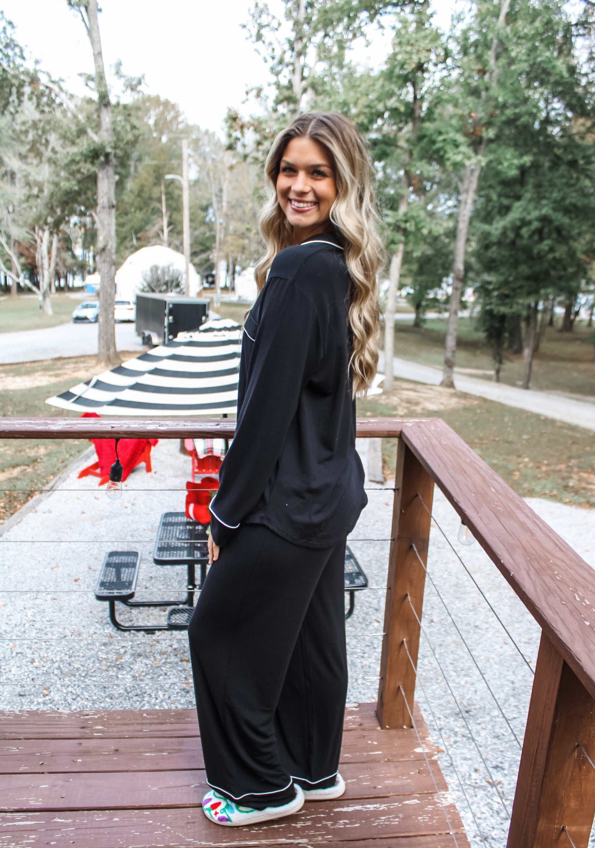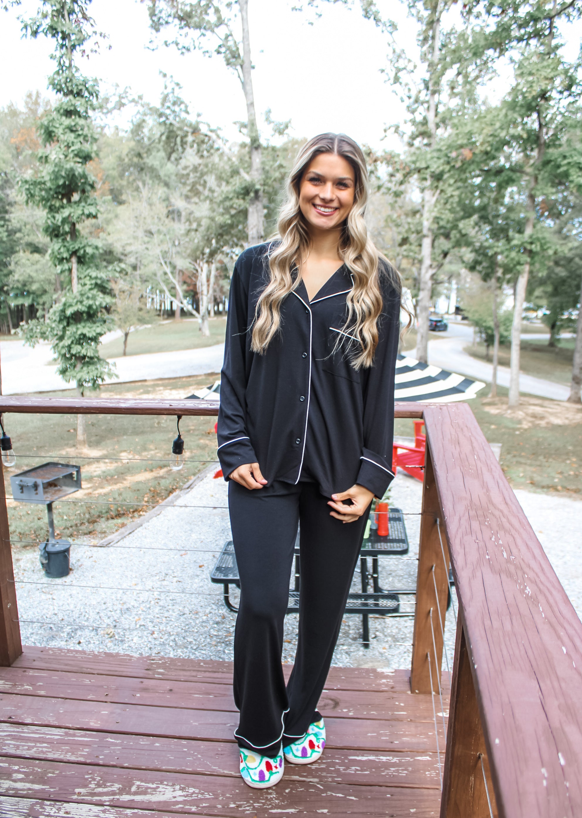 Drift off in dreamy comfort. Crafted from an ultra-soft lightweight knit that drapes over the body, this pajama set will let you lounge around in style. Featuring a timeless long-sleeve button-up top with a classic notched collar and chest pocket, paired with full-length pants with a stretch waist and easy silhouette. With piping trim detailing, it’s a polished and put-together pairing for the holidays and beyond.