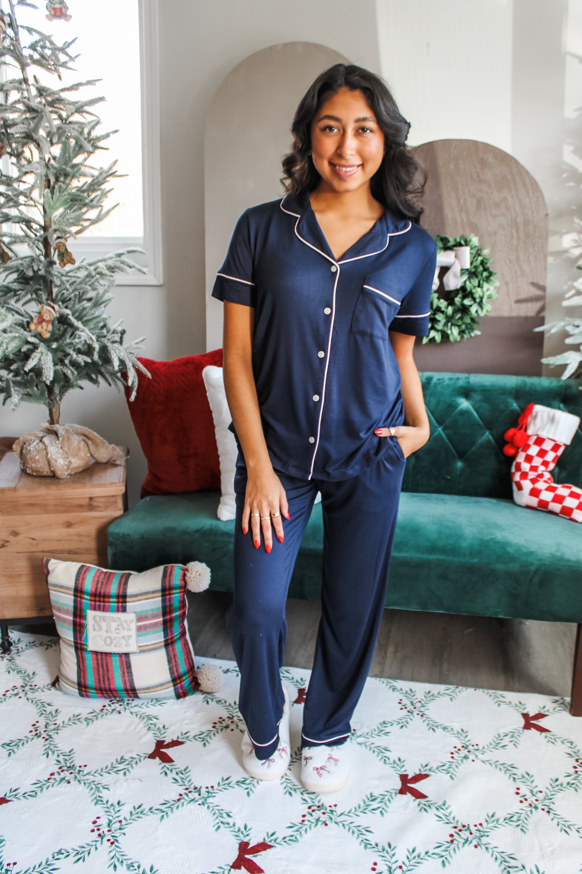 Drift off in dreamy comfort. Crafted from an ultra-soft lightweight knit that drapes over the body, this pajama set will let you lounge around in style. Featuring a timeless short-sleeve button-up top with a classic notched collar and chest pocket, paired with full-length pants with a stretch waist, hand pockets and easy silhouette. With piping trim detailing, it’s a polished and put-together pairing for the holidays and beyond.