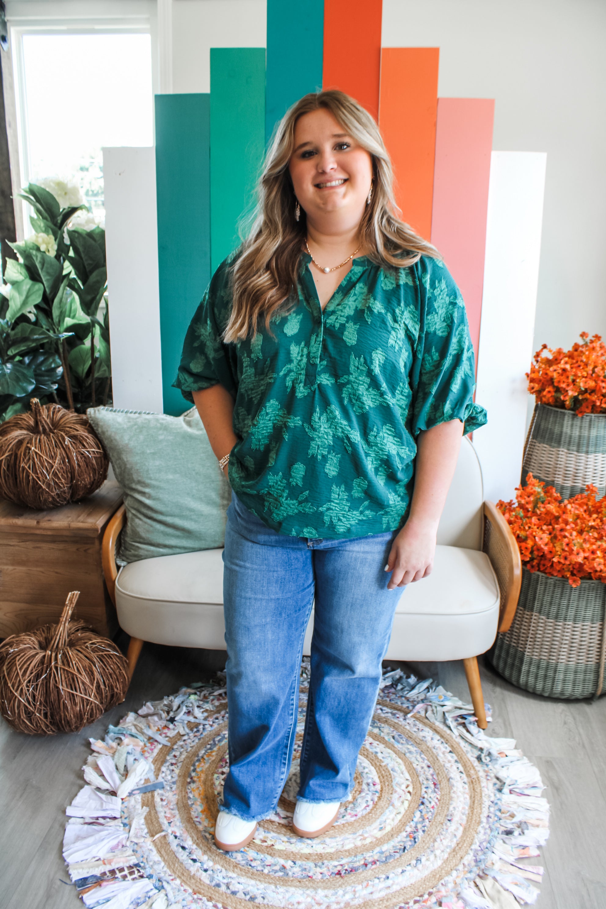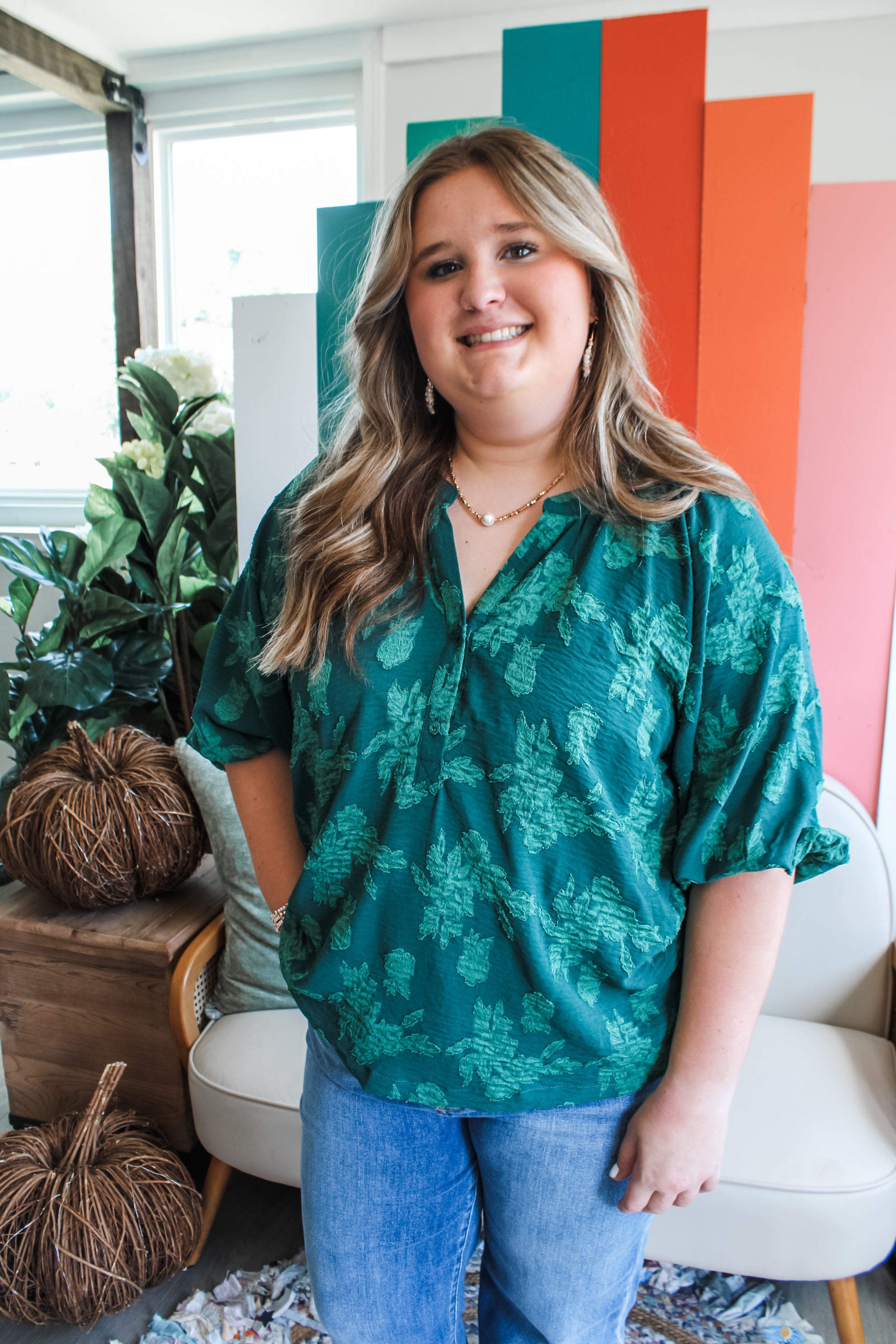 Think specialty textures for a stylish fall wardrobe. This woven blouse is an eye-catching look whether you’re going out of town, attending a work event or celebrating fall occasions. Featuring a floral appliqué design with a notched neckline, balloon sleeves and a flowy silhouette.