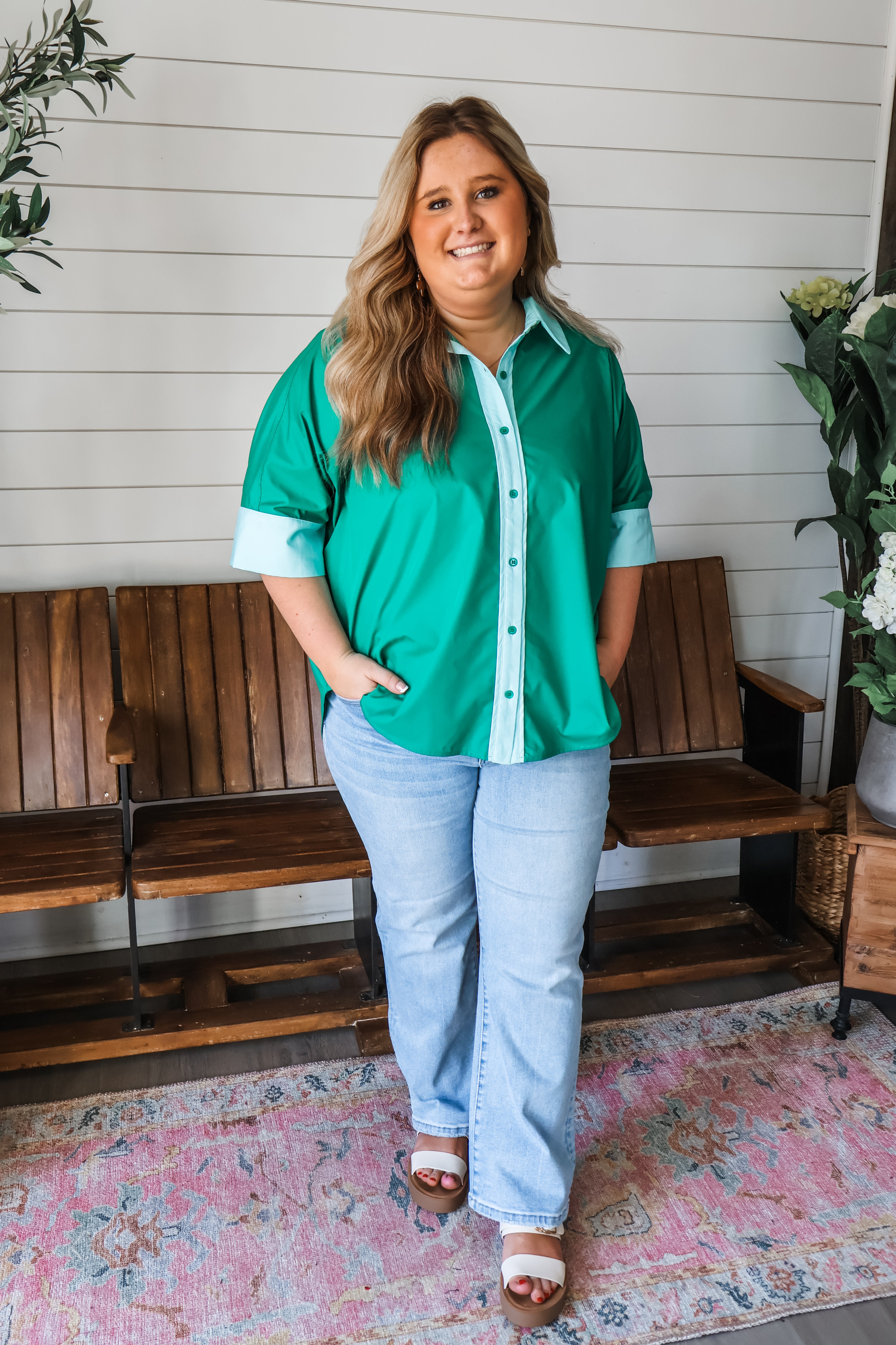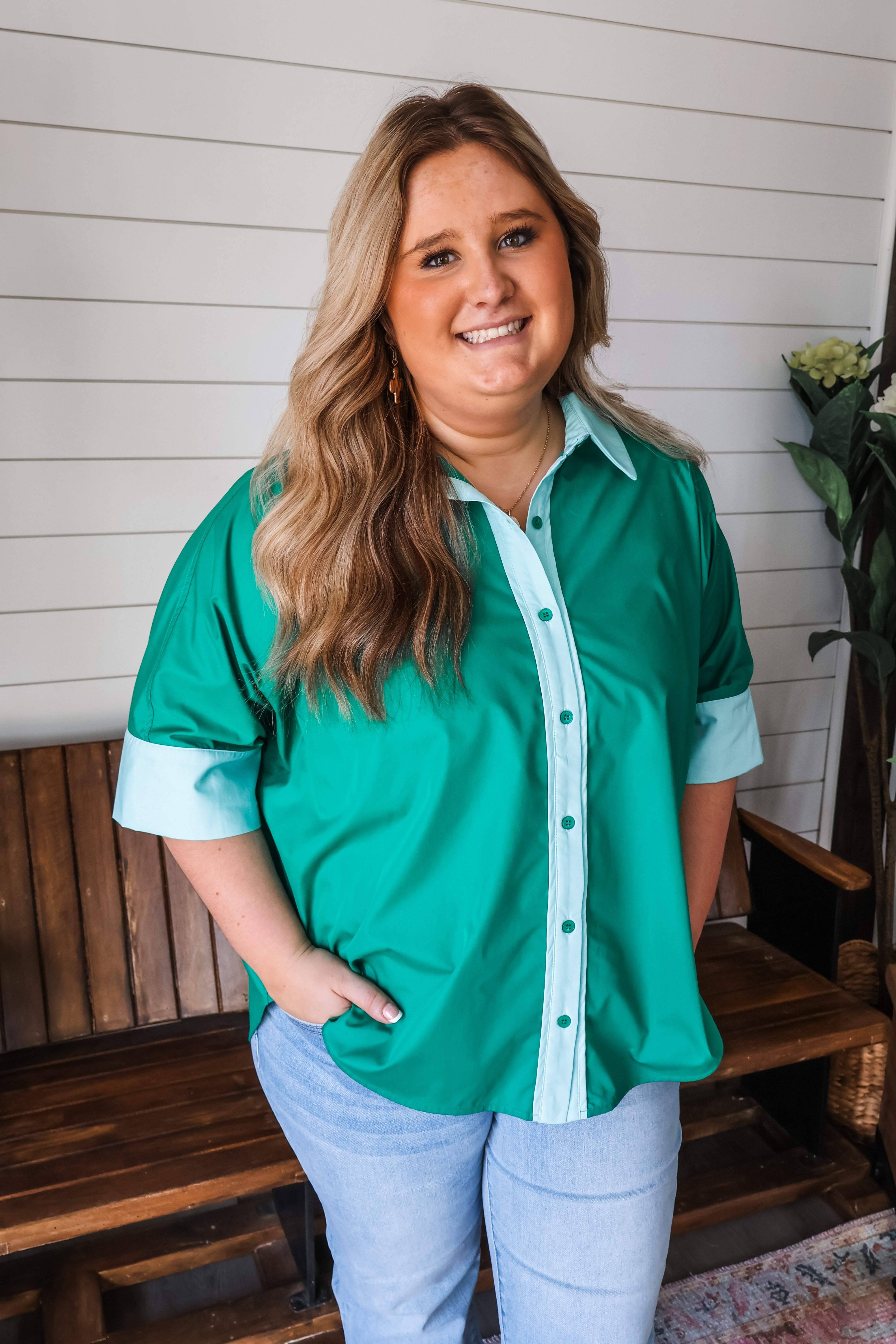 So chic in two-tone green, this top is a standout look for work or play! The color contrast design gives it a sophisticated flair, while dolman silhouette provides a breezy modern fit. Crafted from a smooth poplin woven with a collared neckline, full button front and a curved high low hem.