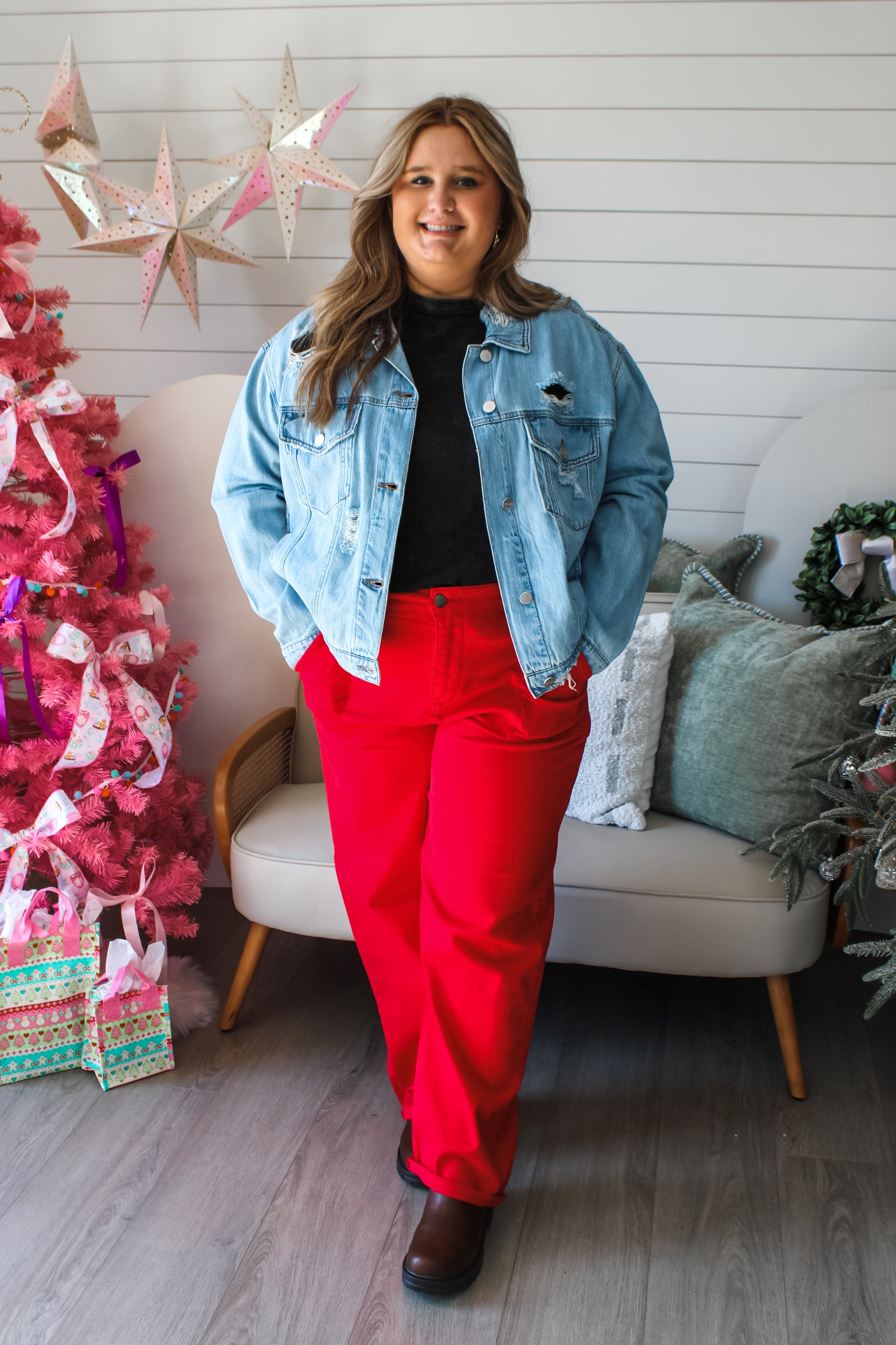 Top off your holiday looks with a denim edge! This distressed jacket is the perfect layering piece for your basic knits, cozy sweaters and graphic sweatshirts. Fabricated in a quintessential light wash, with a collared neckline, button front closure, double chest pockets, hidden hand pockets and button tab detailing at the hem. This so-cool staple is featured in a relaxed silhouette for endless laidback styling throughout the year.