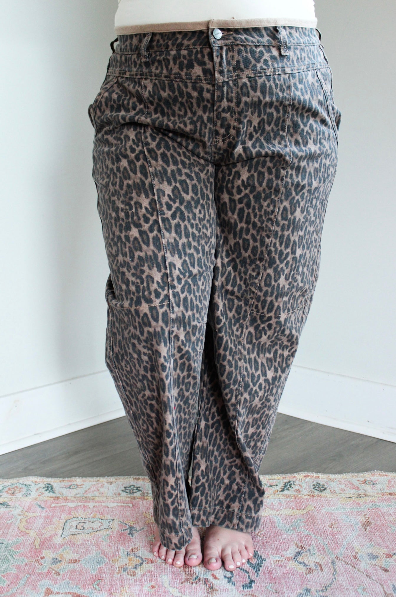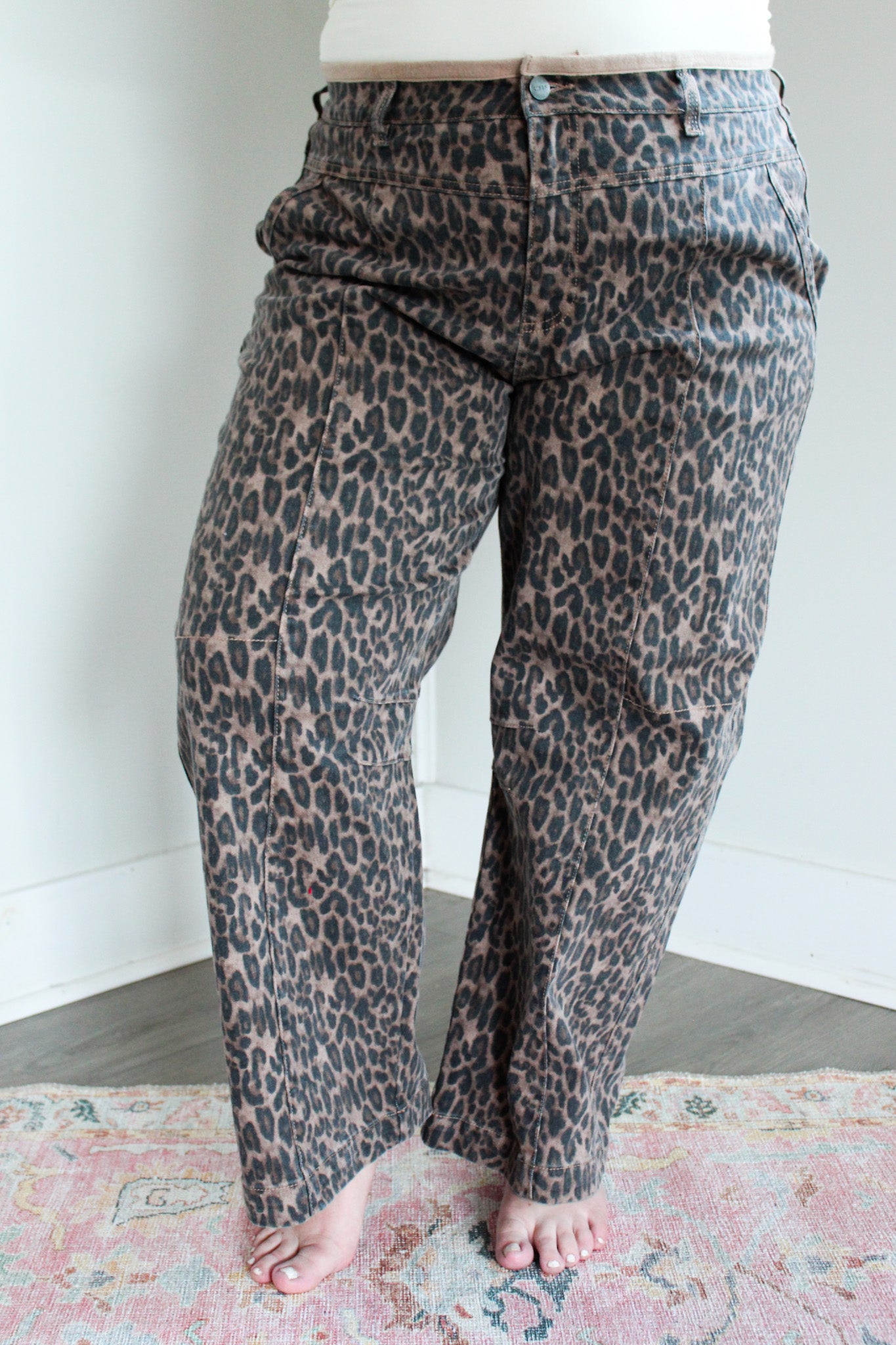 Edgy and eye-catching in a timeless leopard print, our Esme Jean will make a style statement wherever you go! This playful pair features a high rise fit with a stretch panel waist, 4-pocket design and a trendy barrel leg silhouette. With a high rise fit, 4-pocket design, single button front and zip fly closure. 27” inseam, Risen. 94.2% Cotton, 4.6% Polyester, 1.2% Spandex. Model is 5’5” and wears 1X.