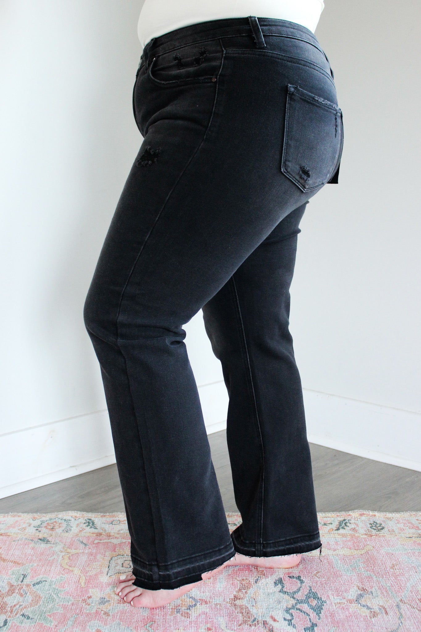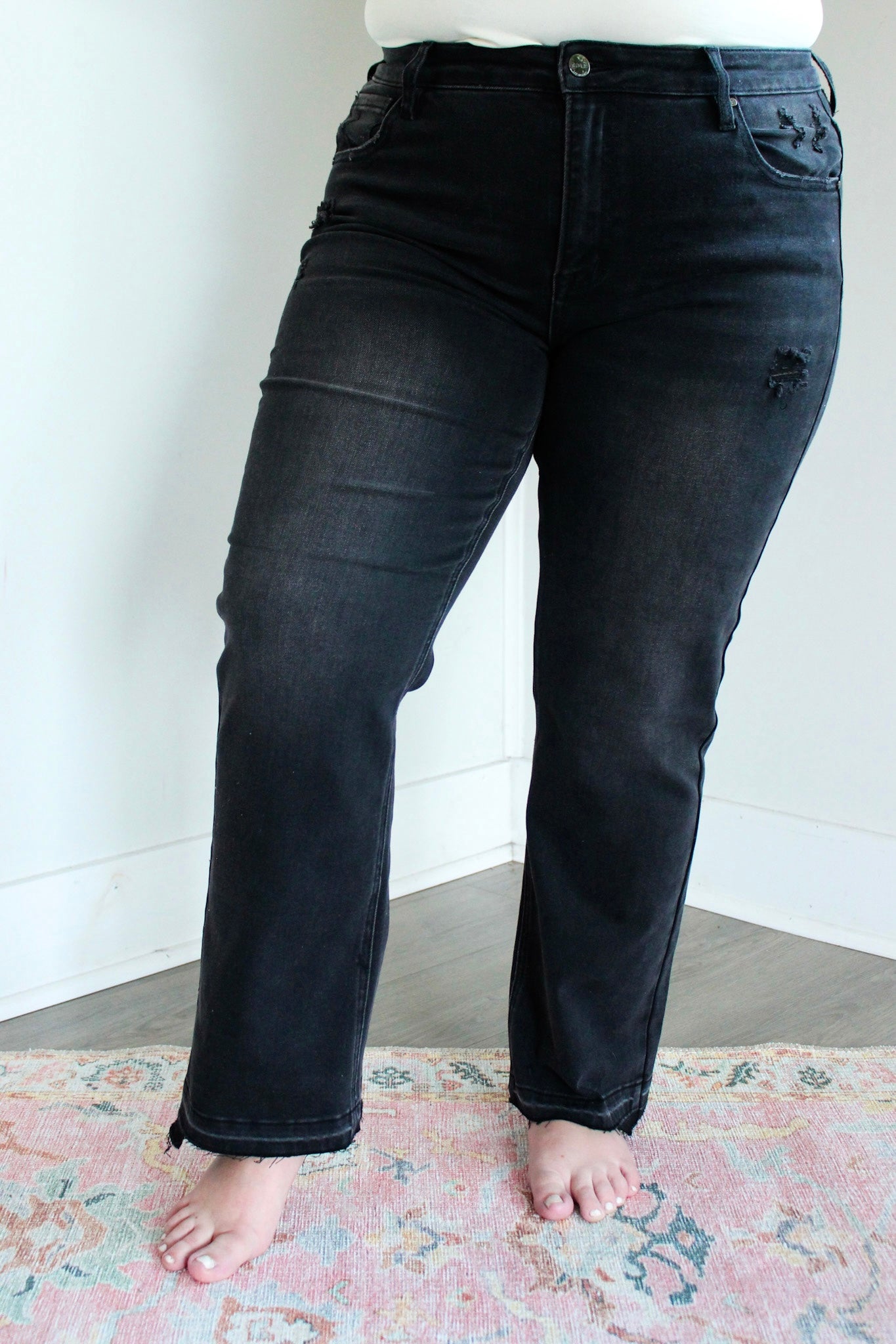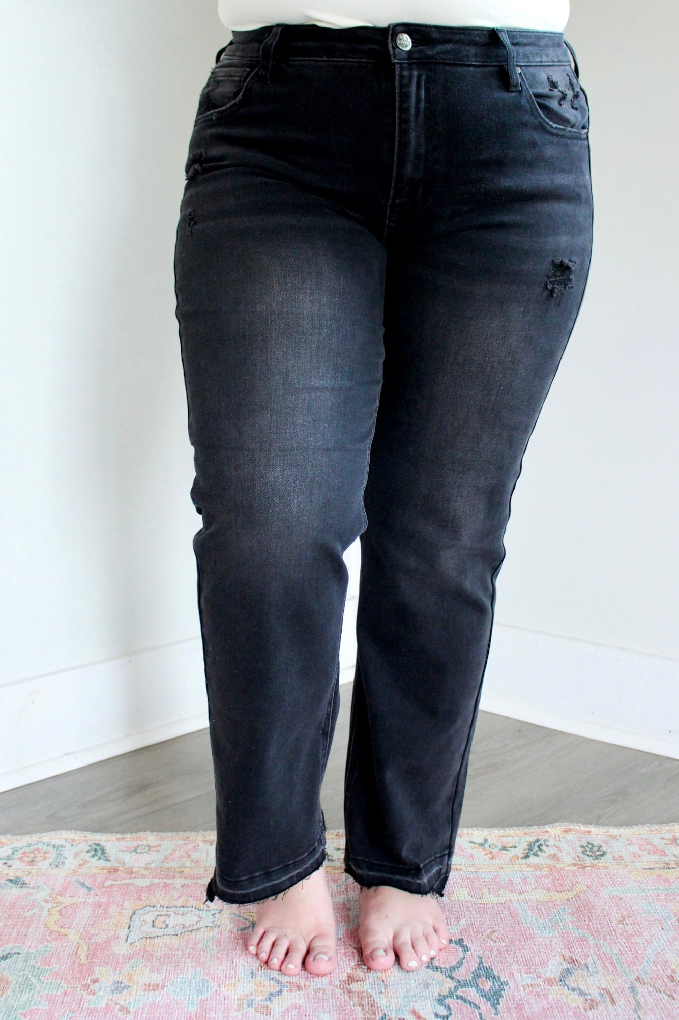 Complement your wardrobe with a pair of cool denim! Our Jacklyn Straight Leg Jean comes in a timeless black wash for a staple style you can wear with any top, while the distress details and frayed shadow hem adds just enough interest and flair.