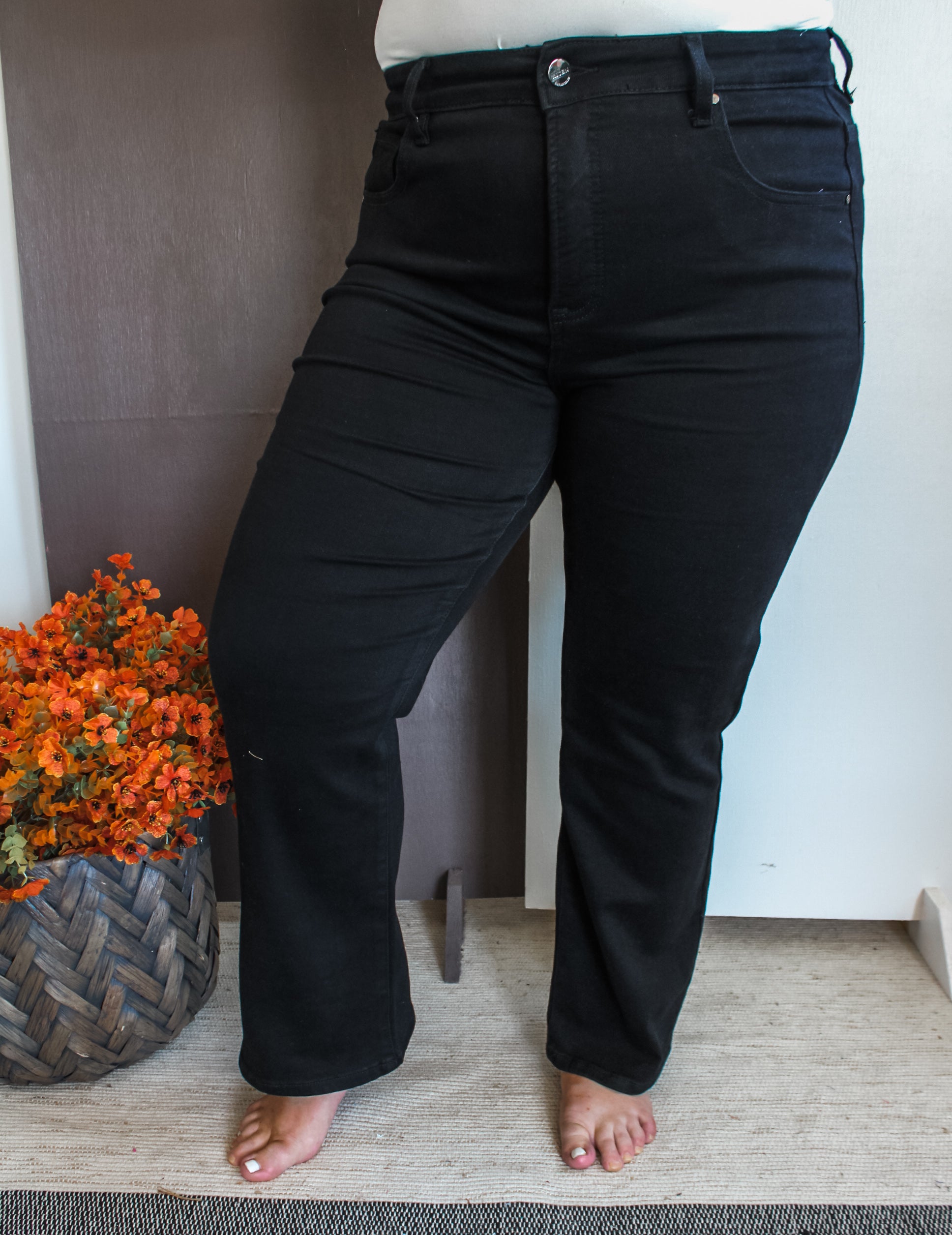 Forever in style, the streamlined straight leg silhouette is flattering for any body shape. Fabricated in a black non-rip stretch denim with a tummy control waistband, it’s a comfortable and versatile look to dress up or down for any occasion, any season. With a classic 5-pocket design, single button front and zip fly closure. 28.5” inseam, Risen. 64.8% Cotton, 29.8% Polyester, 3.6% Rayon, 1.8% Spandex. Model is 5’5” and is wearing 1X.