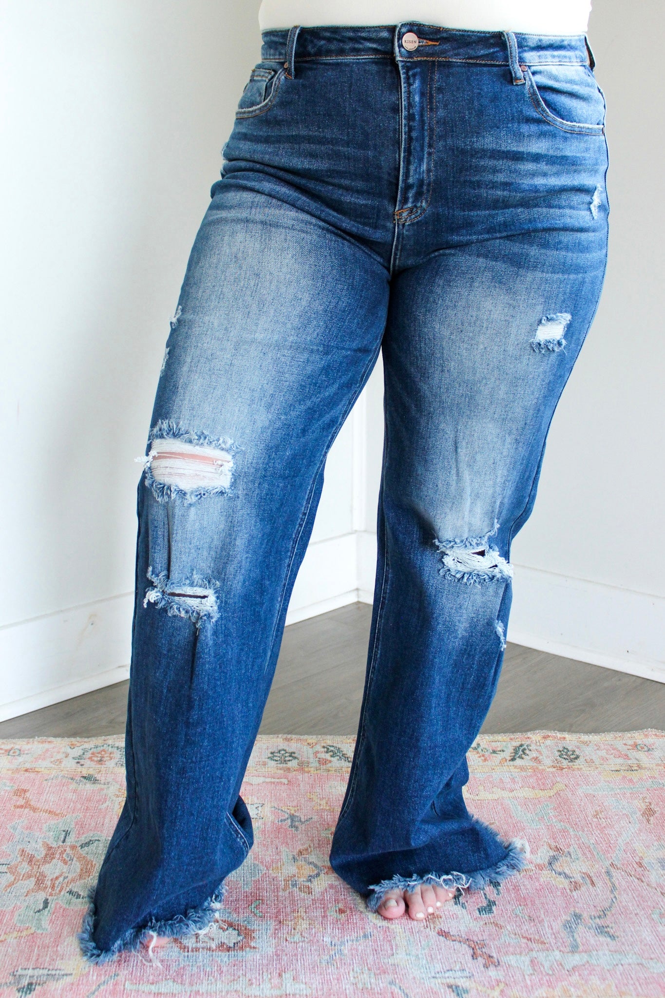 Size + fit: Featuring a high rise fit with a classic 5-pocket design, single-button front, and zip-fly closure. 1X (16W), 2X (18W), 3X (20W). 32” inseam, Risen. 91% Cotton, 6% Polyester, 3% Spandex. Model is 5’5” and wears 1X.