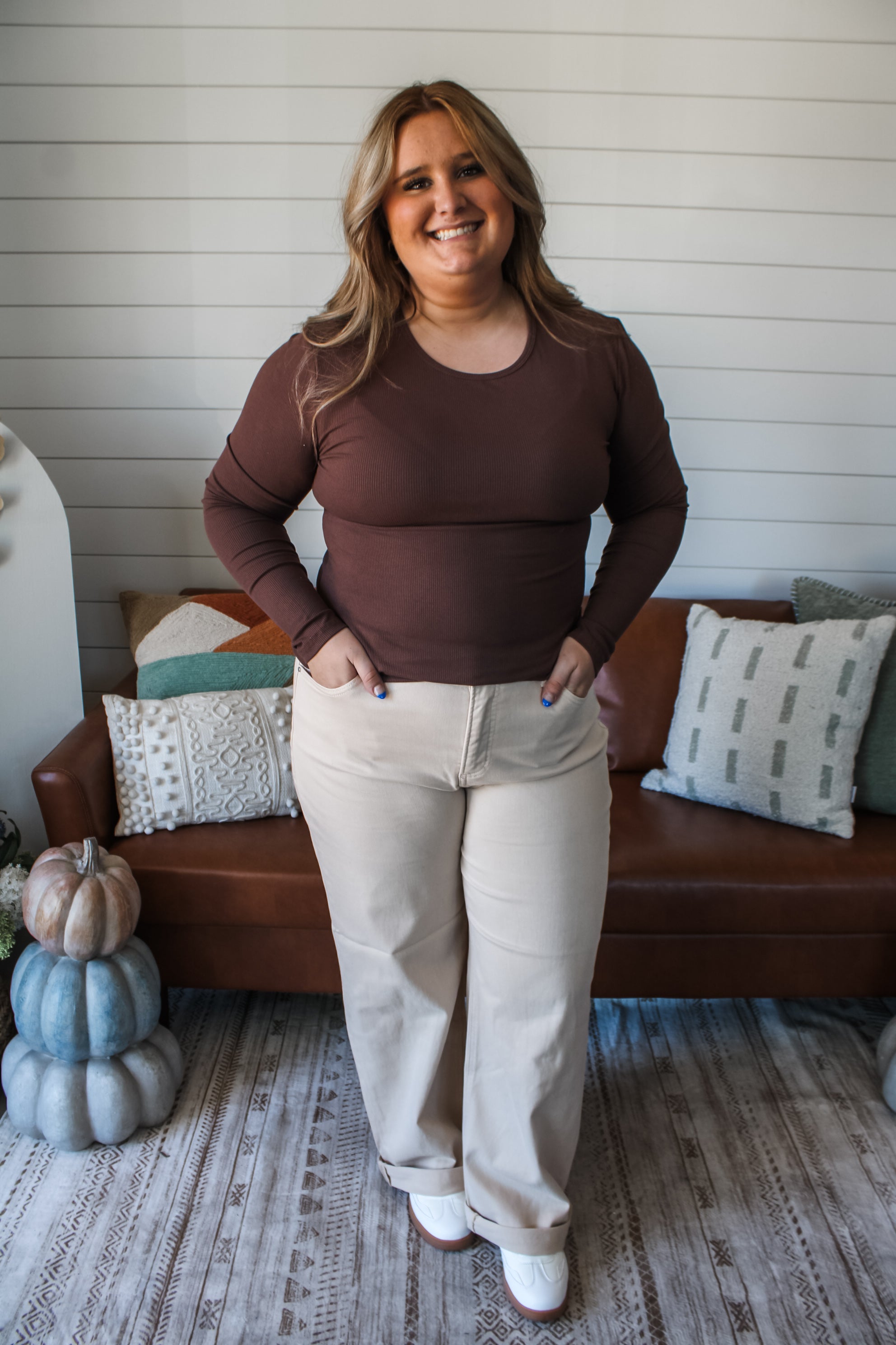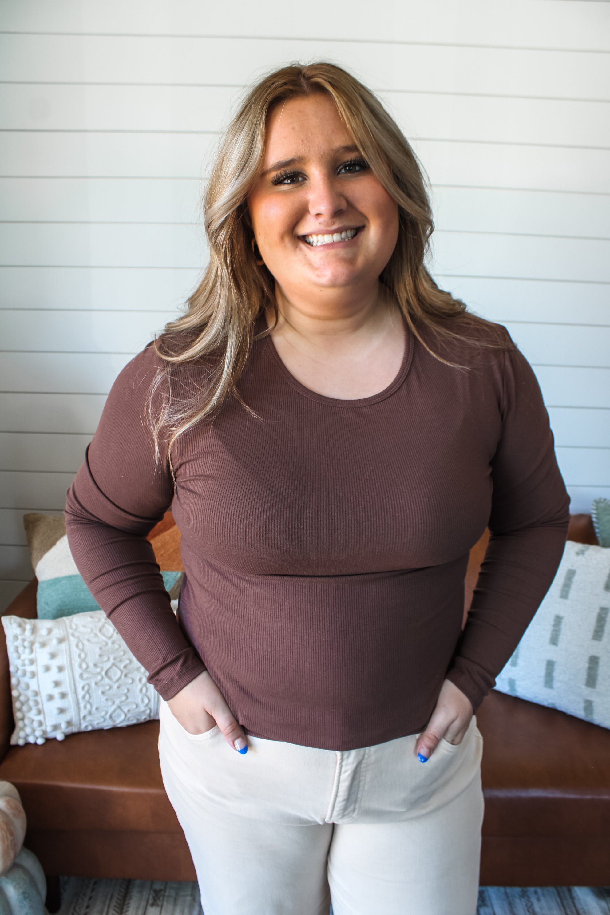 So smooth and super comfy, this wear-anywhere knit is a true must-have for every closet. Featured in stretch rib knit with a simple crewneck fit that’s perfect for tucking into jeans or layering under flannels and cardigans. In a chic espresso color, it’s truly a timeless staple for any wardrobe.