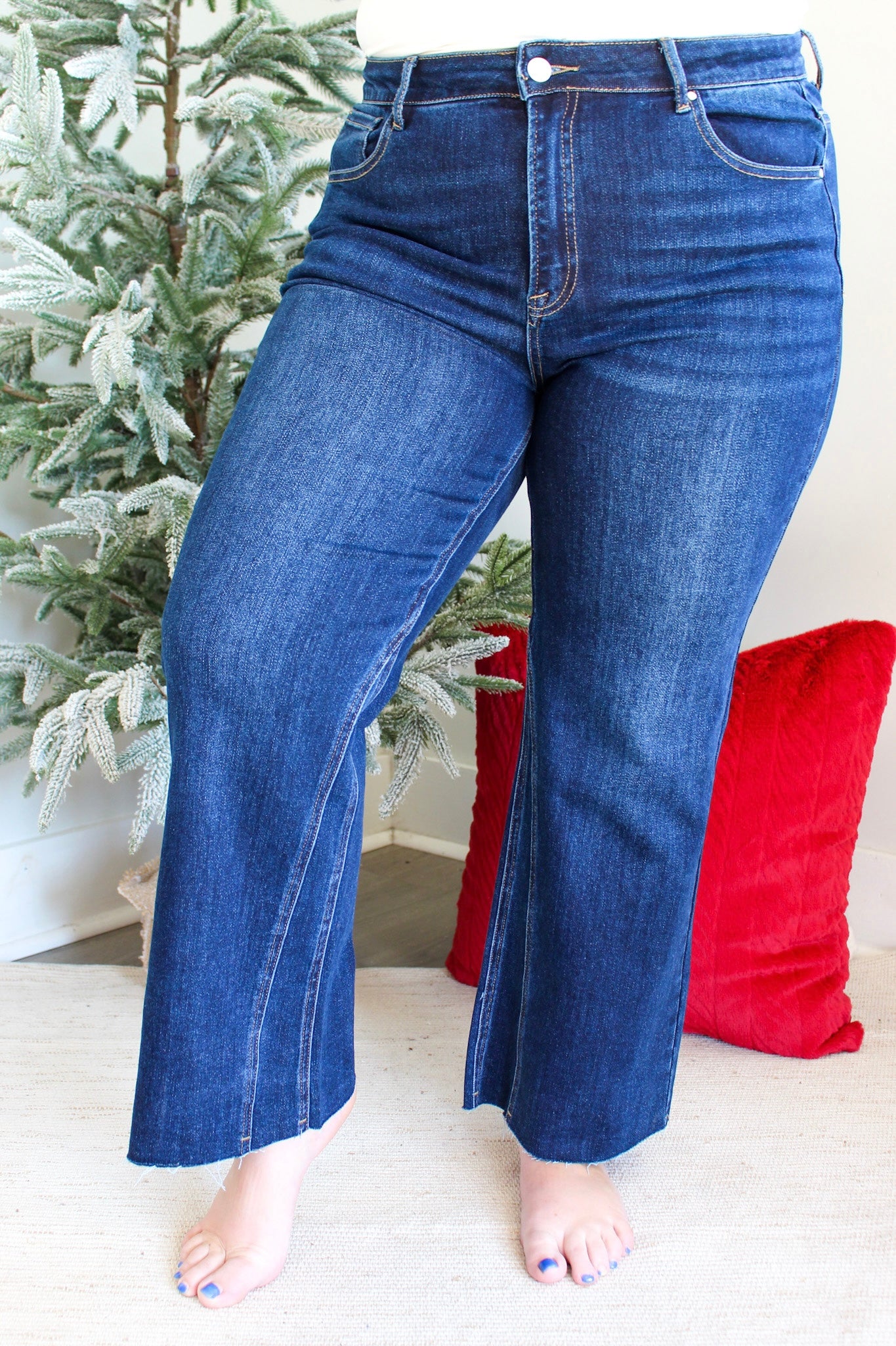 A denim classic redefined, our Lexie High Rise Jean is a sophisticated staple for every closet. Featured in a timeless dark wash denim and a flattering wide leg silhouette for a look that will never go out of style. The soft stretch, non-rip fabrication makes it easy to dress up or down, and the paneled design and raw cut hem add a modern edge. Sits above the waist with a 5-pocket design, single button front and zip fly closure. 27” inseam, Risen. 80% Cotton, 18% Polyester, 2% Spandex. Model is 5’5” and wears 1X.