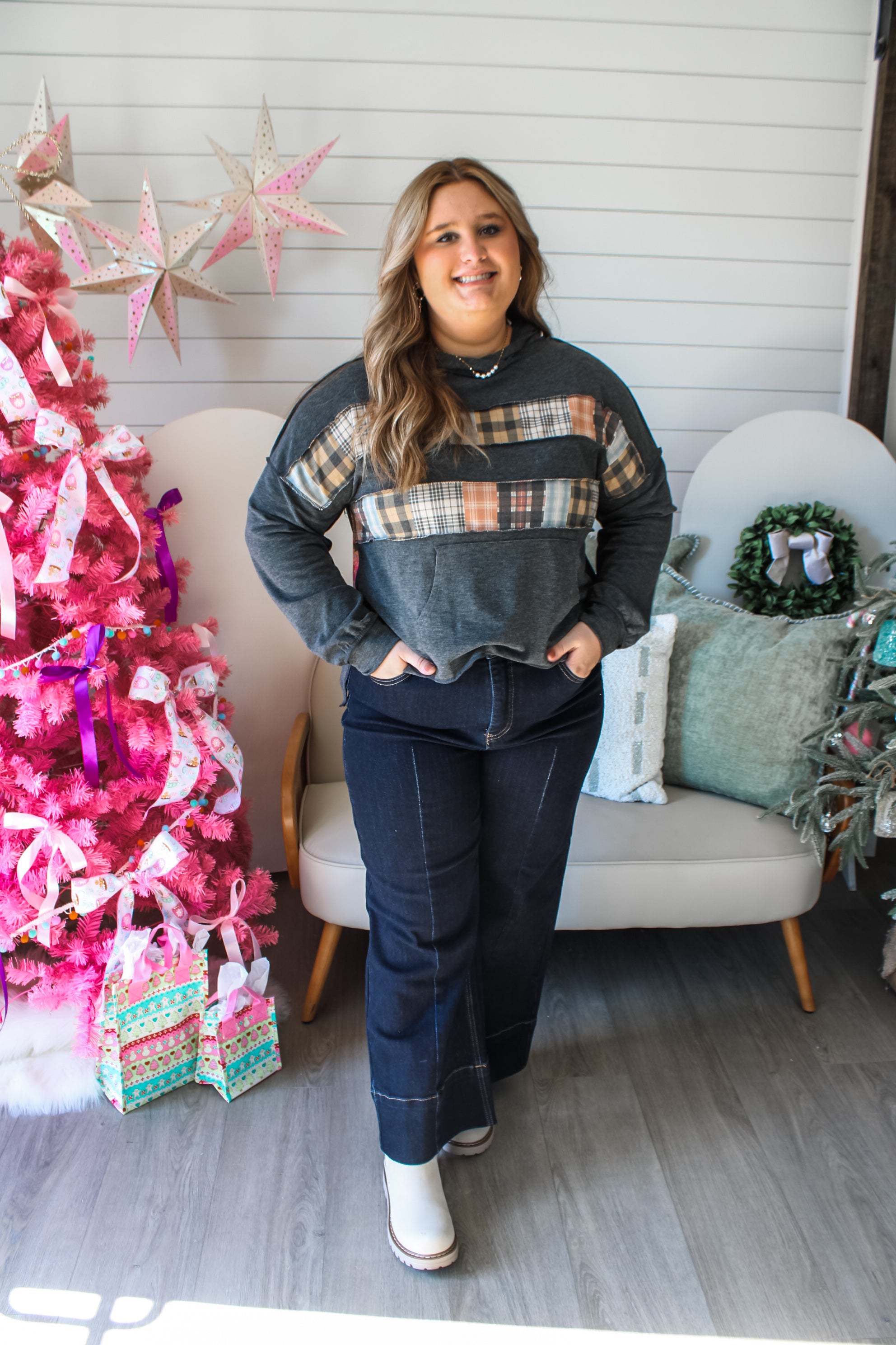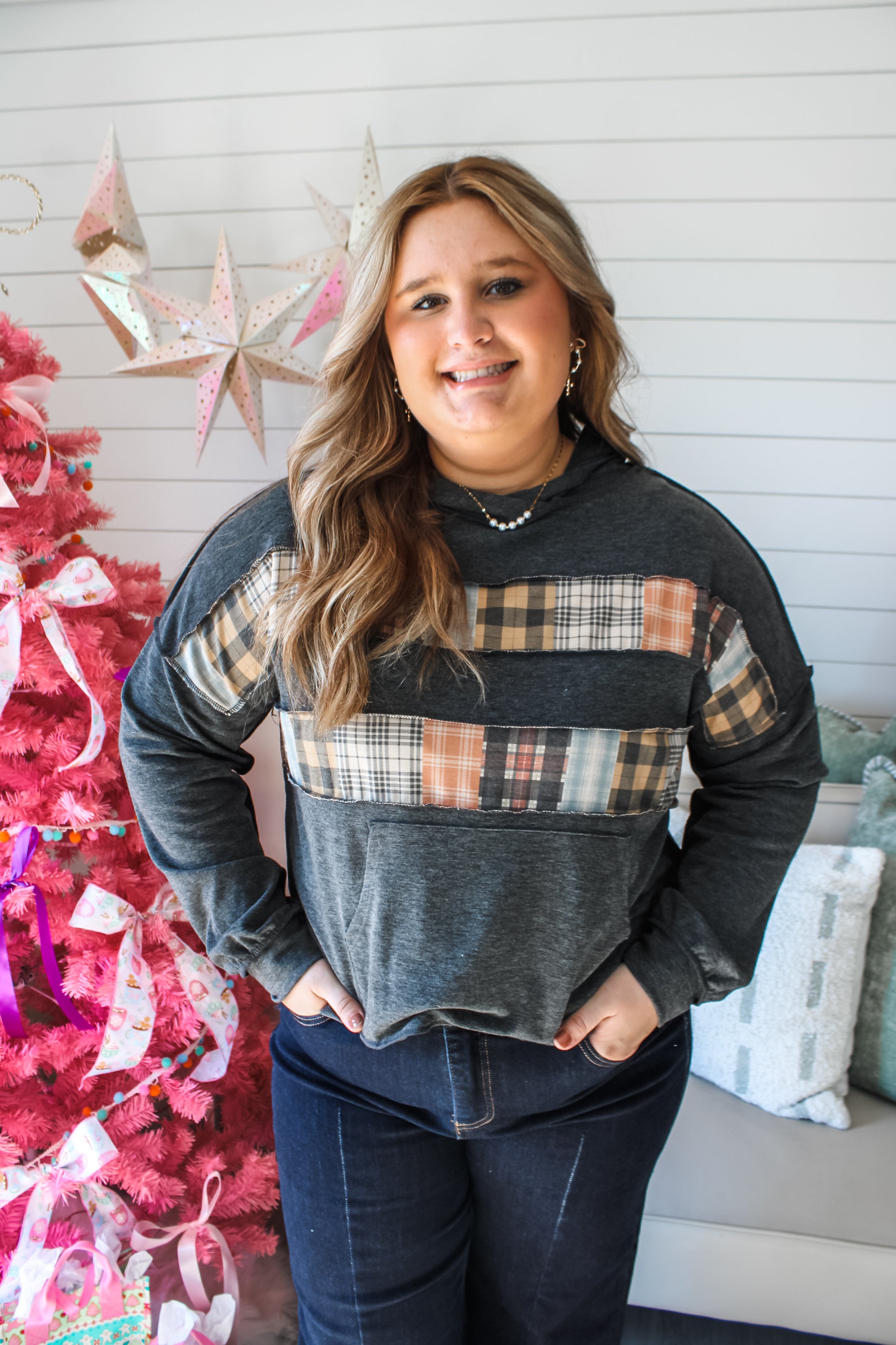 This hooded top is a playful look for weekend outings and holiday gatherings. The printed plaid design and exposed seam finishing are such eye-catching details, and the soft light knit keeps it comfy and easy. With drop shoulder sleeves, kangaroo pocket and high low hem.