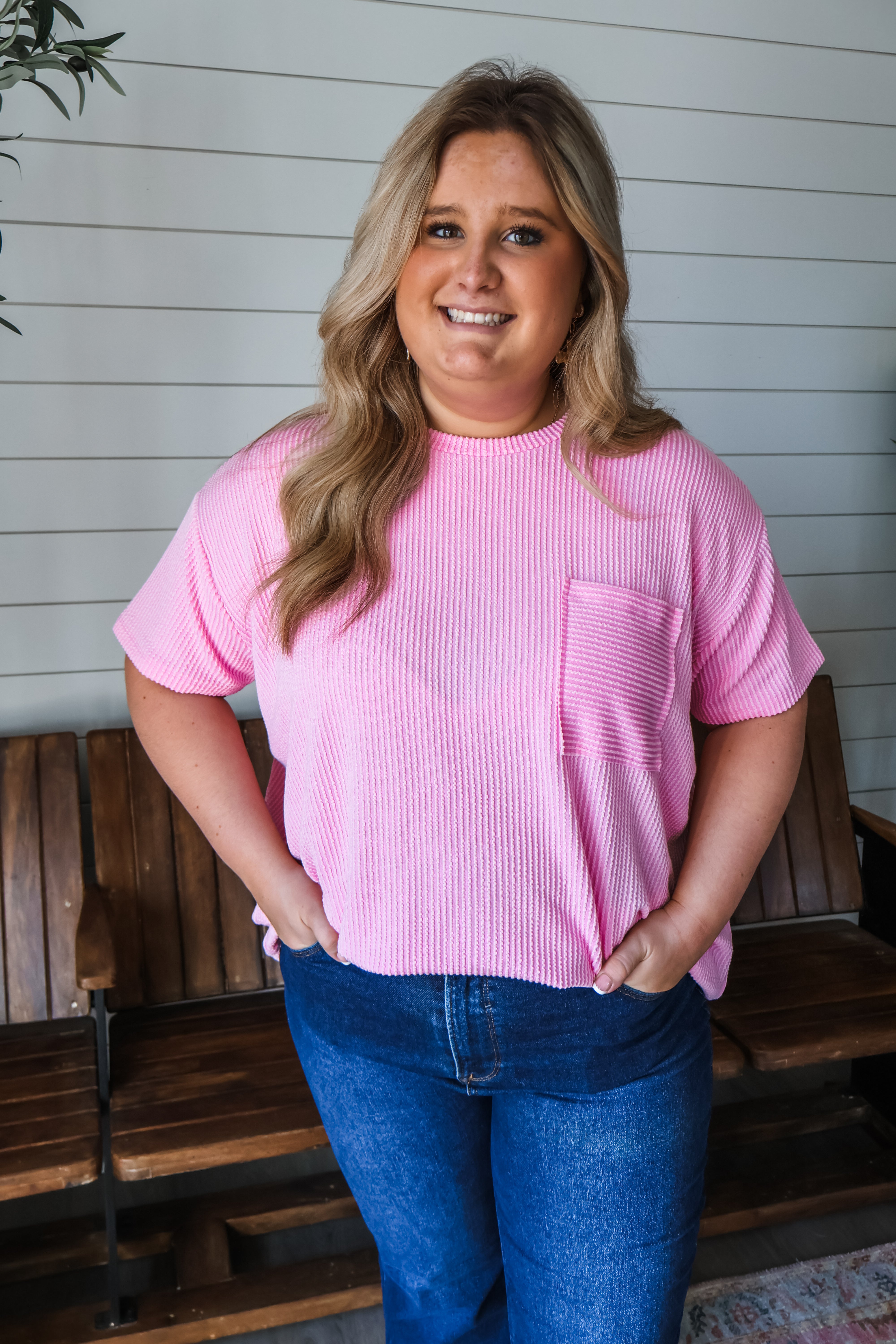 Easy and essential, this top is a need-it-now staple for every closet! The textured rib knit fabrication provides a so-soft feel as it drapes beautifully over the body, while the chest pocket adds detail and interest. Featuring a classic crewneck, drop shoulder sleeves and a breezy silhouette.