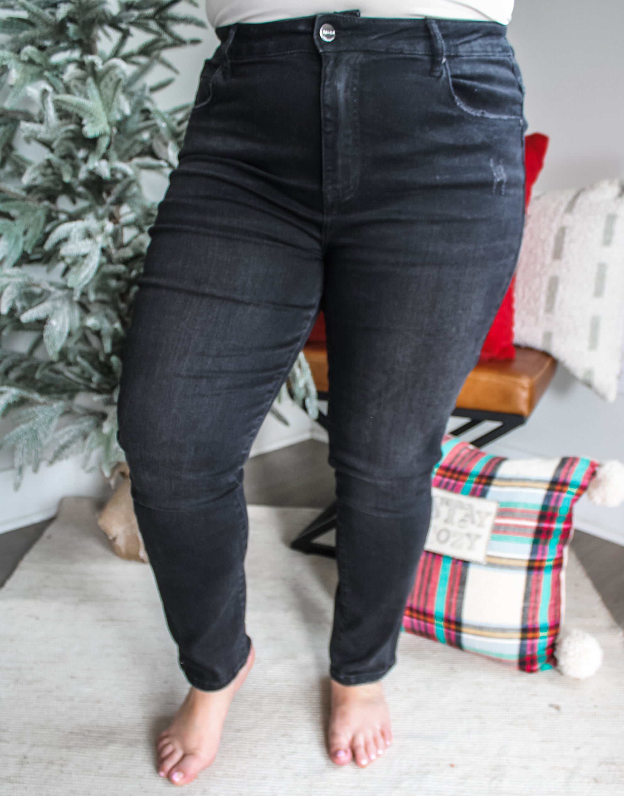 Size + fit: With a high rise fit, 5-pocket design, single button front and zip fly closure. 28” inseam, Risen. 64.3% Cotton, 22% Polyester, 11.9% Viscose, 1.8% Lycra. Model is 5’6” and is wearing 1X.