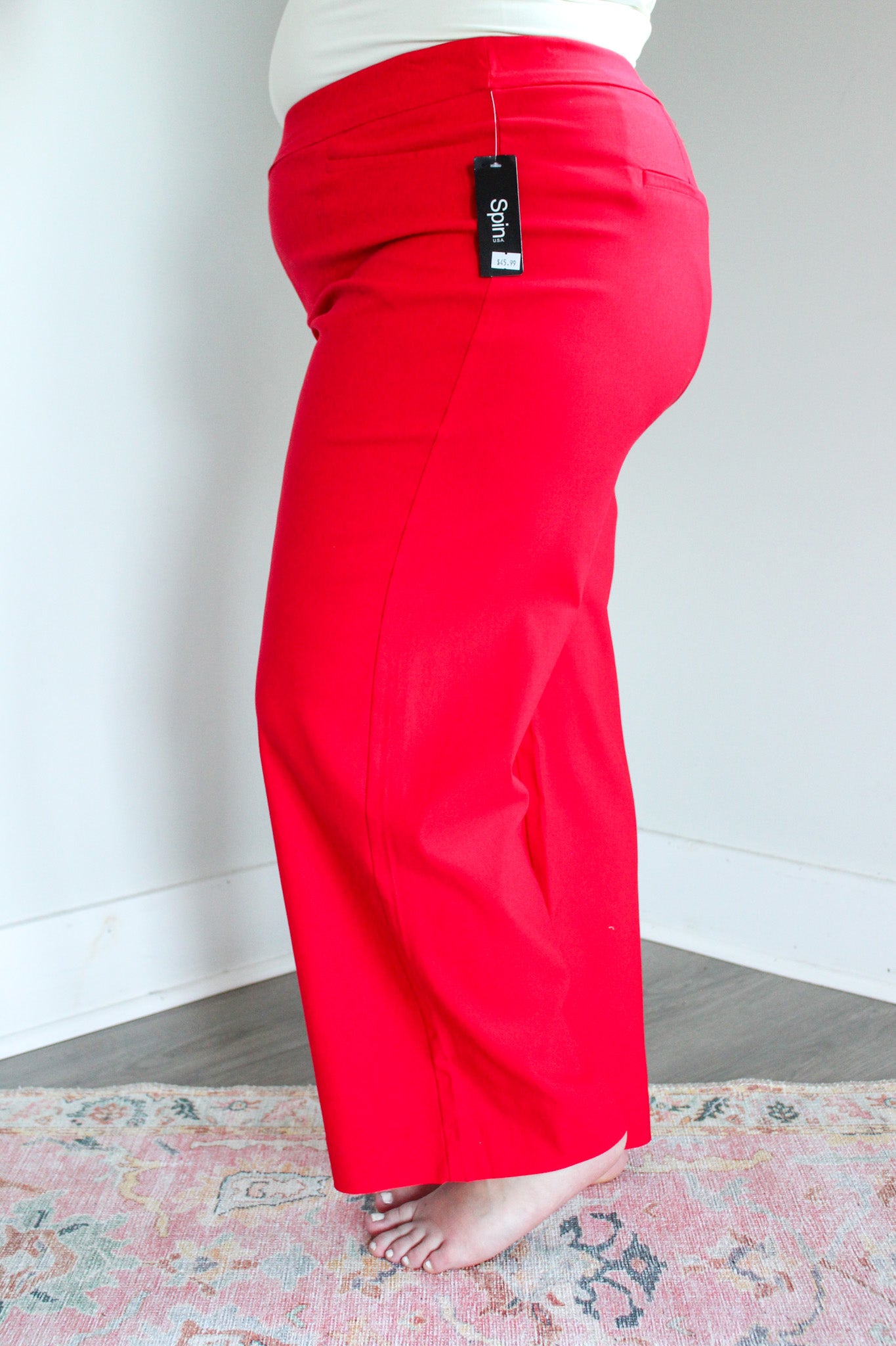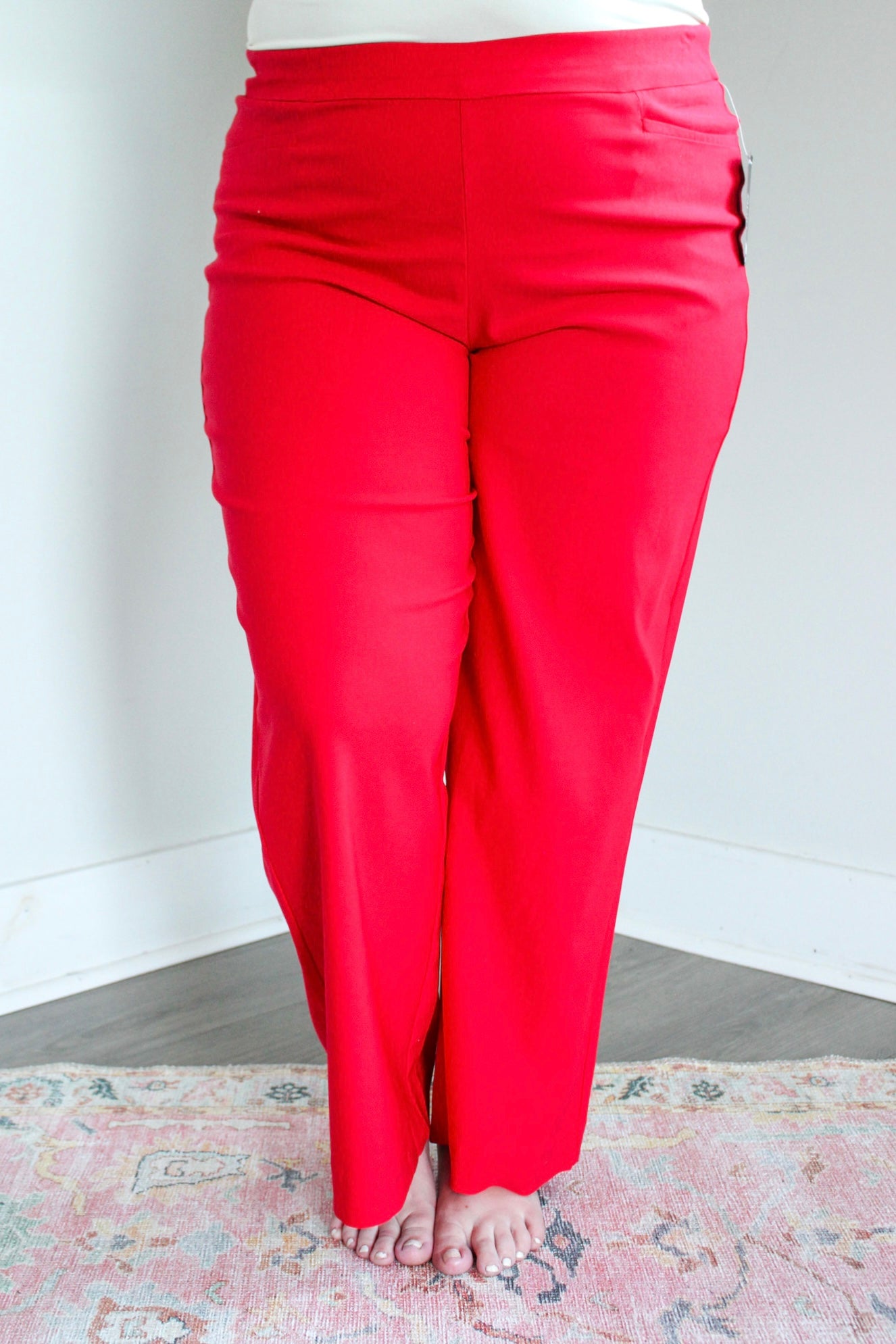 So striking in red, these pants are a tried and true wardrobe classic. Fabricated in a smooth bi-stretch knit, with a simple and flattering wide leg silhouette for a versatile pair you can dress up or down all year round. Featuring a high rise fit with a stretch band waist, hand pockets and a finished hem.