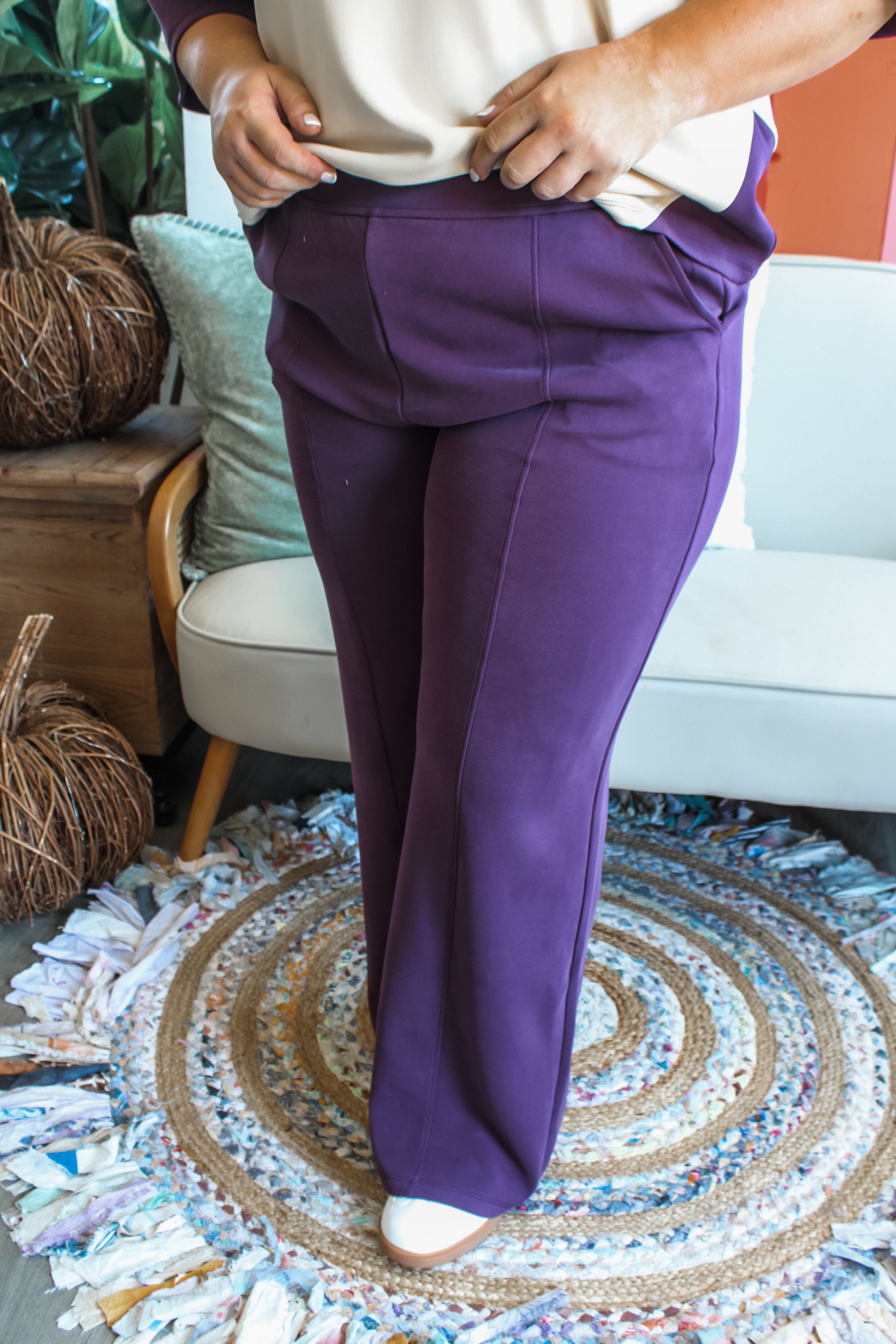 Buttery soft and sleek in a scuba stretch knit fabrication, this pair is an easy everyday go-to! It’s a super comfortable essential featuring a stretch band waist, front seaming detail, hand pockets and wide leg fit.