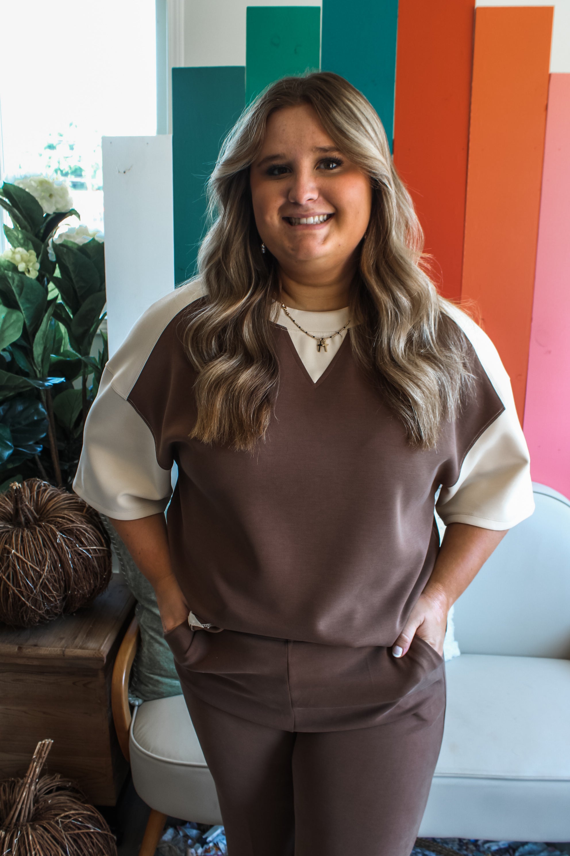 Buttery soft and sleek in a scuba stretch knit fabrication, this top is an easy everyday go-to! It’s a modern essential featuring a two-tone colorblock design, with a crewneck, v-notch detail, drop shoulder sleeves and a loose silhouette.