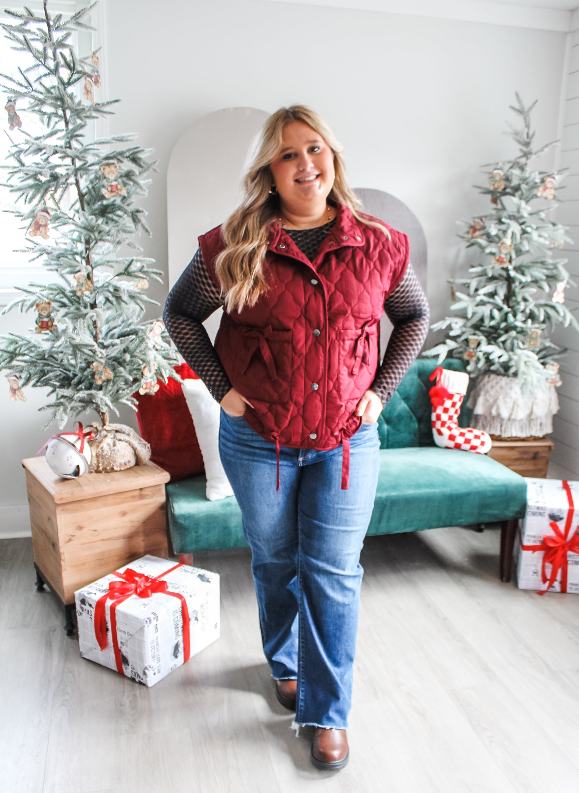 Elevate your wardrobe with effortless layers and cozy charm. Crafted from a quilted fabrication, this classic vest gets a trendy update with bow tie details and an adjustable drawstring hem. Featuring a standing collar, snap button front, double patch pockets and a relaxed fit for style and layering.