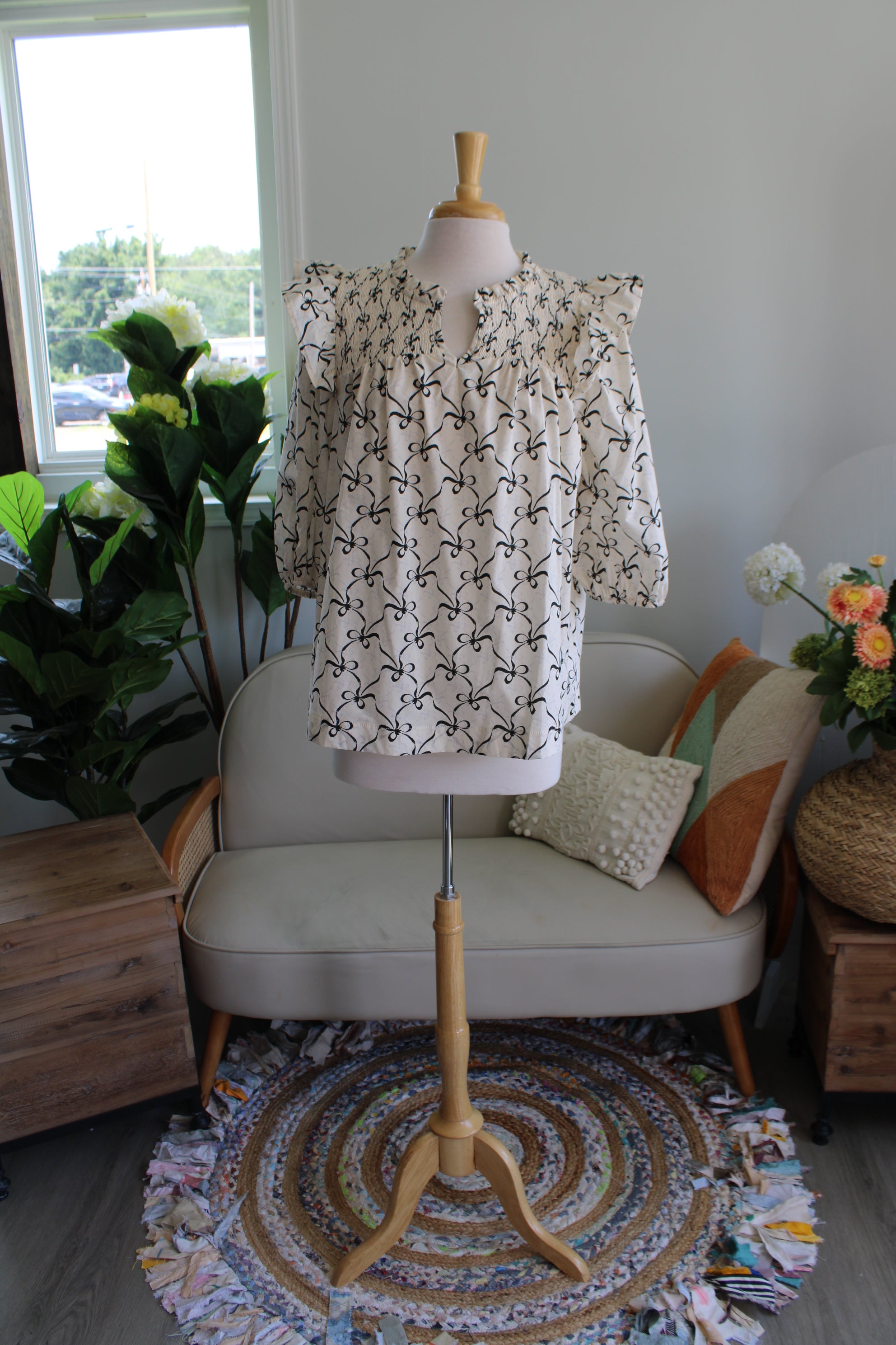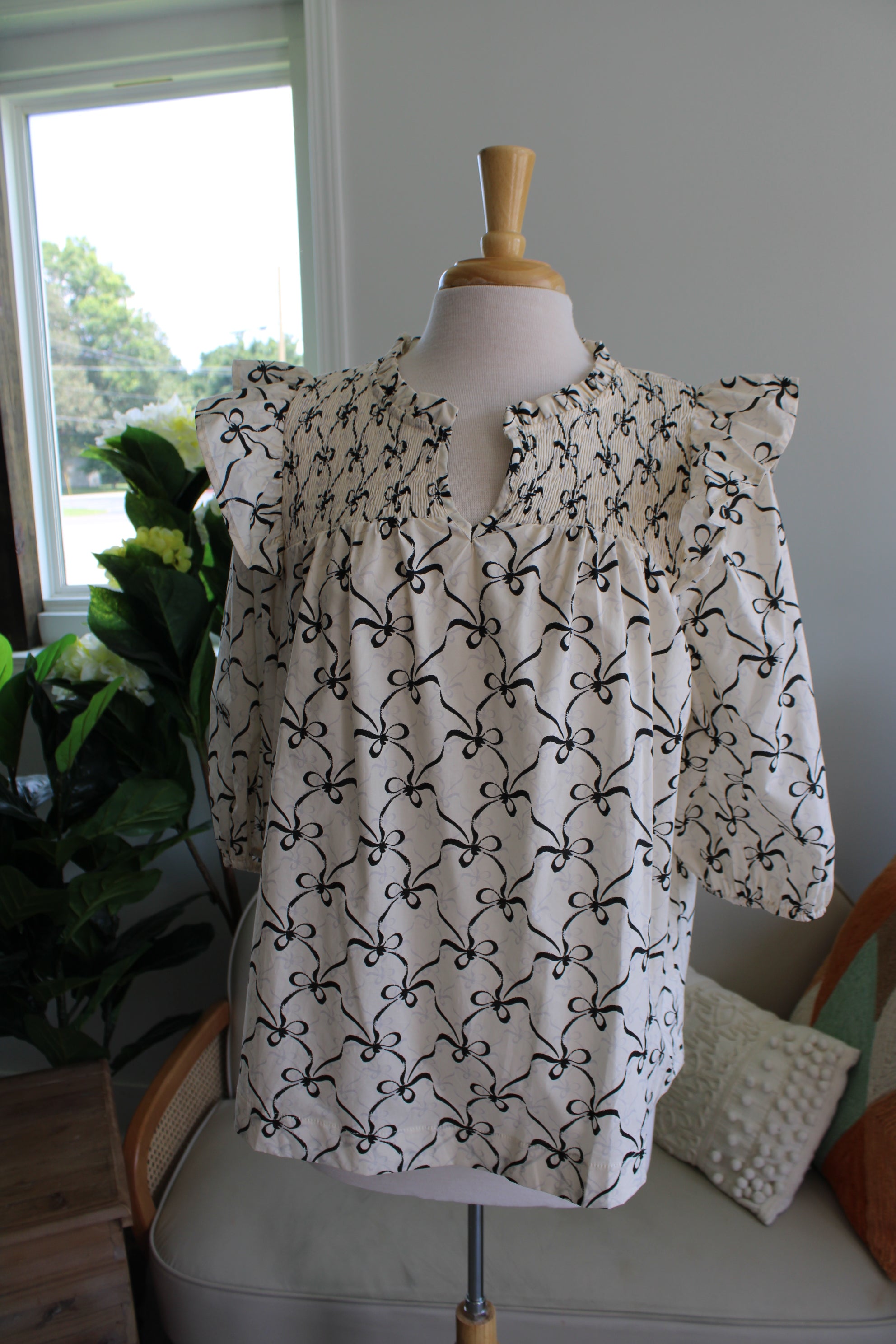 Perfectly printed in trendy bows, this top is a polished look you can dress up or down for any season. Fabricated in a lightweight woven and featuring a notched neckline with smocking design, ruffle trim details, 3/4 length puff sleeves and a flowy silhouette.