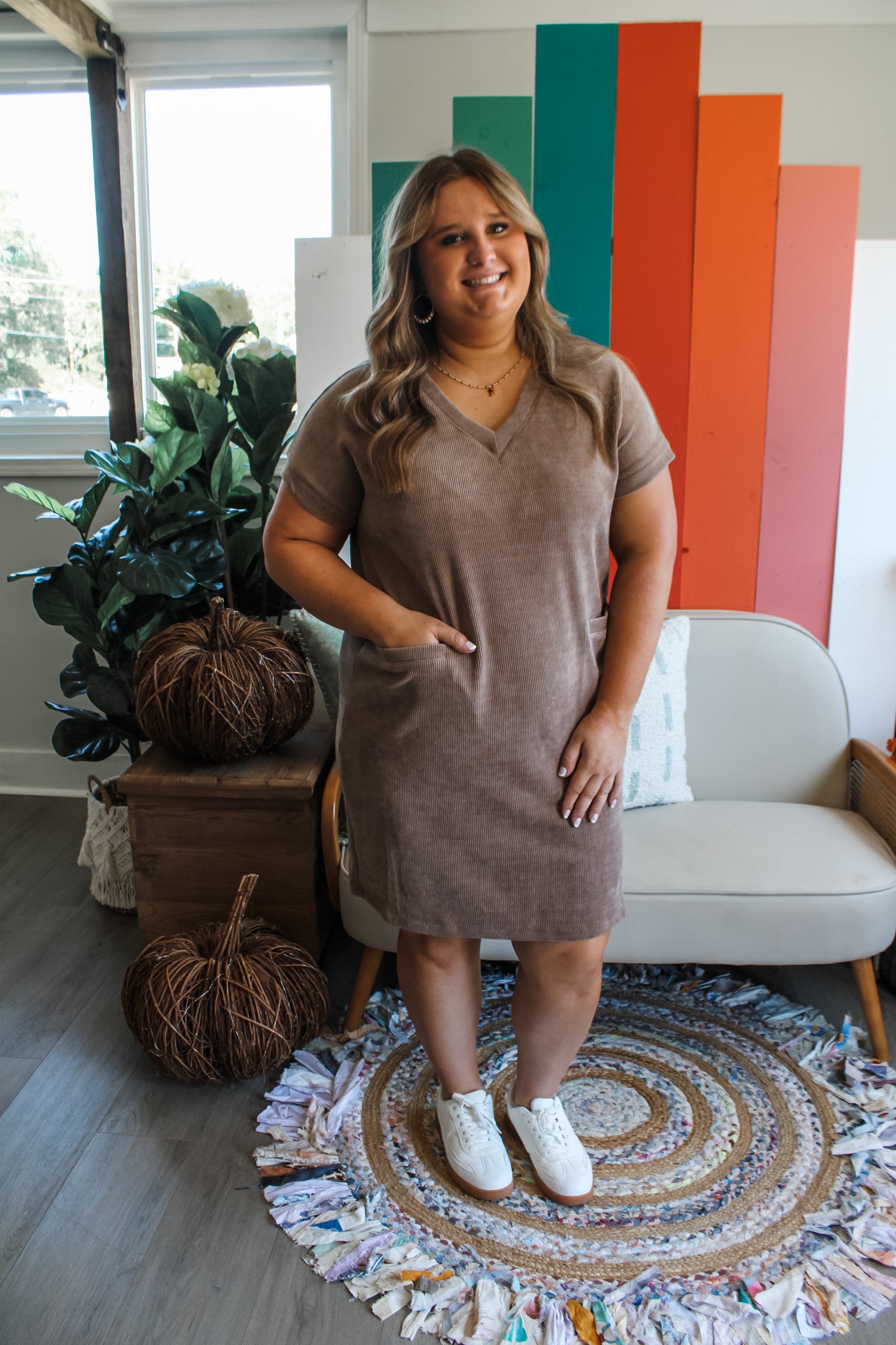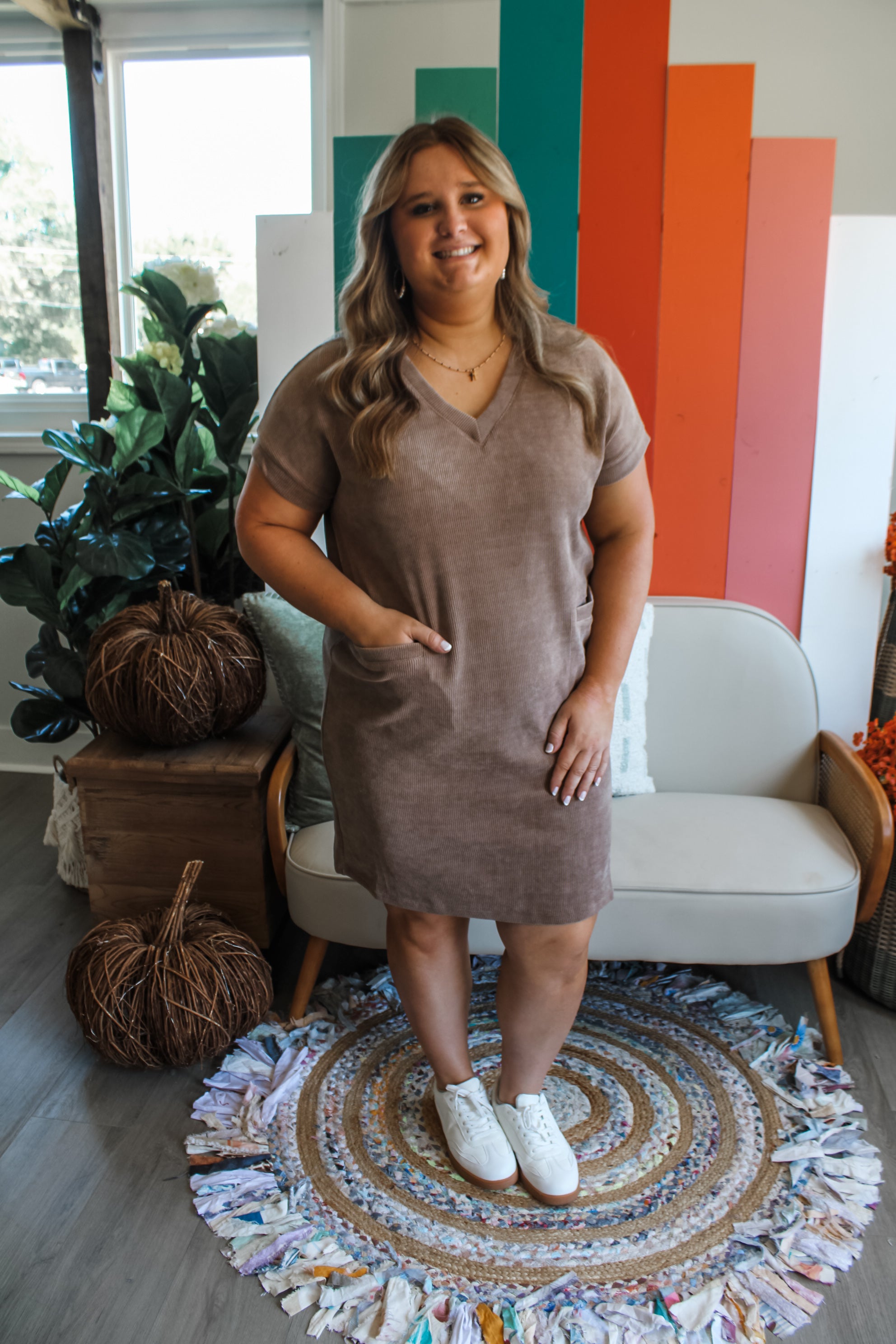 So easy and comfortable, this pocket dress will be your new style favorite! Featured in a velvety chenille fabrication, this chic staple is a truly effortless look whether you’re going out of town, running errands or attending fall events! In a relaxed straight silhouette with a v neckline, dolman sleeves and oh-so-essential front slit pockets.