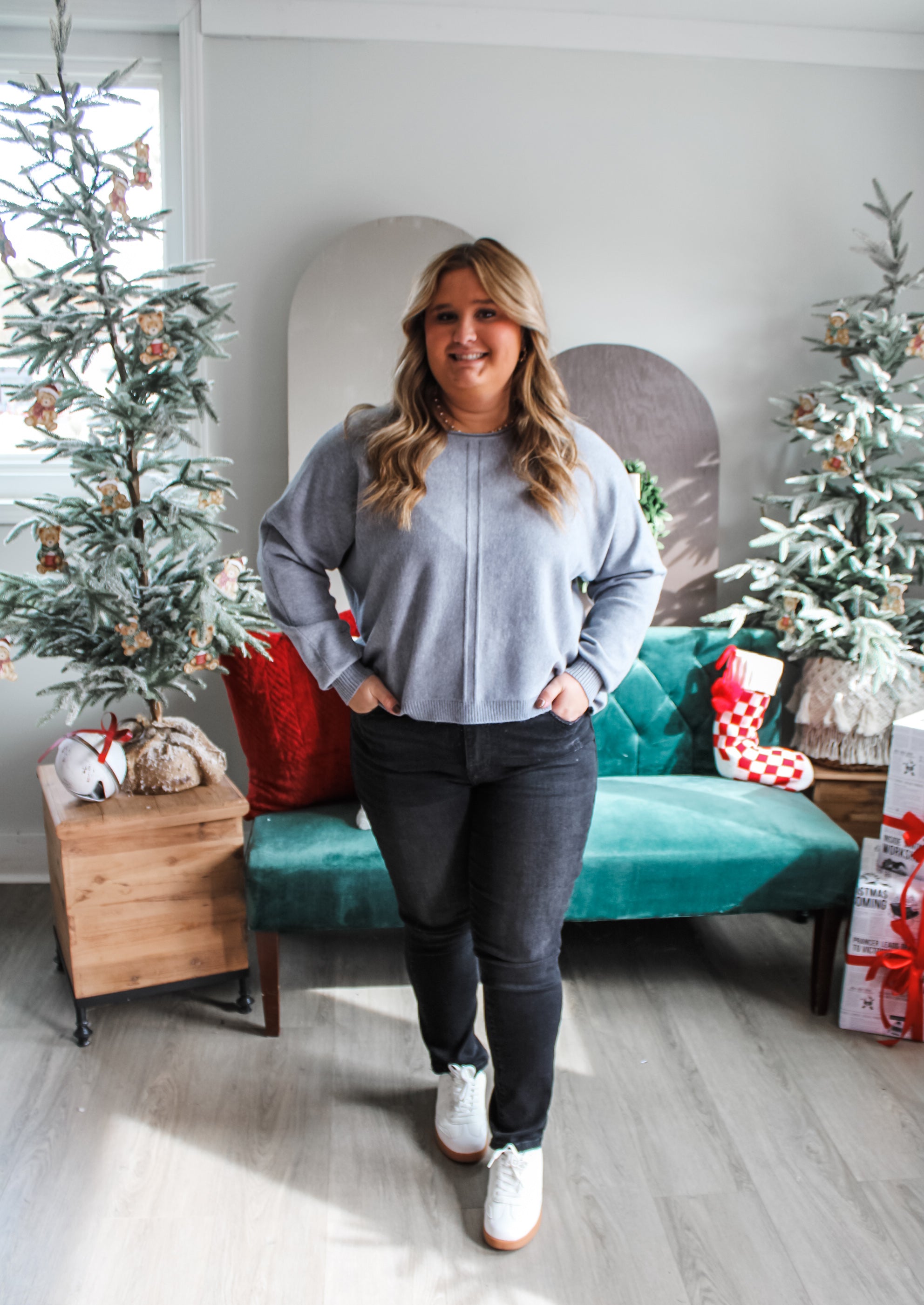 Size + fit: Runs true to size. 1X 14-16, 2X 16-18, 3X 18-20. 50% Viscose, 28% Nylon, 22% Polyester. Model is 5’5” and wears 1X.