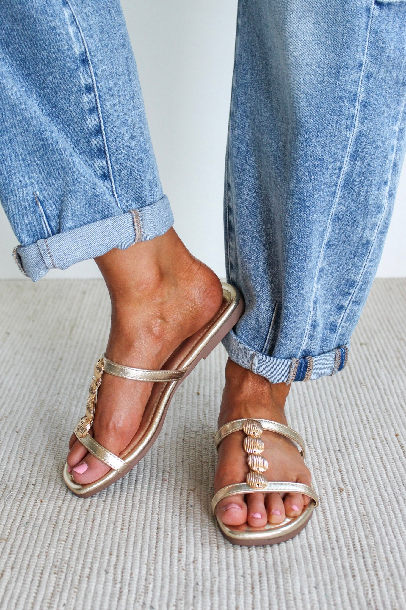 So coastal and chic, our Ariel Sandal will add shine and sophistication to any outfit. These day to night slide-ons feature double straps with gold seashell embellishments. A spring must-have that can elevate even the most casual of looks, we are wearing these open toe stunners with everything from cut off shorts to maxi dresses.