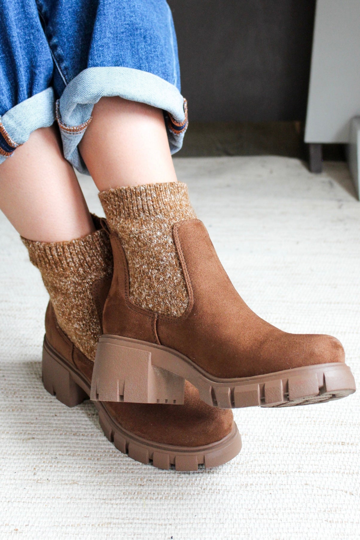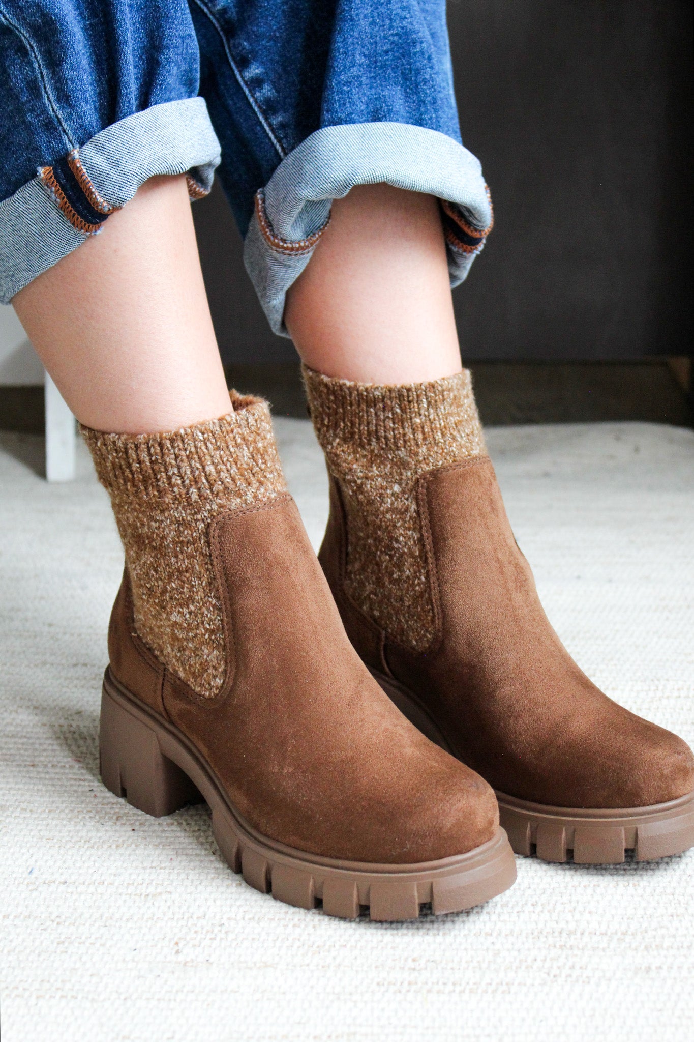 Meet the Aspen Chelsea Boot — a wardrobe staple that’s truly cozy and chic with its rib knit contrast design. Featuring a round toe silhouette and beautiful faux suede upper for a classic look with a chunky lug sole that’s trendy and comfortable. The stretch elastic gore and pull tab provides an easy on/off design. Wear it with denim, cargo pants, skirts or dresses… the styling options are endless.