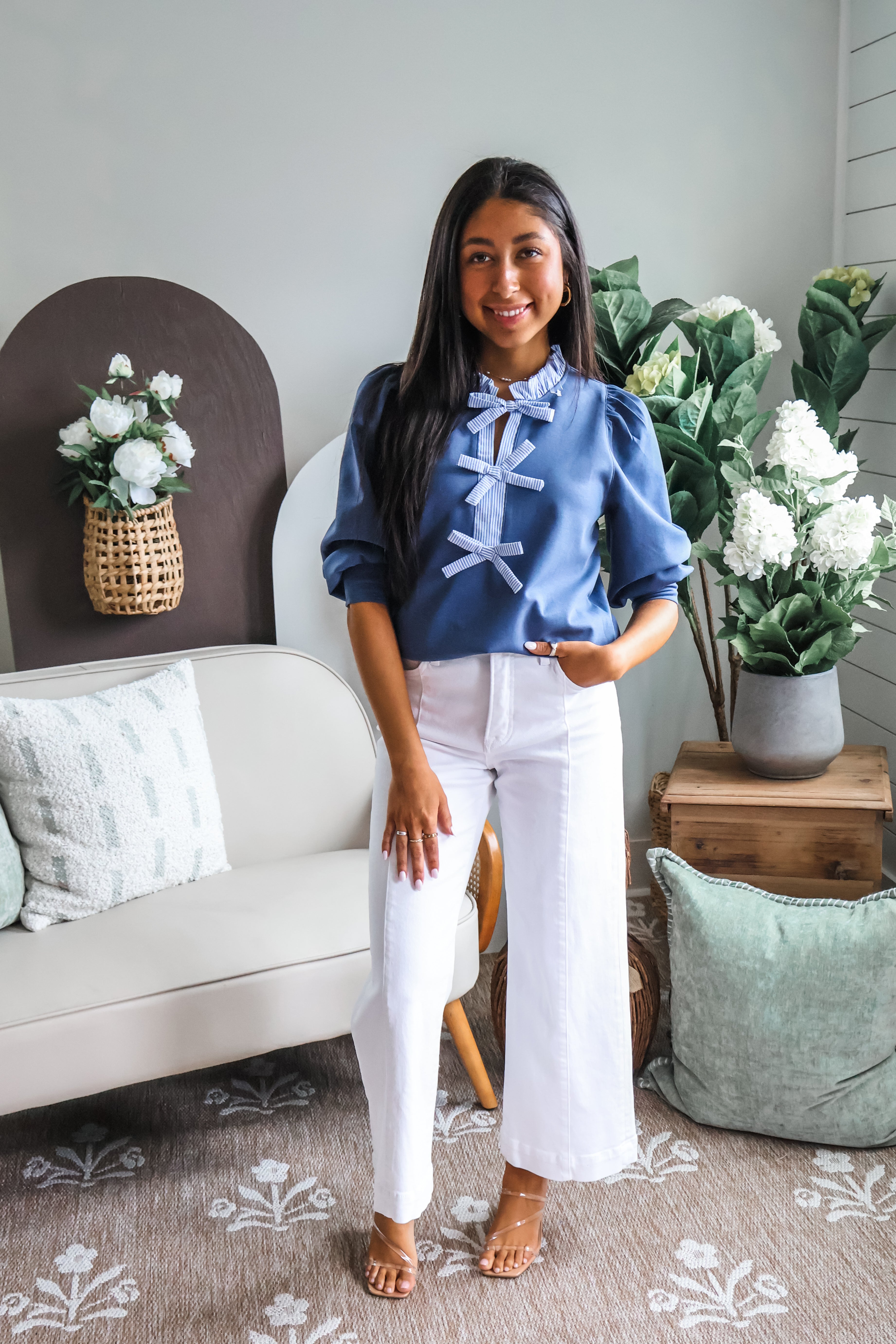 Step into the season with bows and stripes! This top features playful puff sleeves and an eye-catching bow front for a sophisticated style you can easily dress up or down. Crafted from a smooth knit fabrication with a ruffle trim neckline, striped contrast design and a relaxed silhouette. It’s a cheerful yet polished look that perfectly encapsulates spring!