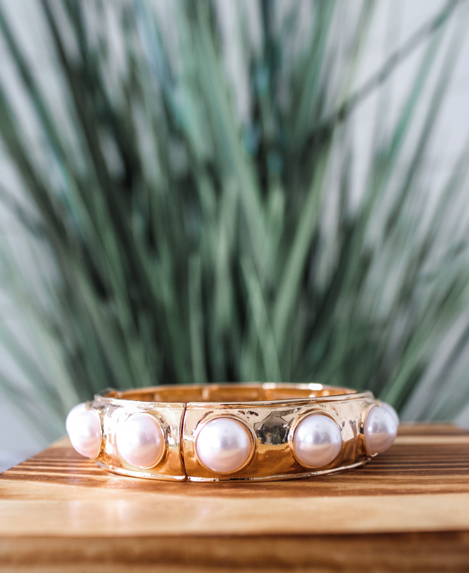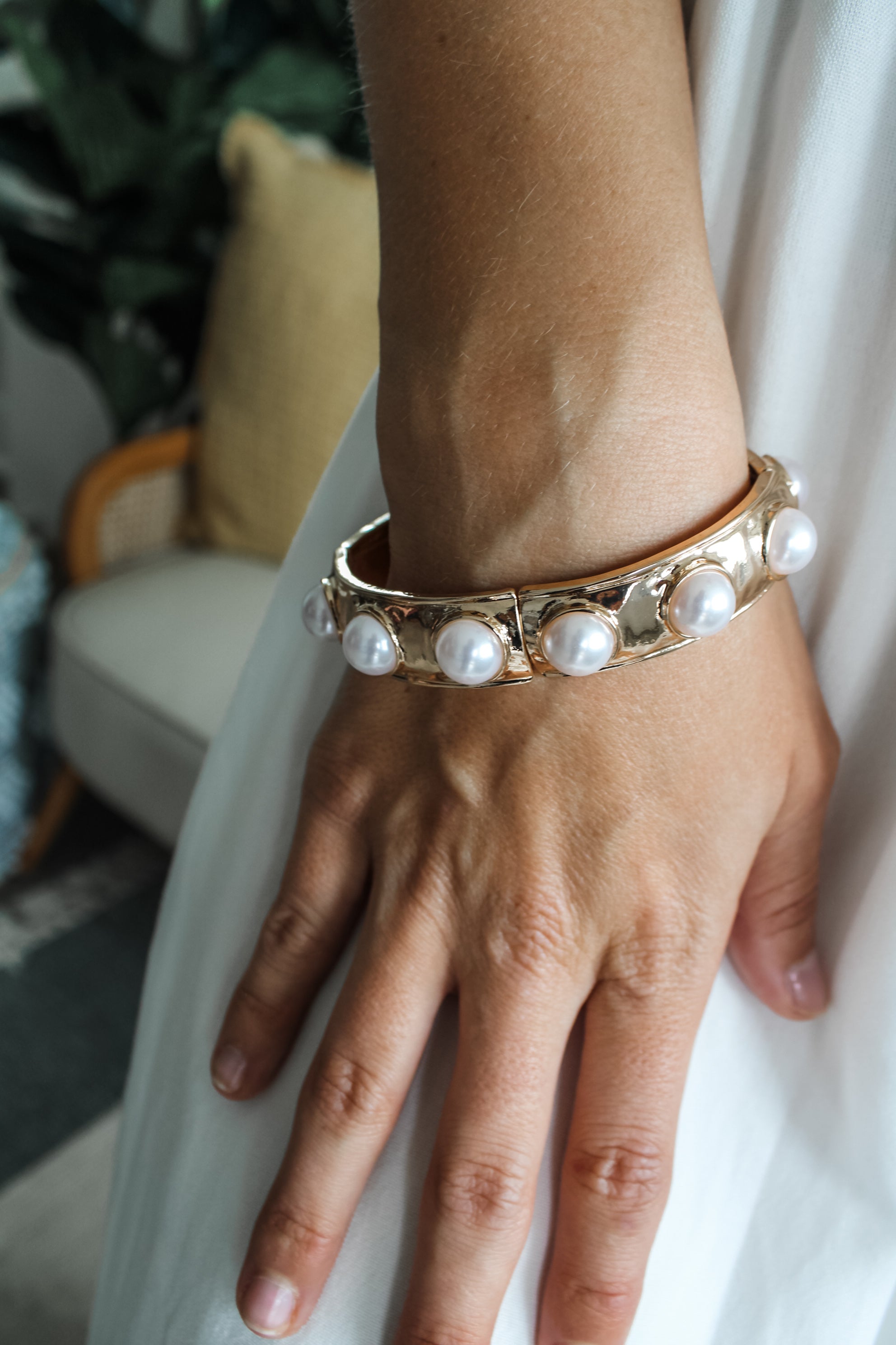 Elevate any look with this bold bangle bracelet! Featured in a hammered metal material with pearl accents and stretch fit for easy on/off. Materials may have natural variations. Colors may vary from different viewing devices and lighting. Final sale item.