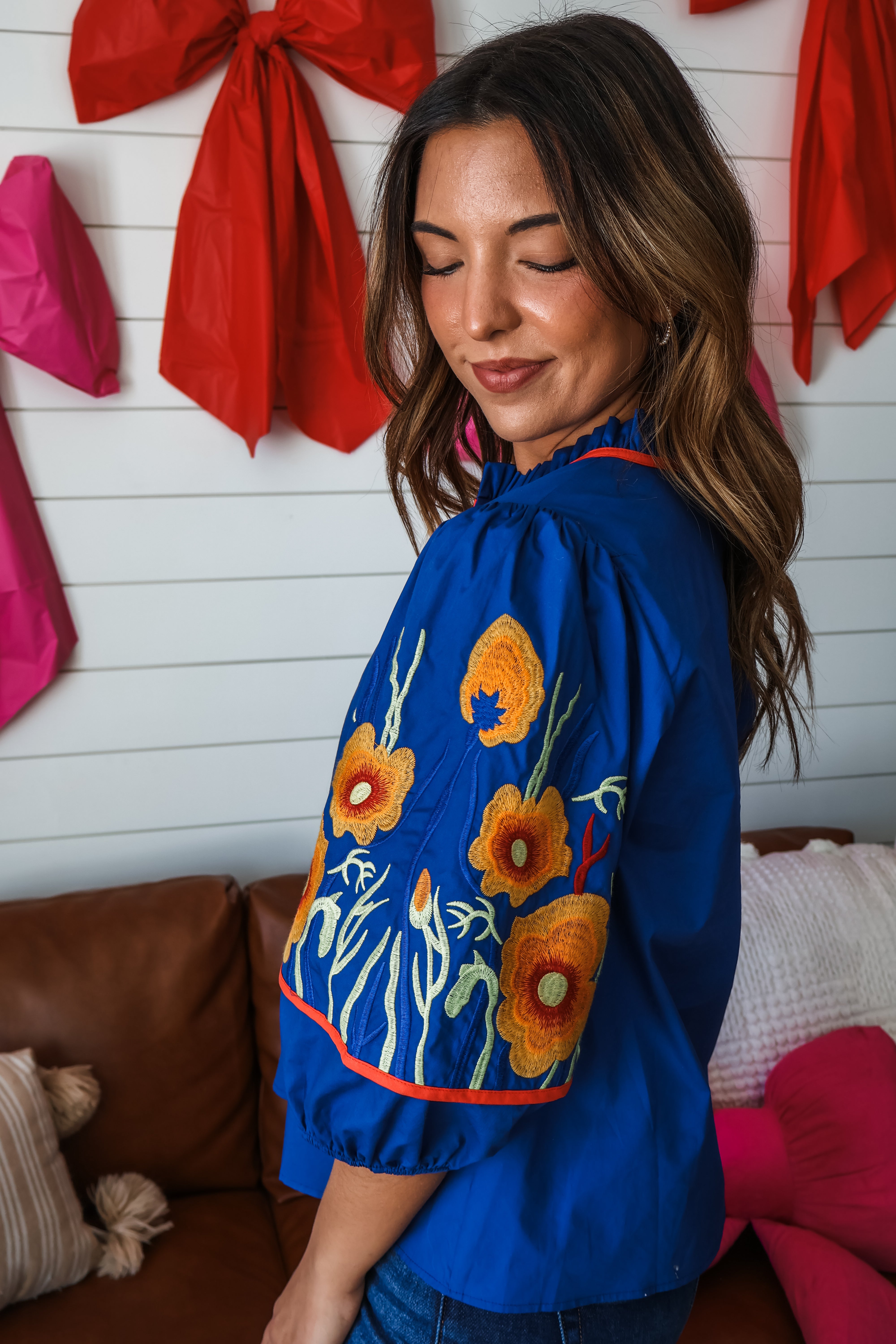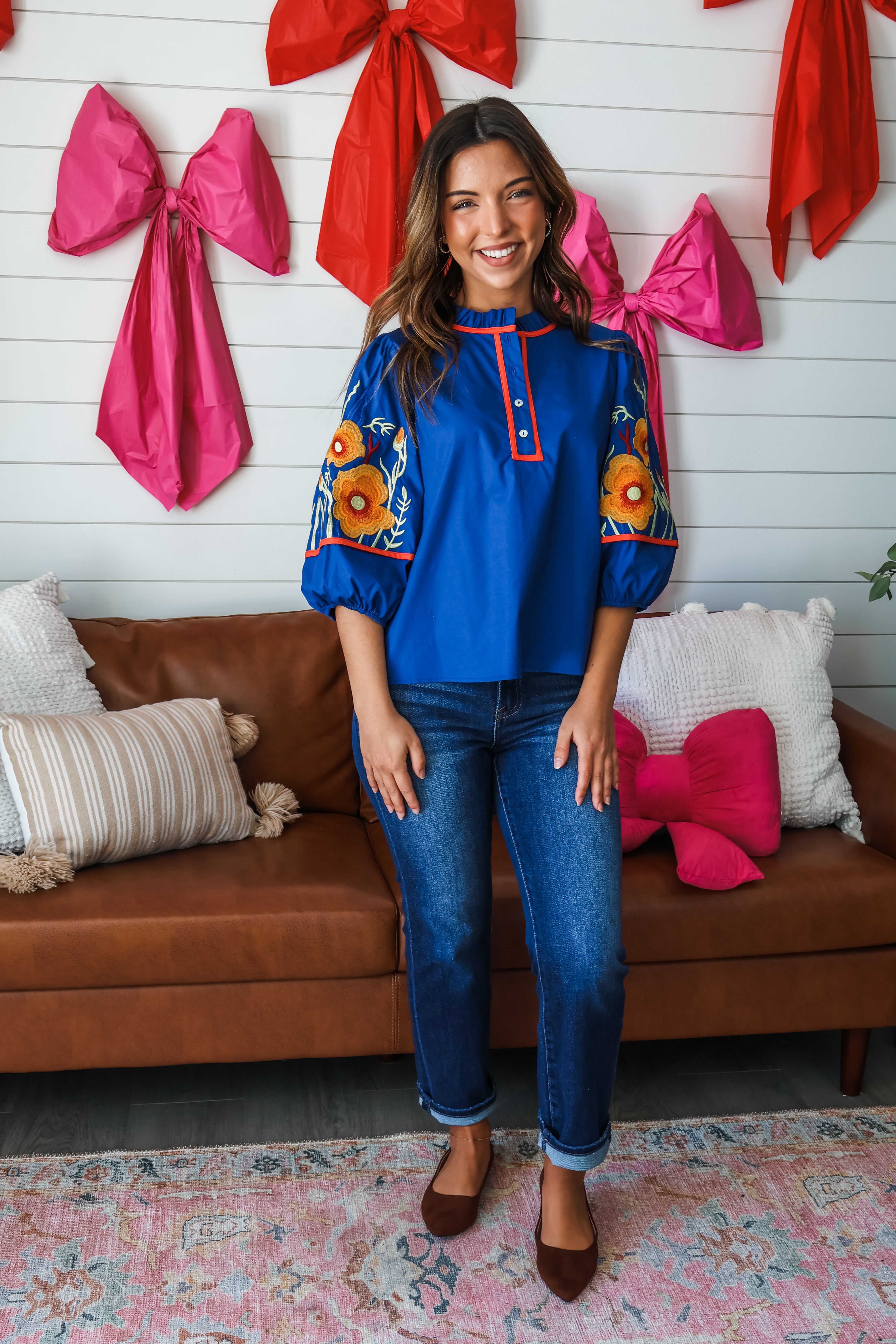 Statement-making florals and feminine silhouettes to refresh your wardrobe. This blouse features striking floral embroidery and piping trim detailing for a sophisticated look that stands out! The billowy puff sleeves give it a dramatic flair, while the flowy silhouette provides an effortless fit. Crafted from a lightweight cotton woven with a ruffle trim button up neckline.